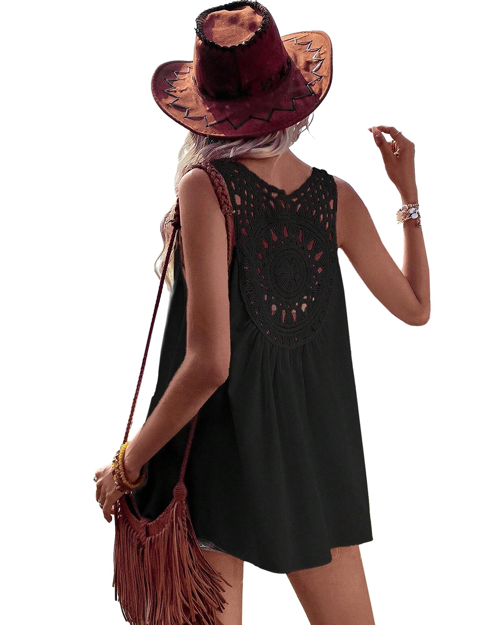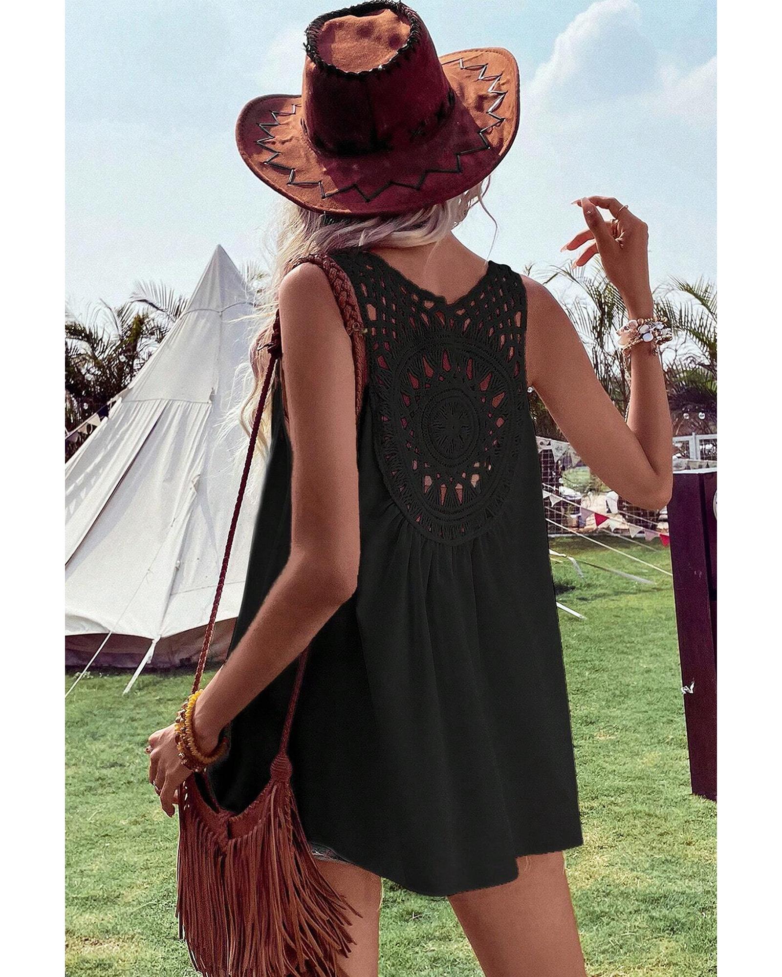 • Black Bohemian Crochet Patchwork Sleeveless Tunic