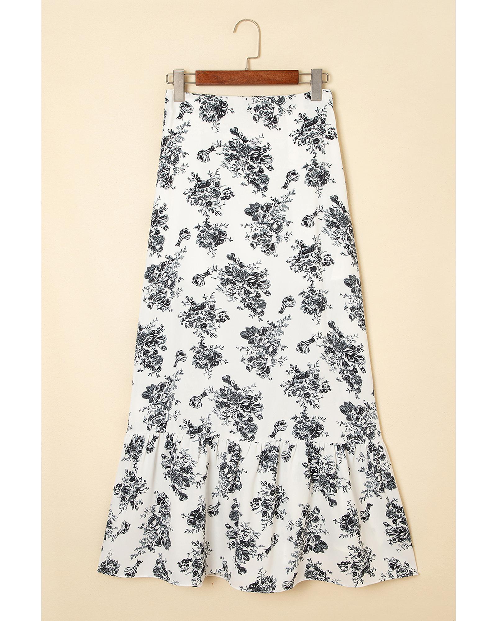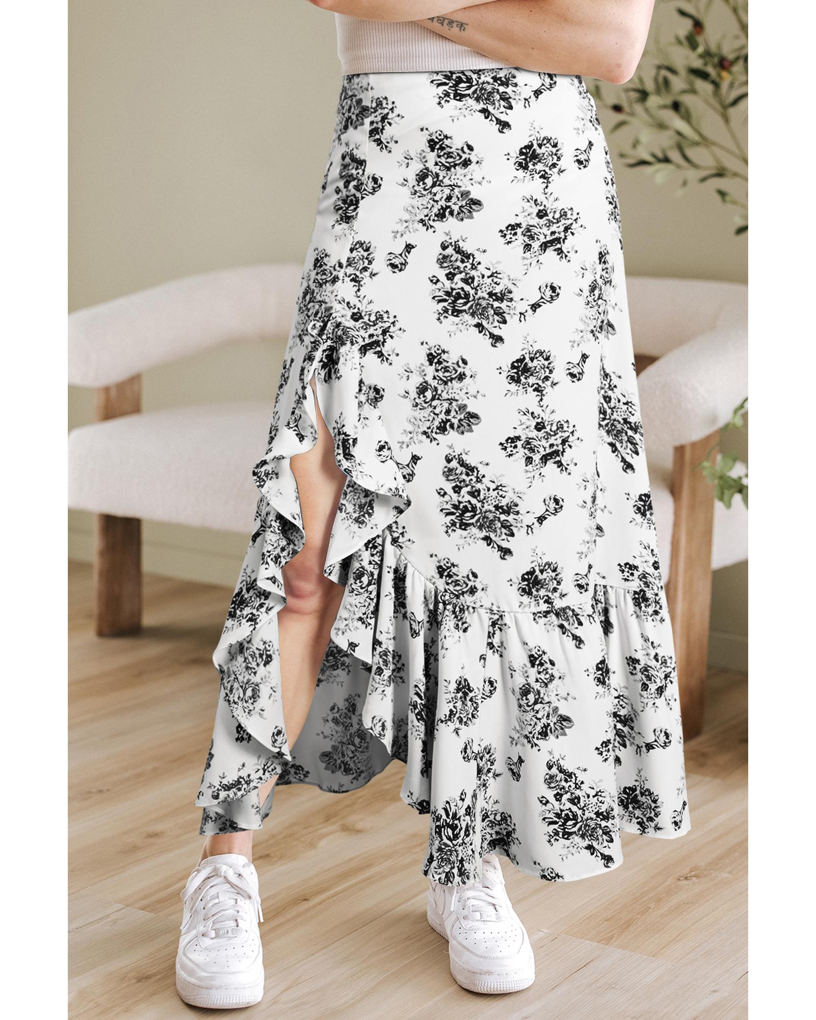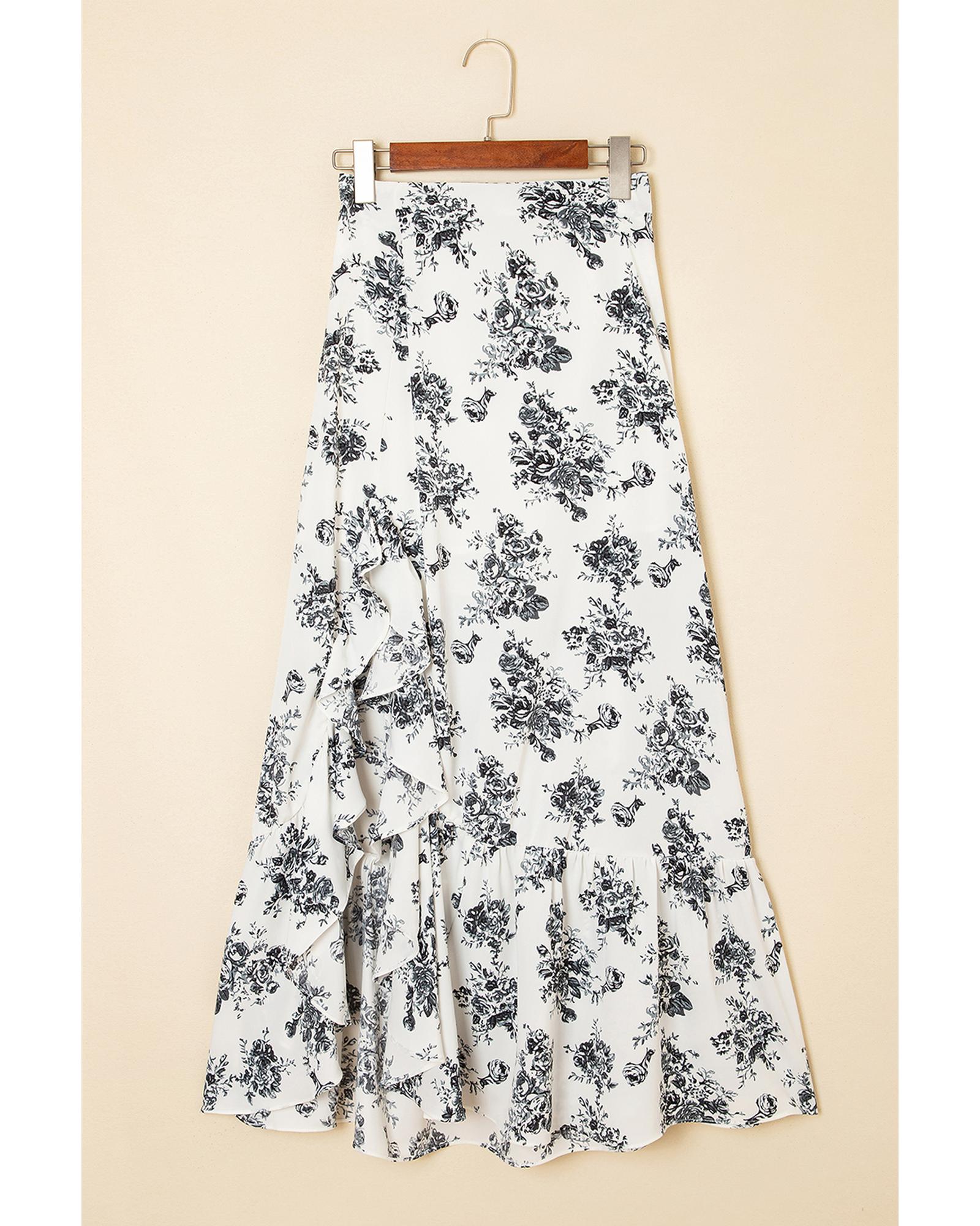 Black Boho Floral High Waist Ruffle Split Maxi Skirt – L