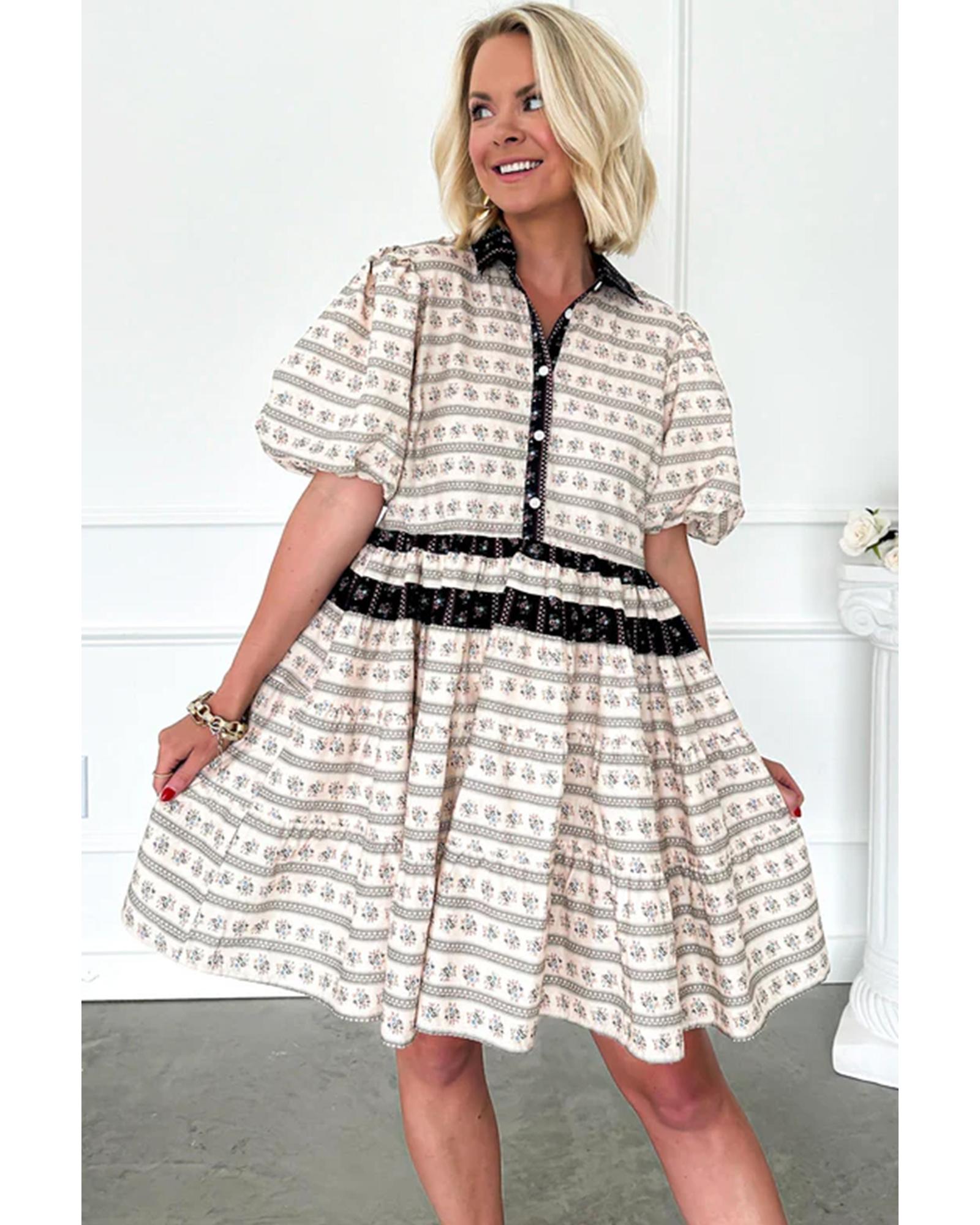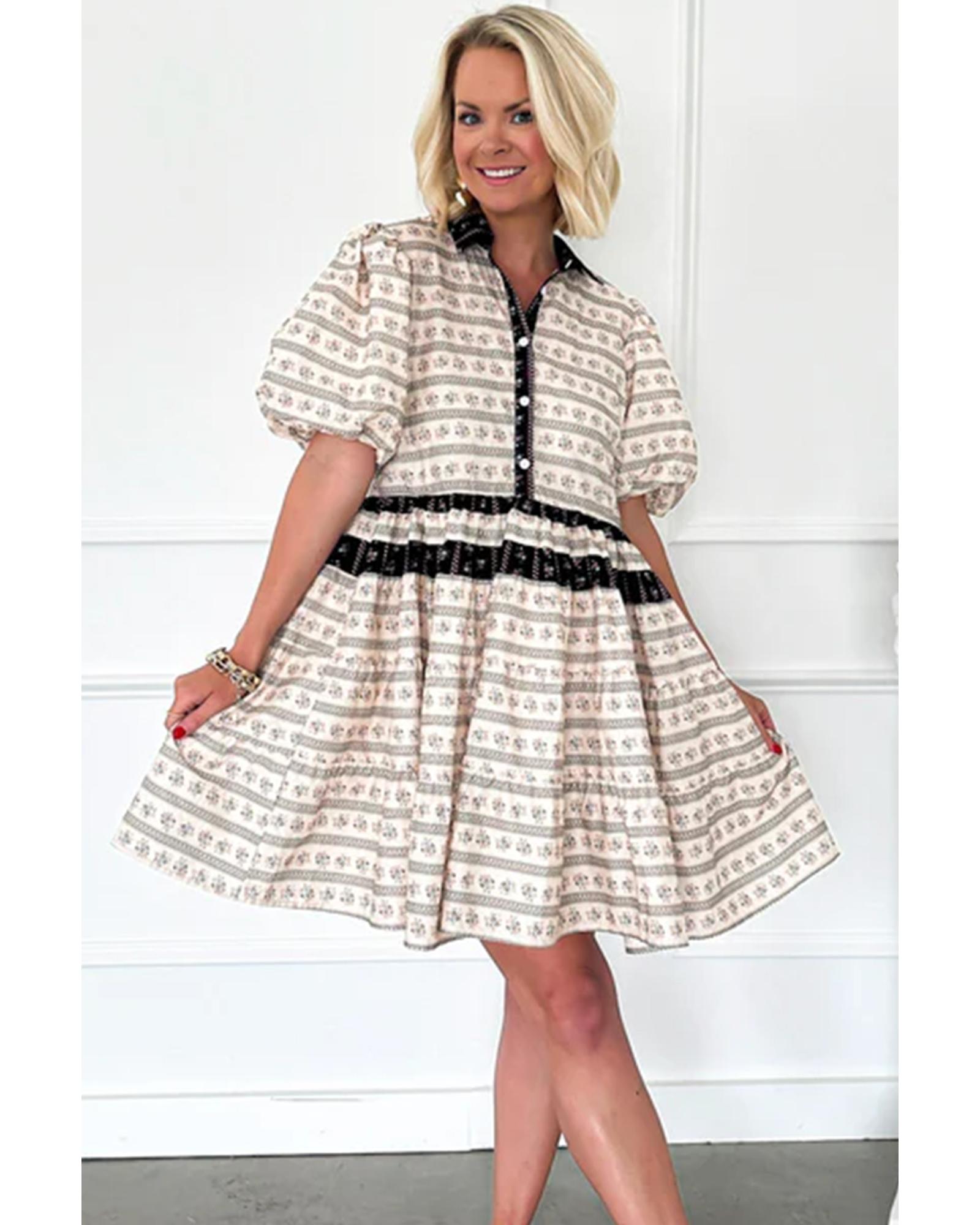 Black Boho Floral Striped Contrast Trim Bubble Sleeve Flared Dress – L