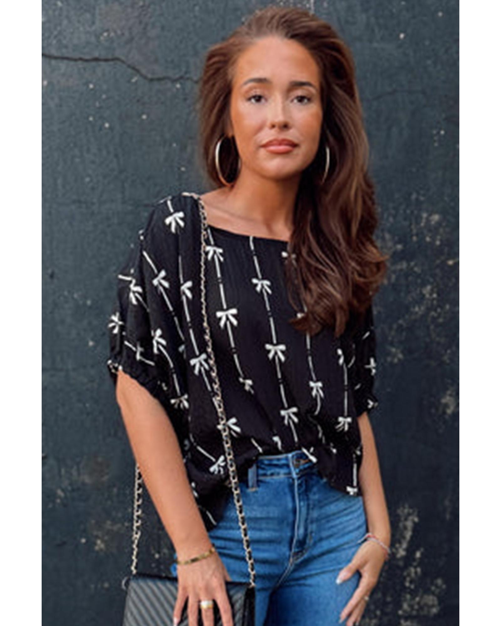 Black Bow Print Puff Short Sleeve Top – XL