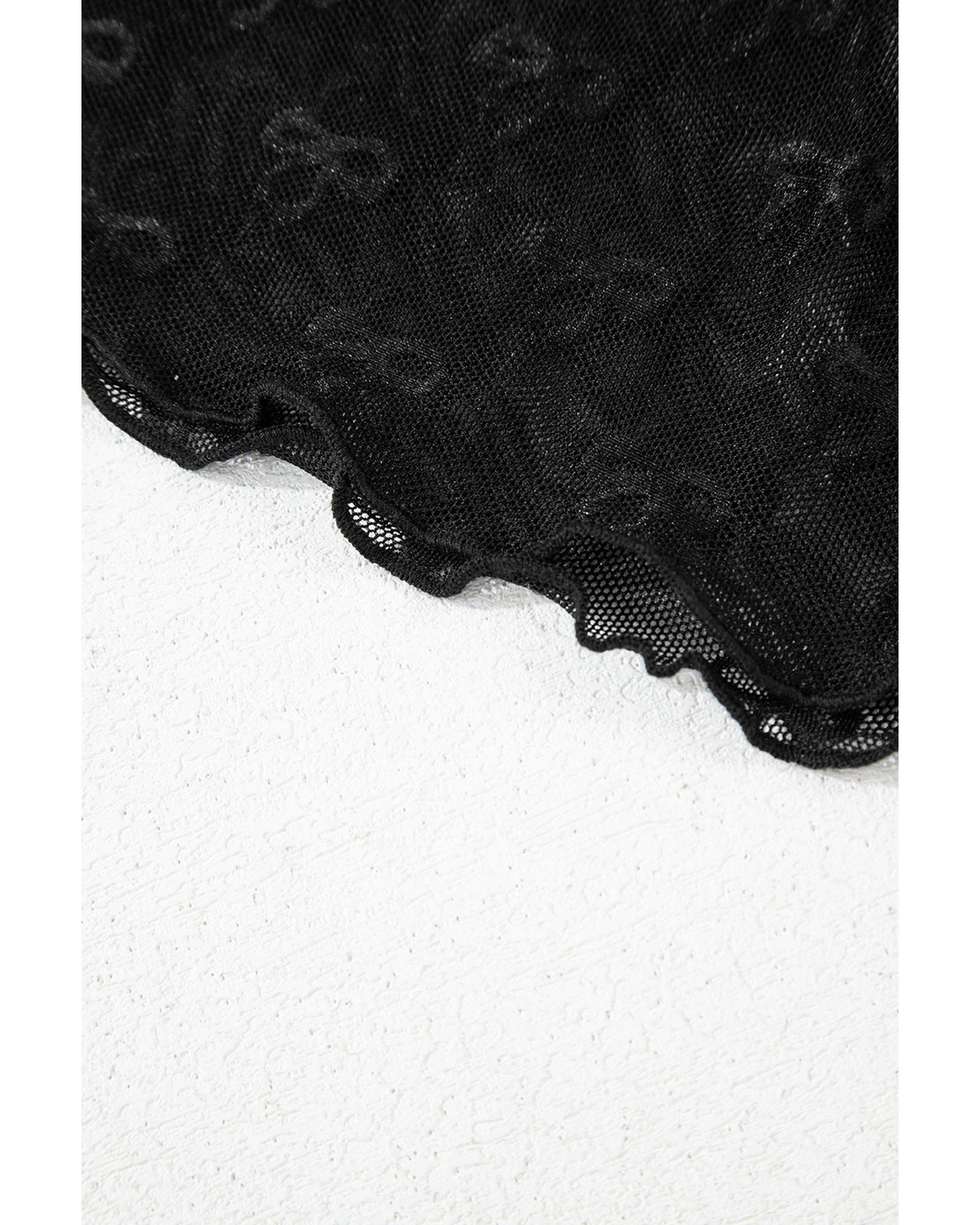 Black Bowknot Sheer Mesh Mock Neck Lettuce Trim Short Sleeve Top – M