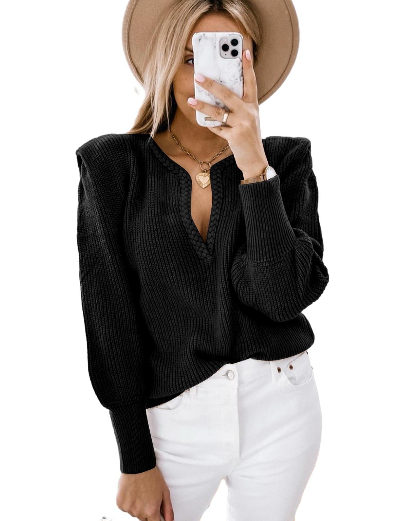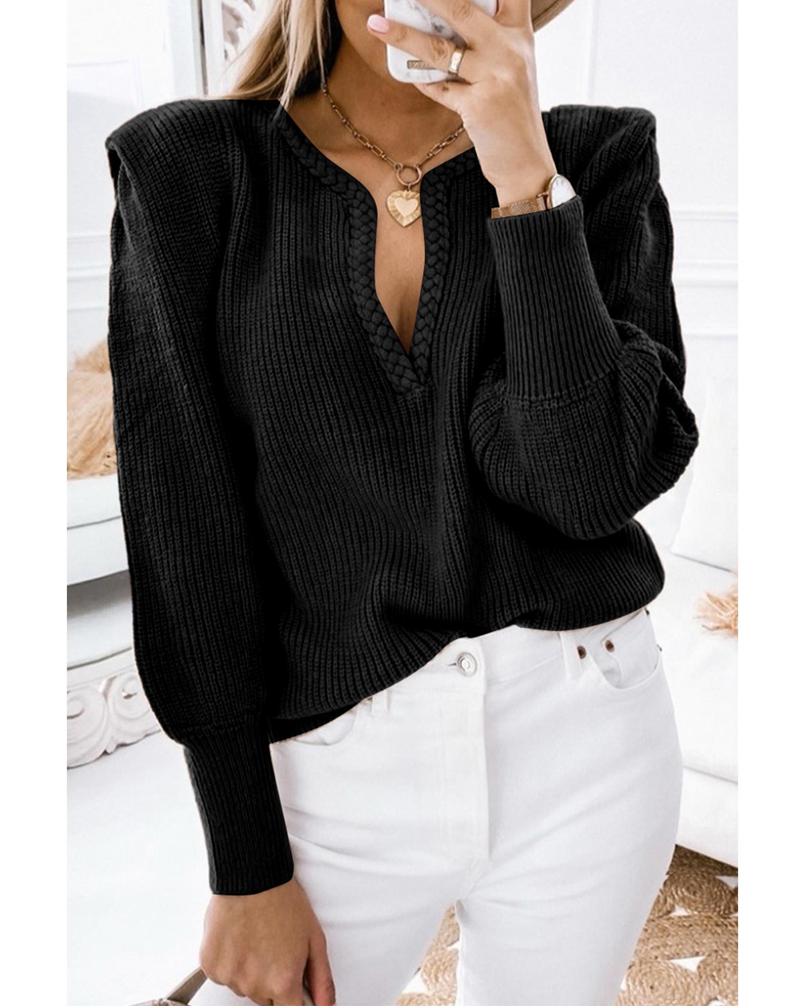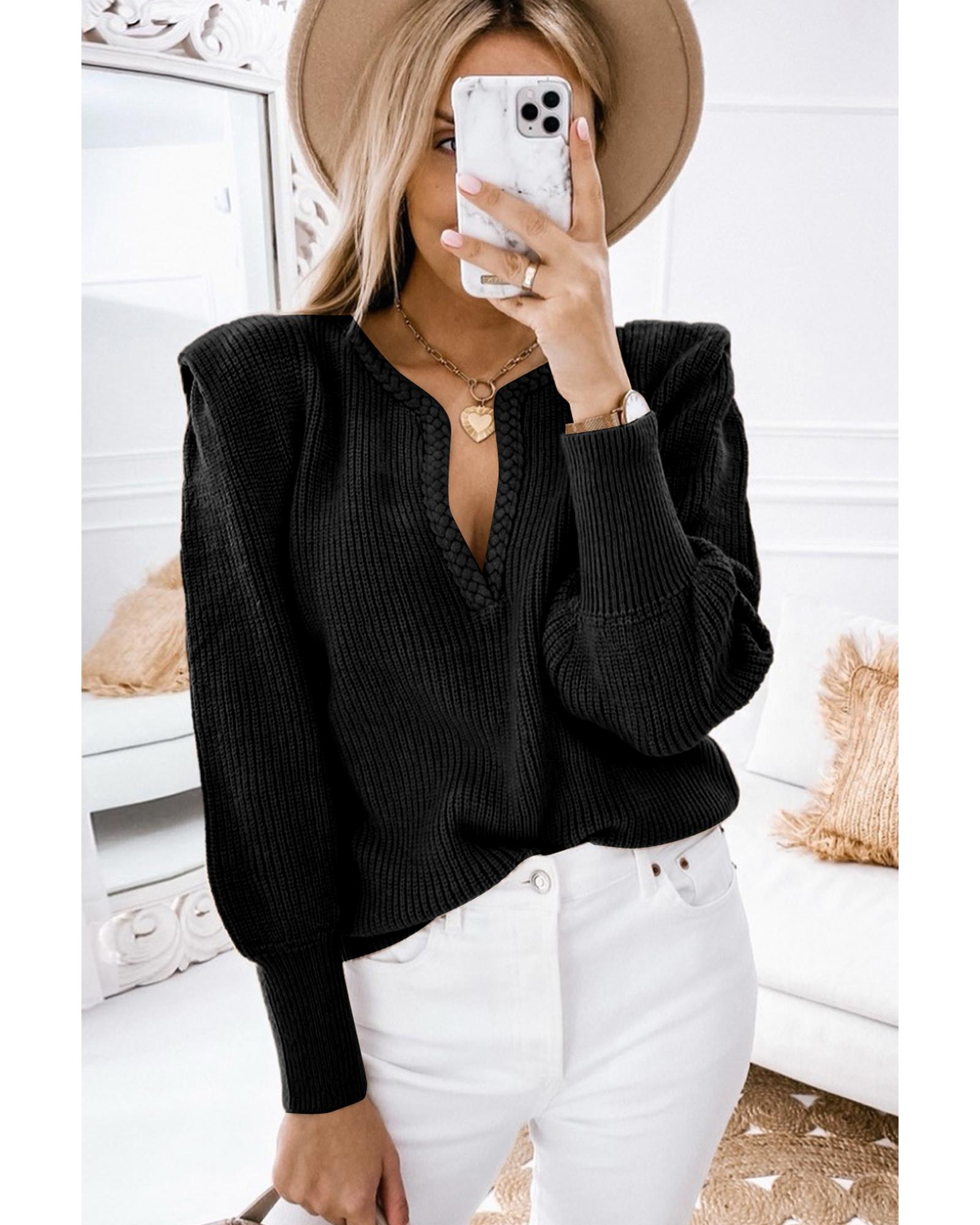 Black Braided Notched V Neckline Puff Sleeve Knitted Sweater – L