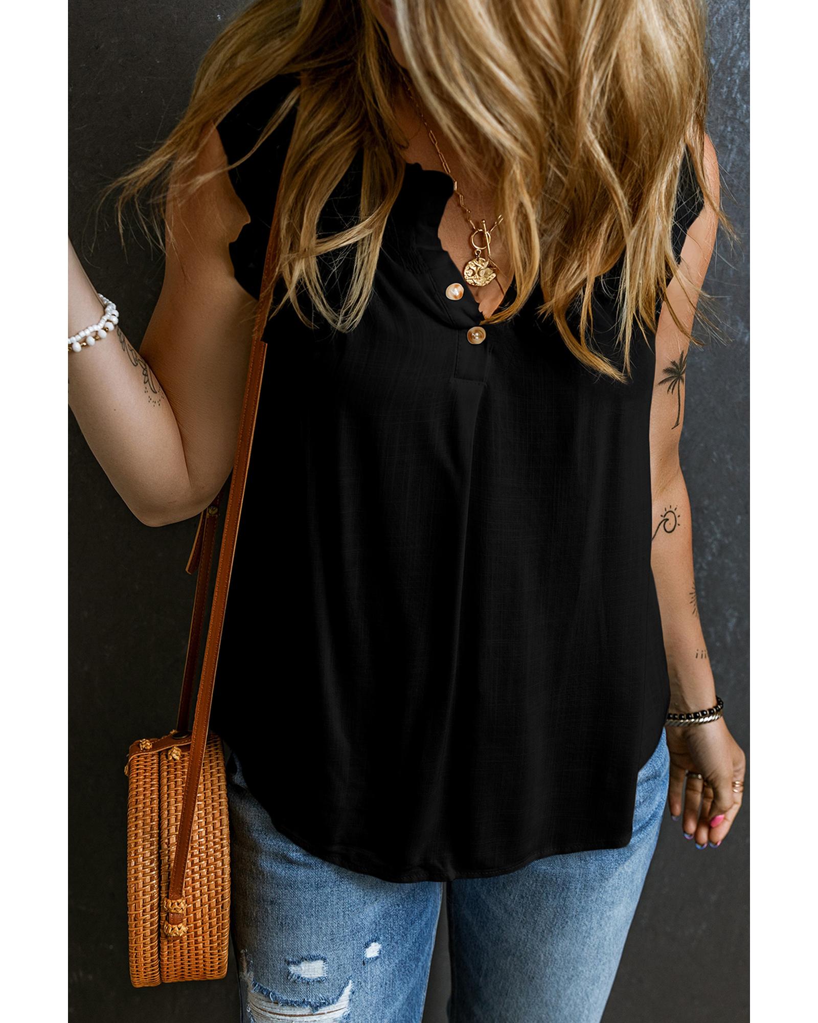 Black Button Split Neck Ruffled Trim Tank Top – XL