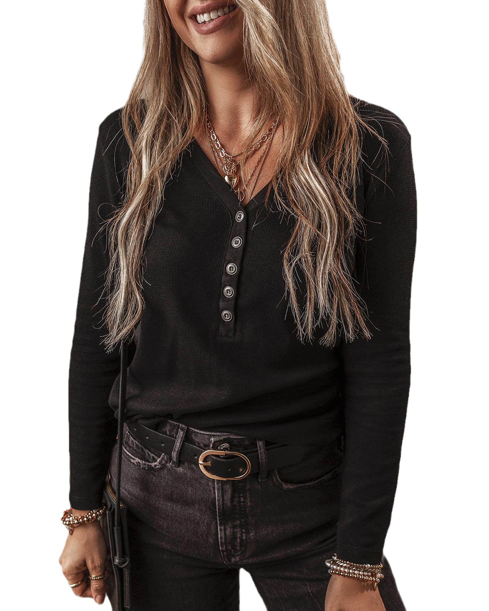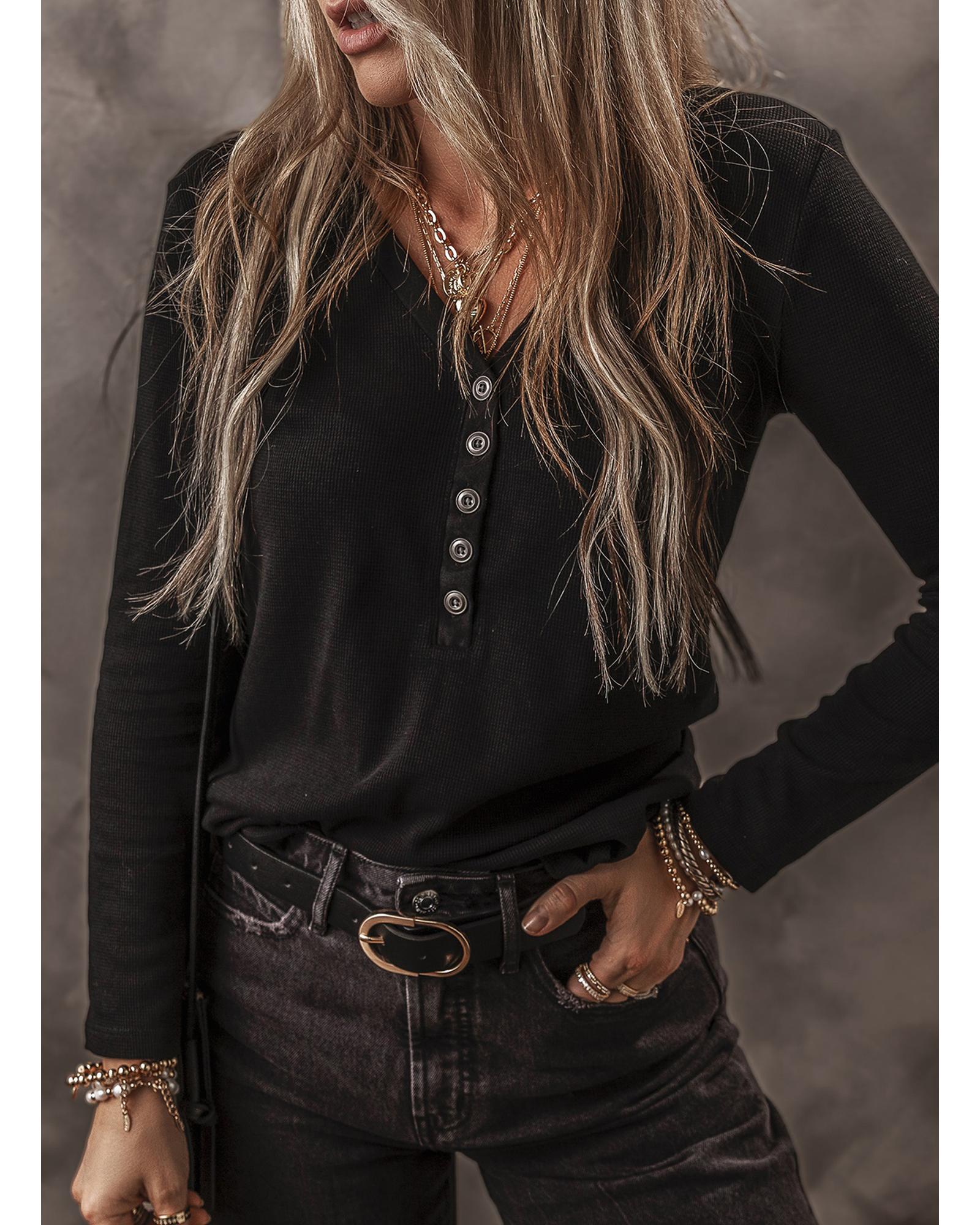 Black Buttoned V Neck Long Sleeve Ribbed Top – XL