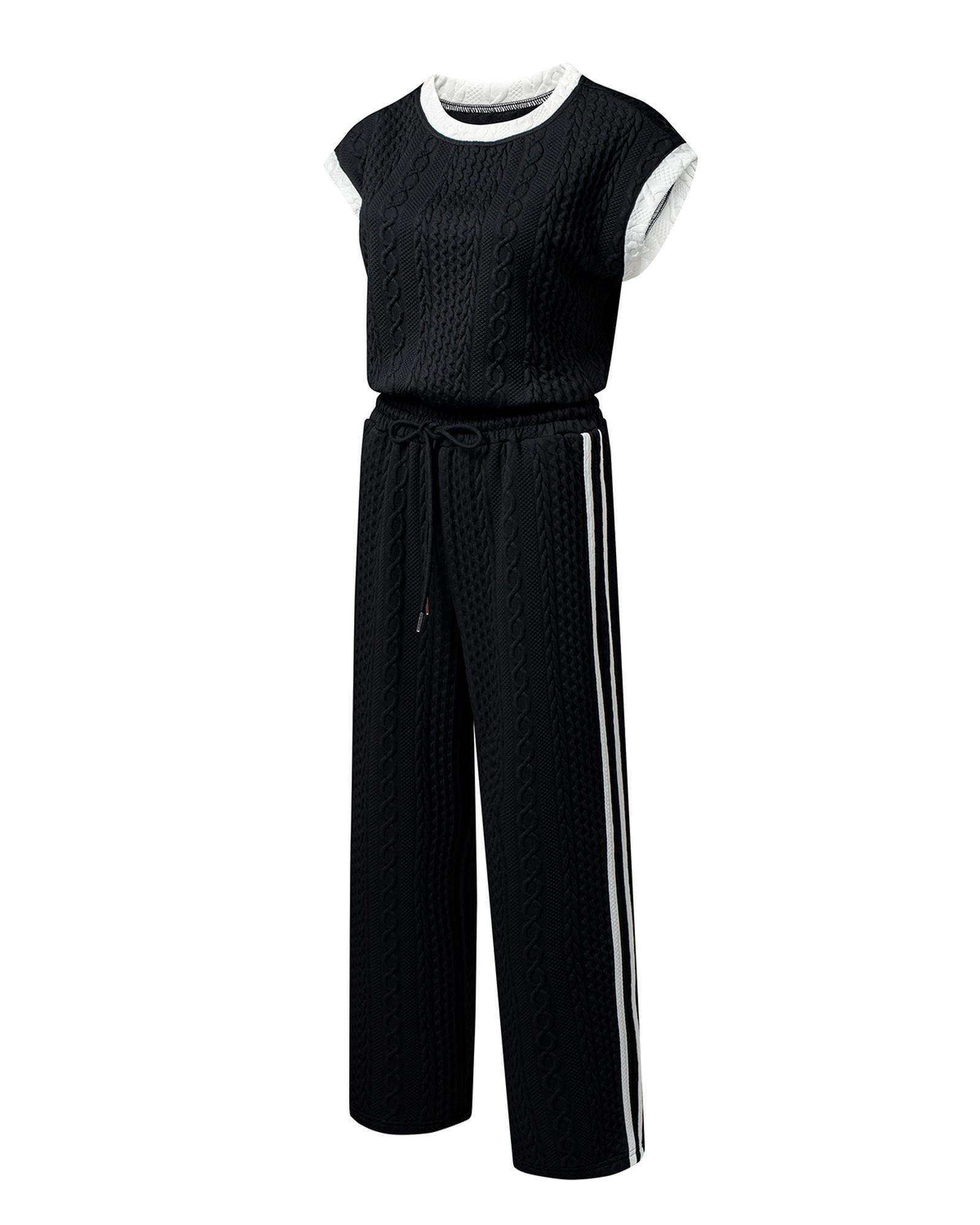 Black Cable Knit Contrast Trim Short Sleeve Top and Pants Set – 2XL
