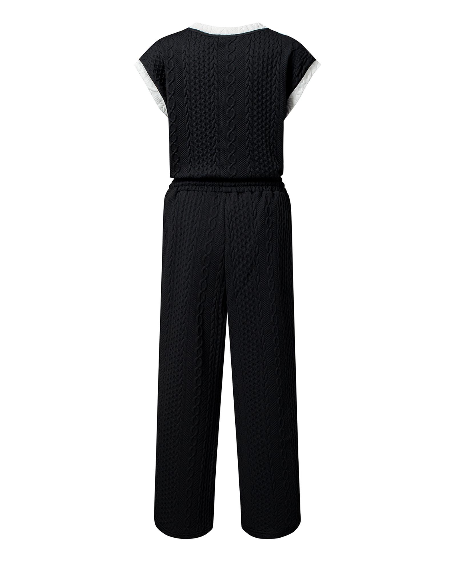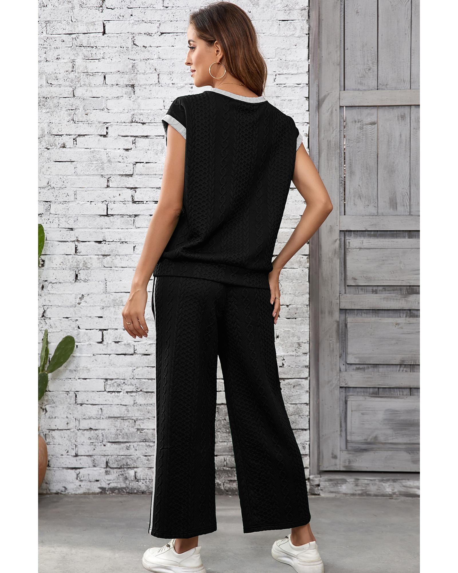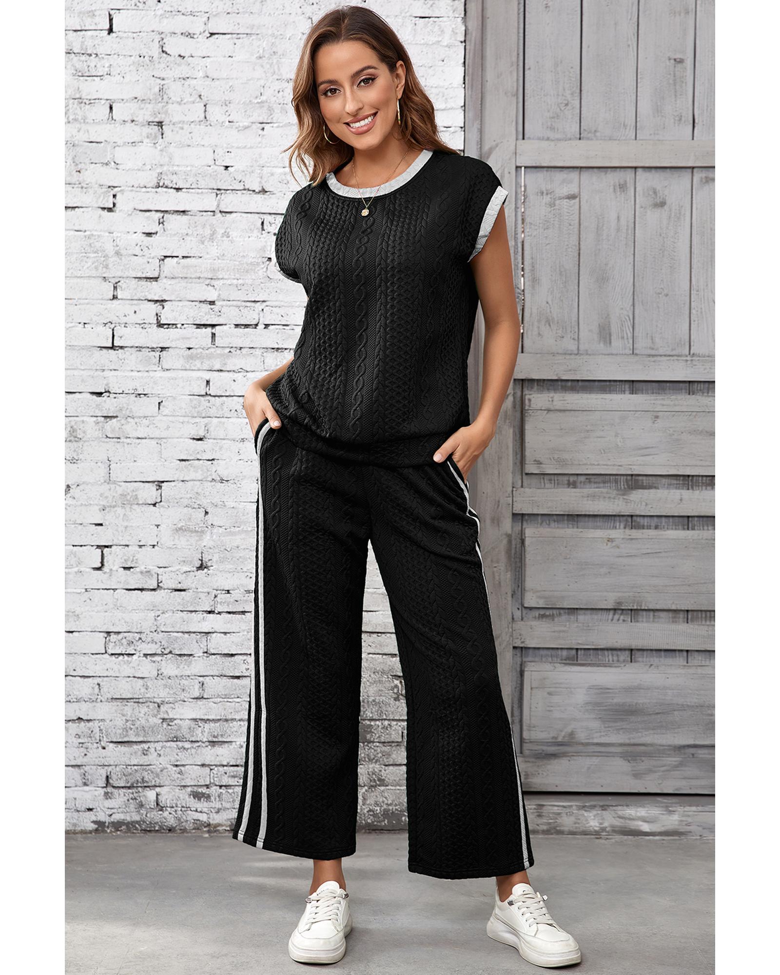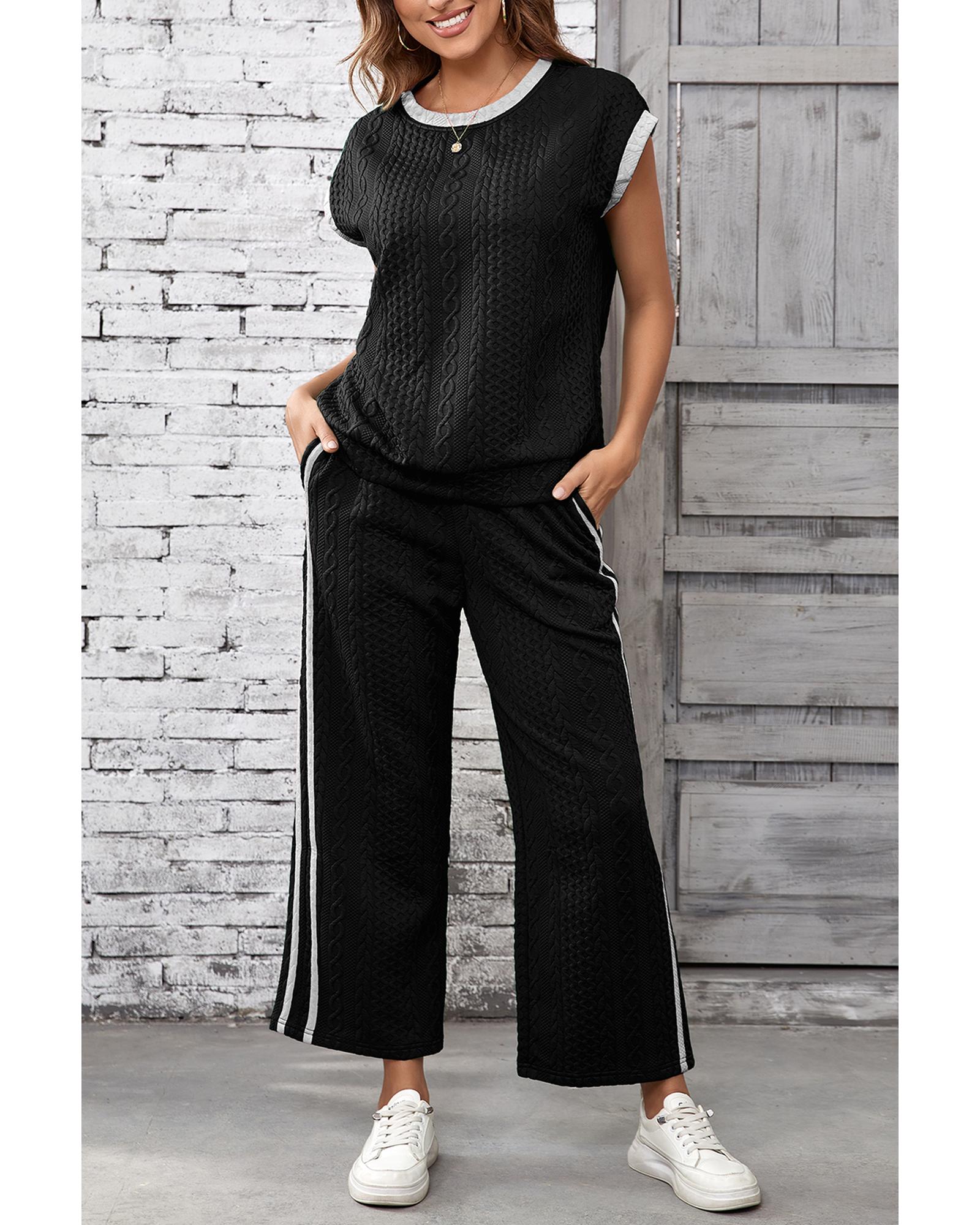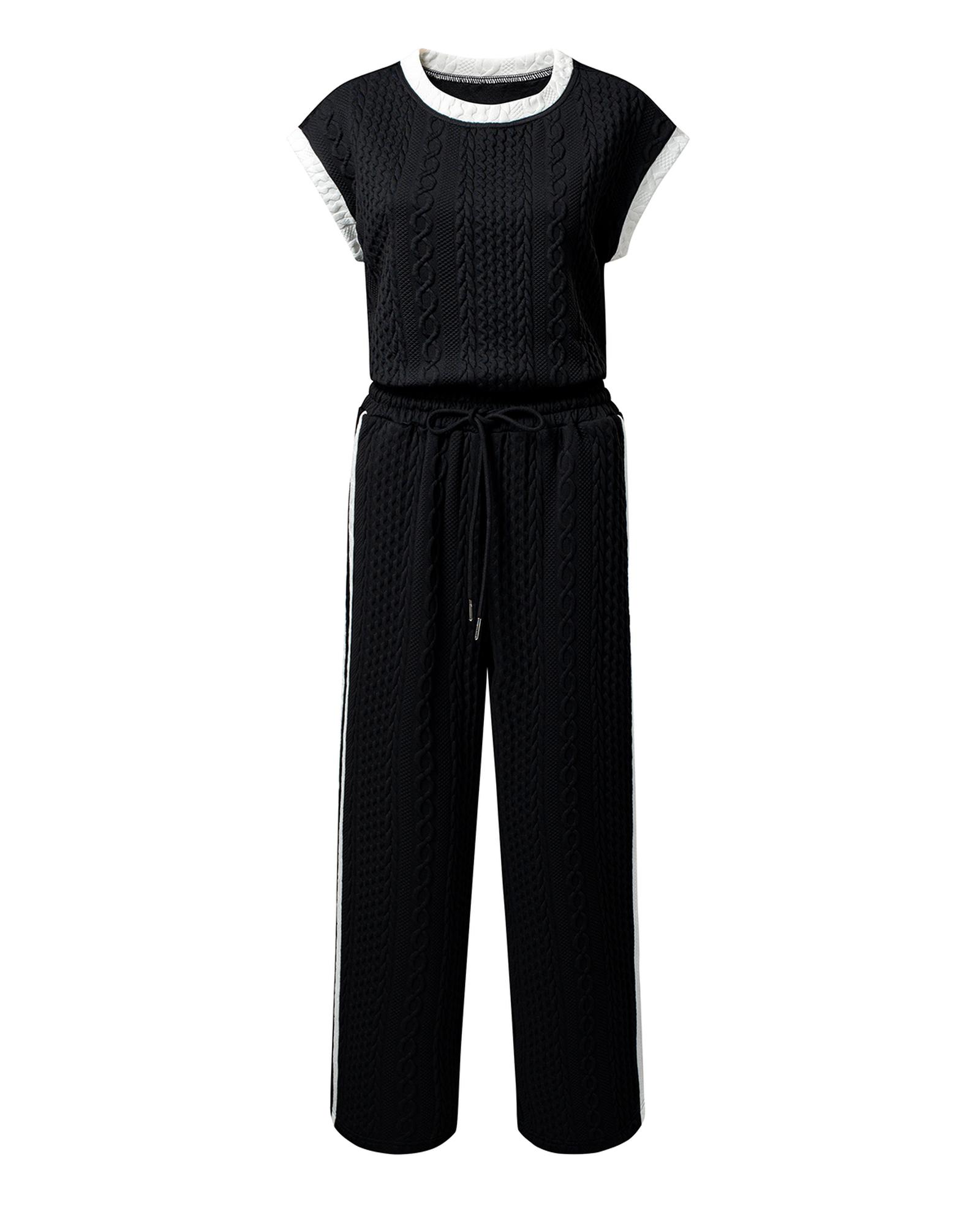 Black Cable Knit Contrast Trim Short Sleeve Top and Pants Set – XL