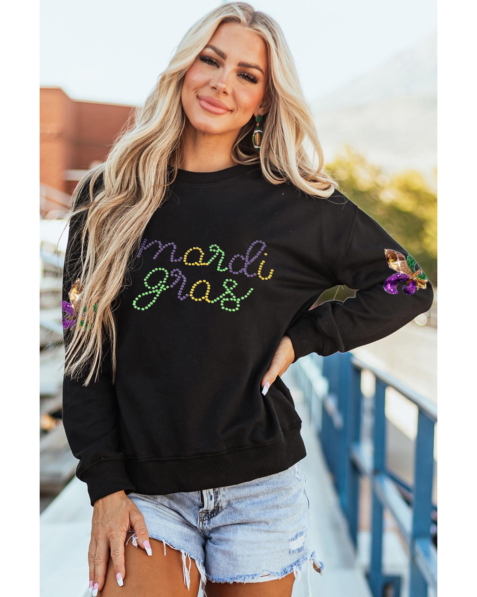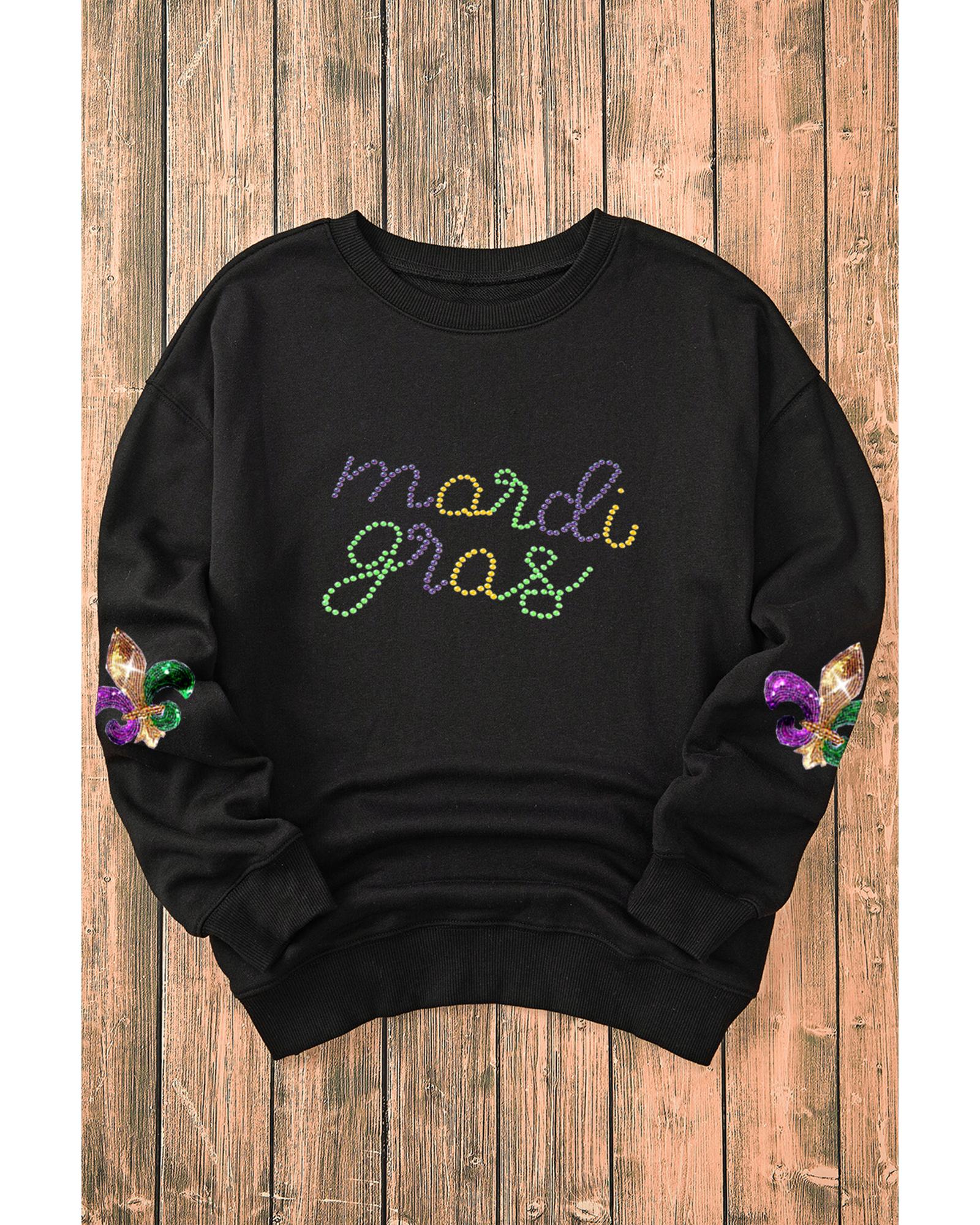 Black Ceramic Rhinestone mardi gras Letter Graphic Sweatshirt – L