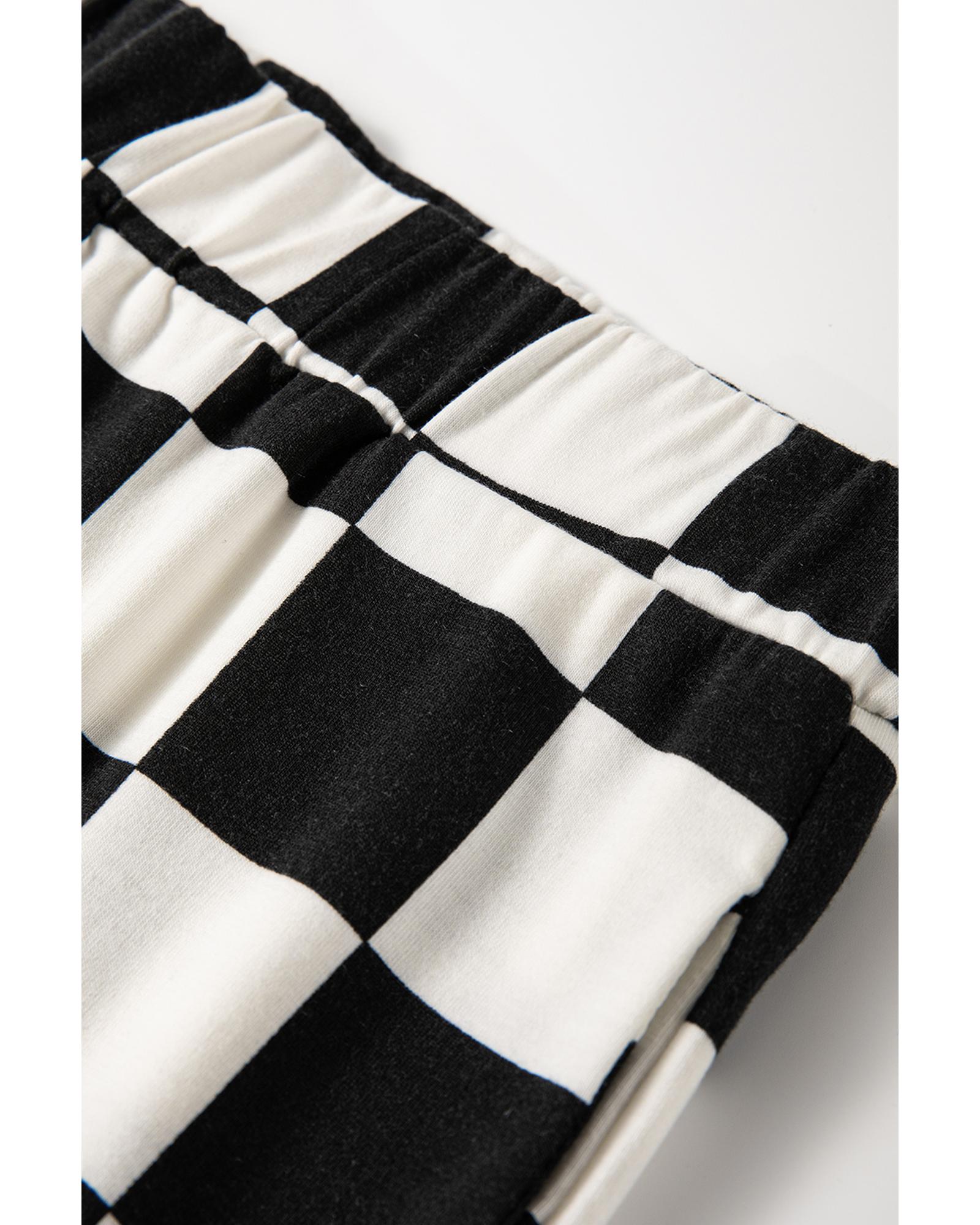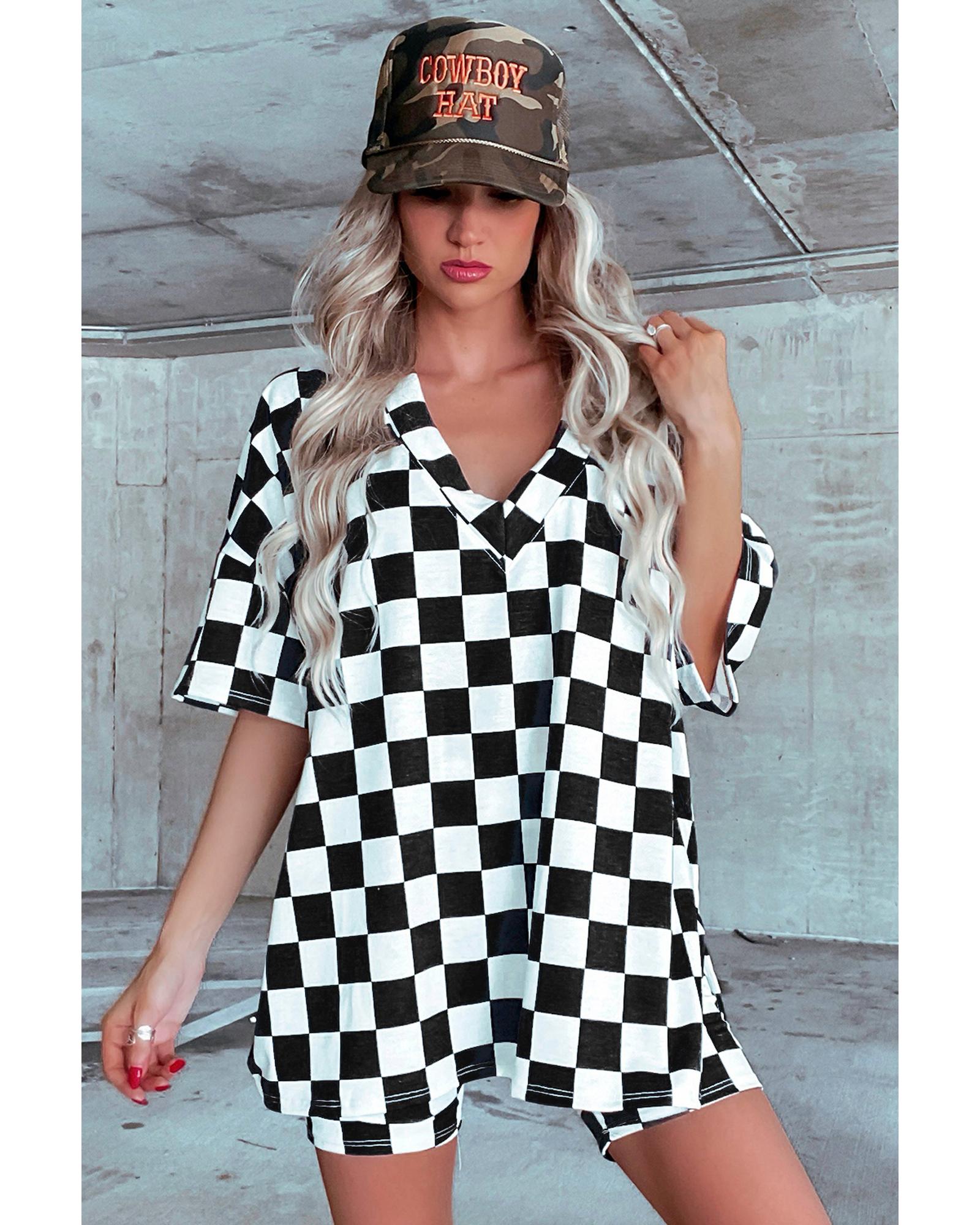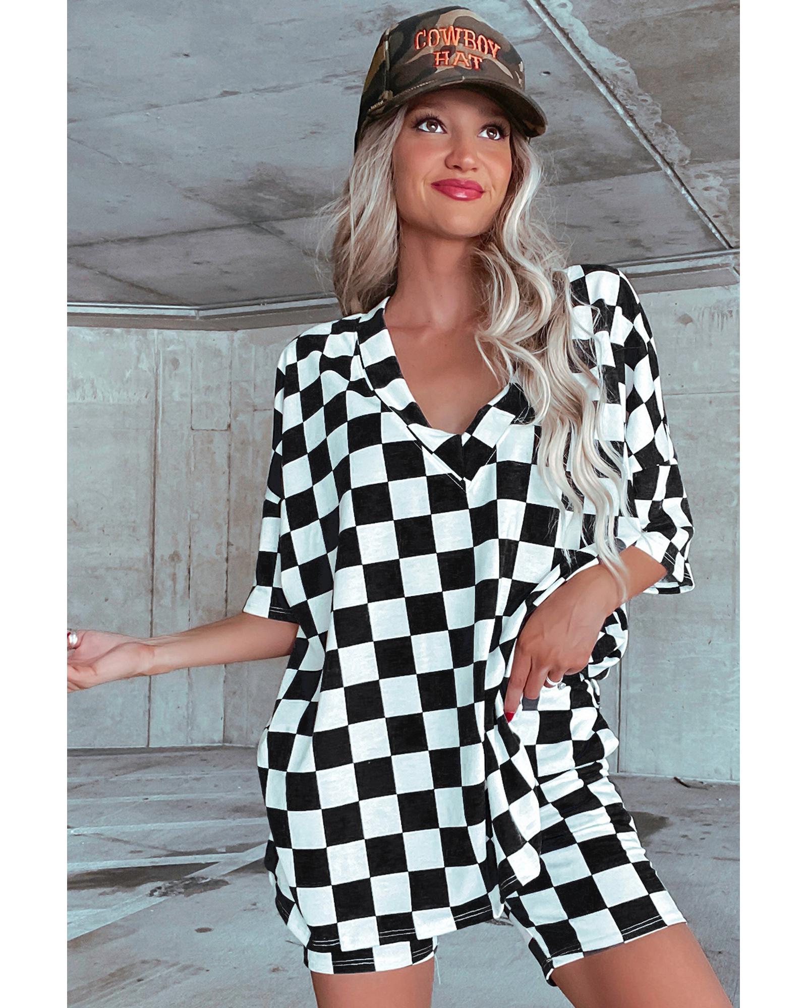 Black Checkerboard Print V Neck Loose Tee and Shorts Lounge Set – S