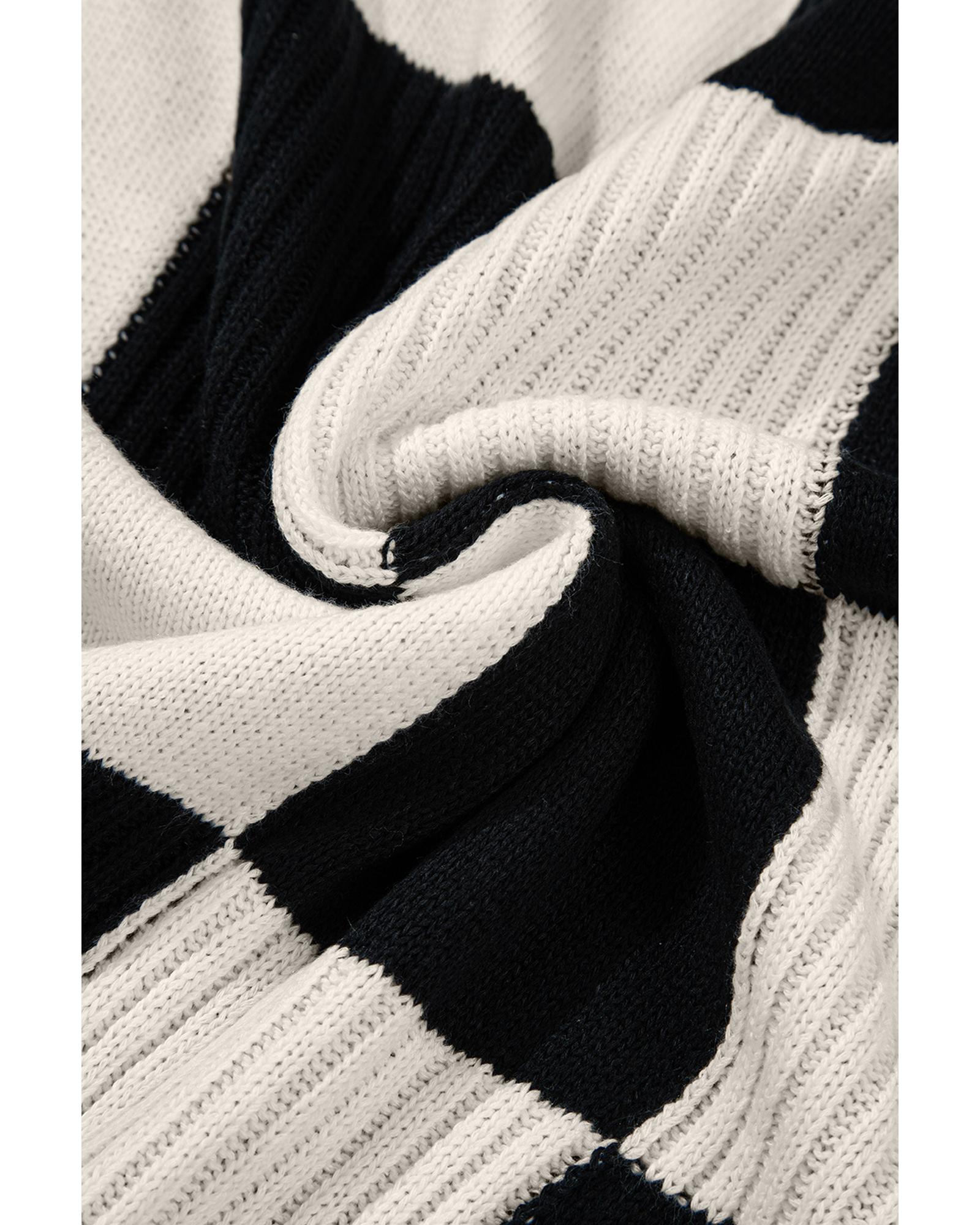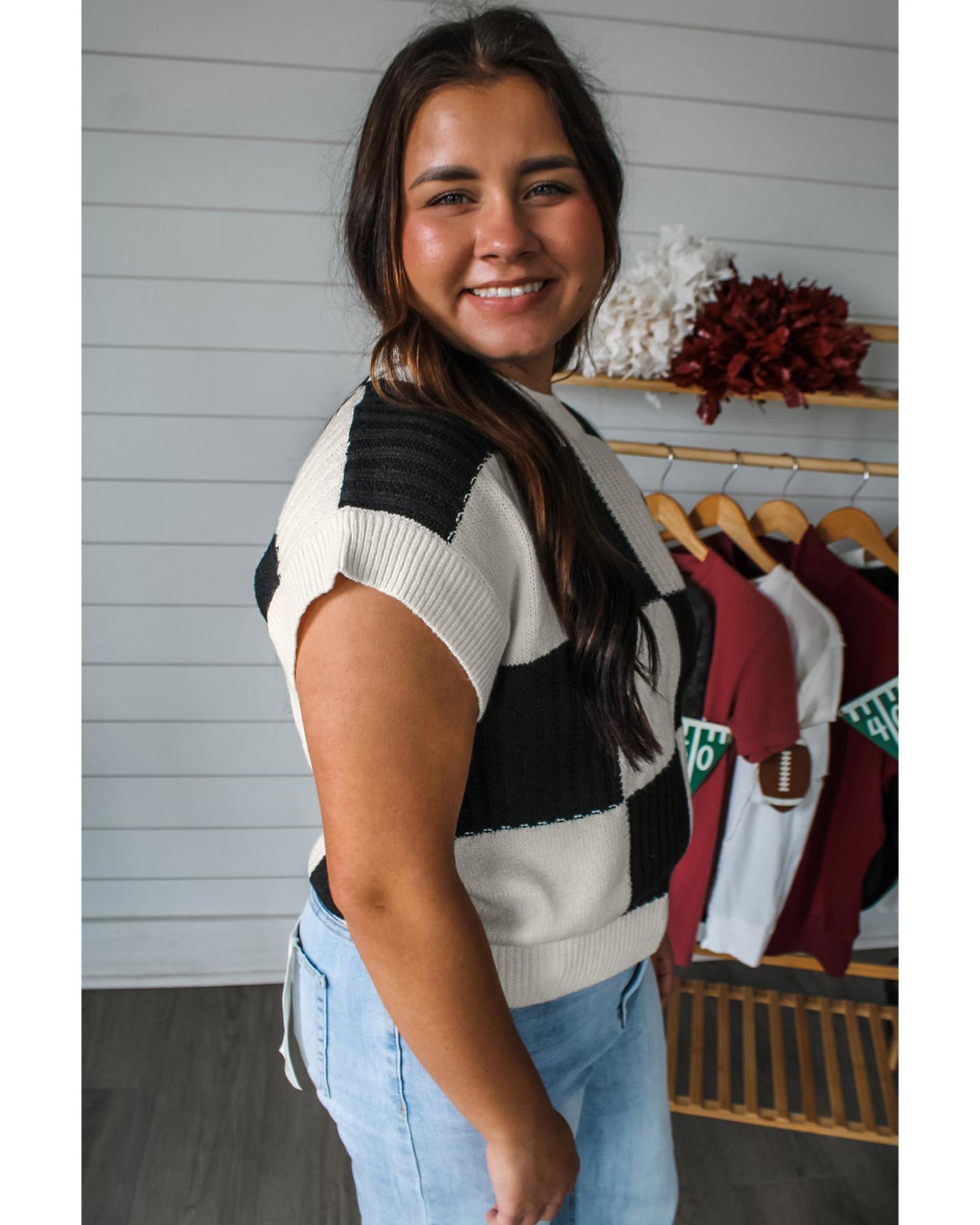 Black Checkered Color Block Crew Neck Short Sleeve Sweater – L