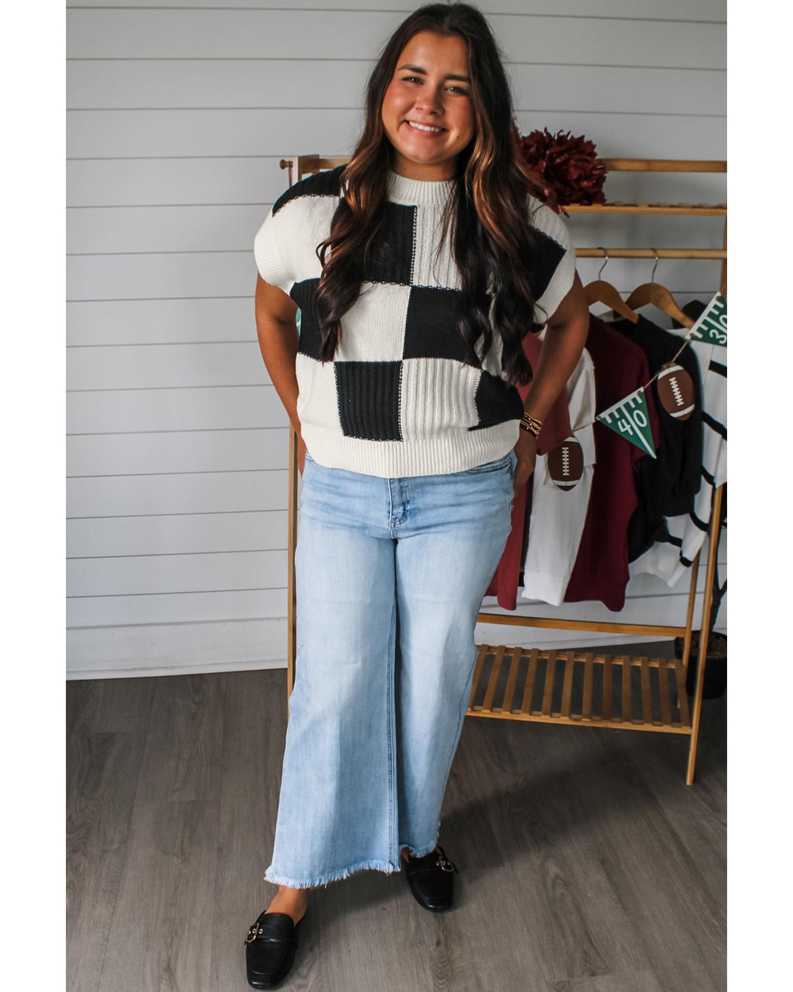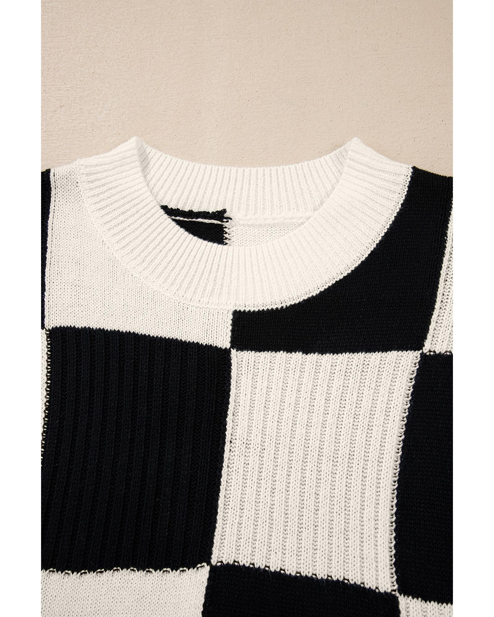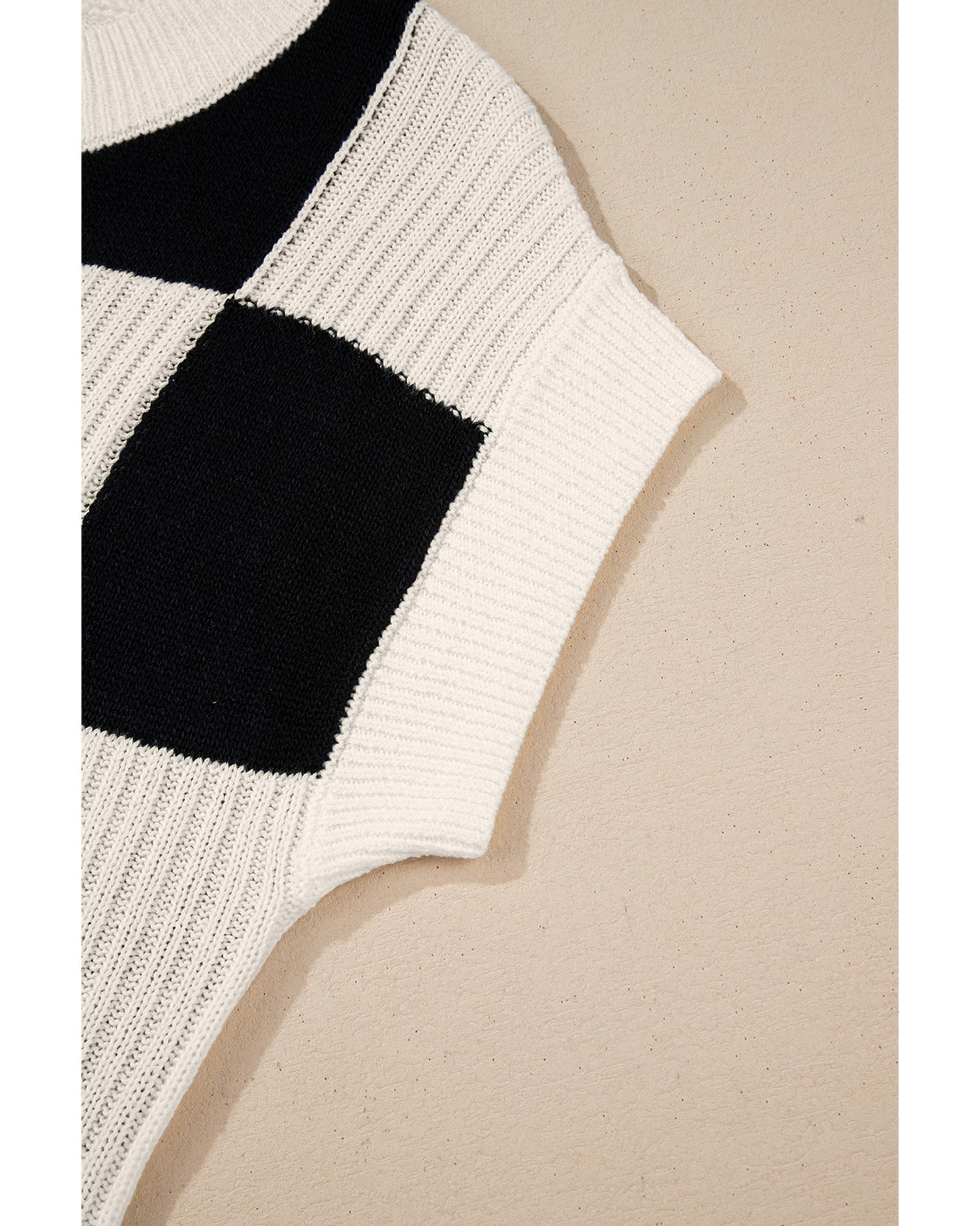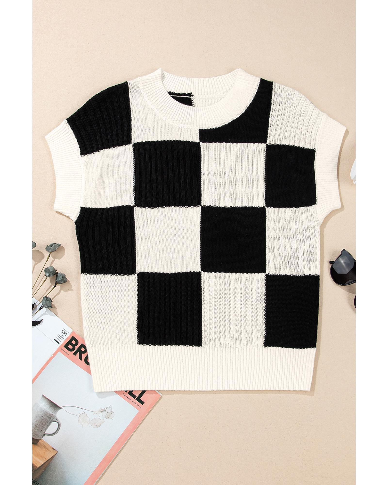 Black Checkered Color Block Crew Neck Short Sleeve Sweater – S