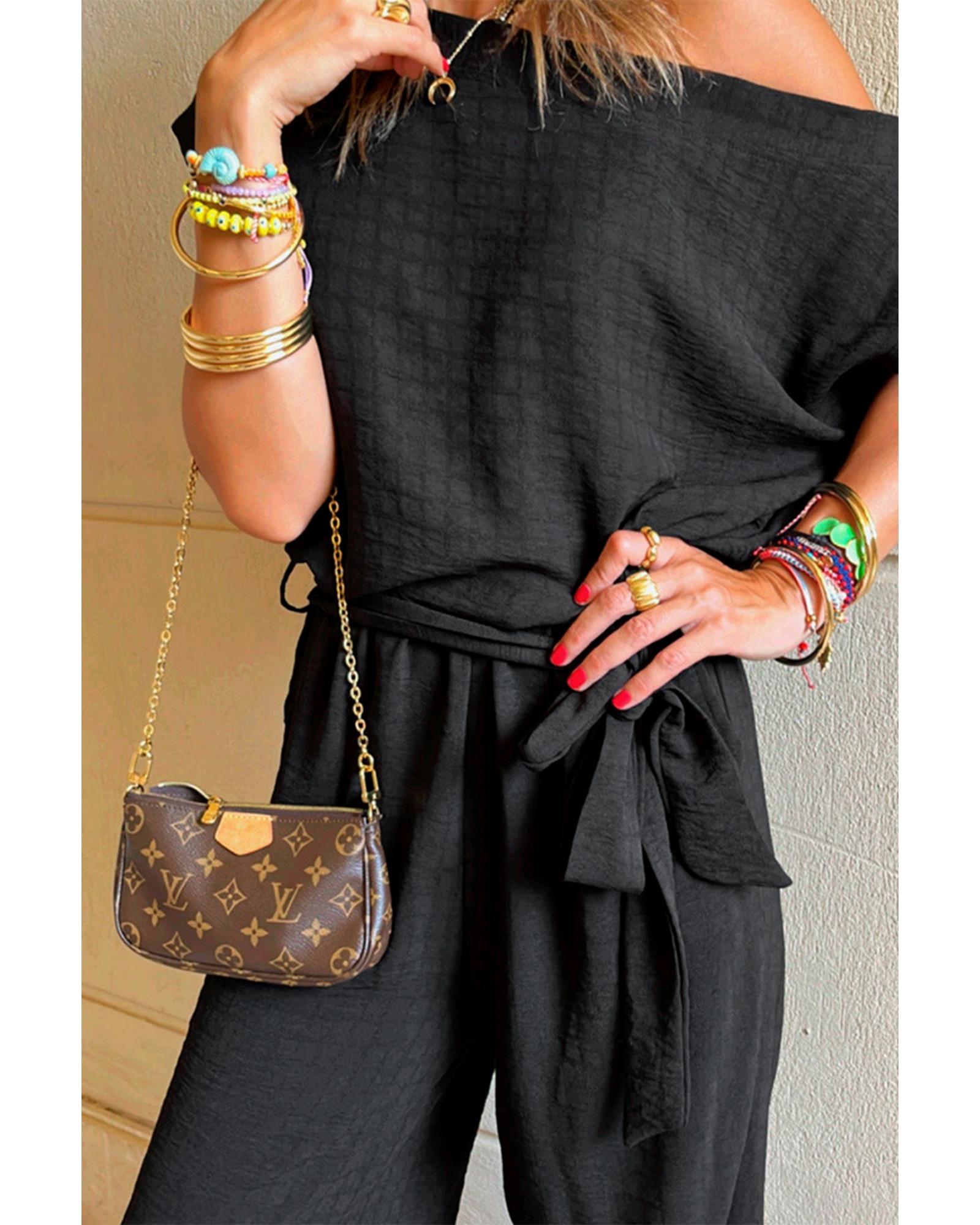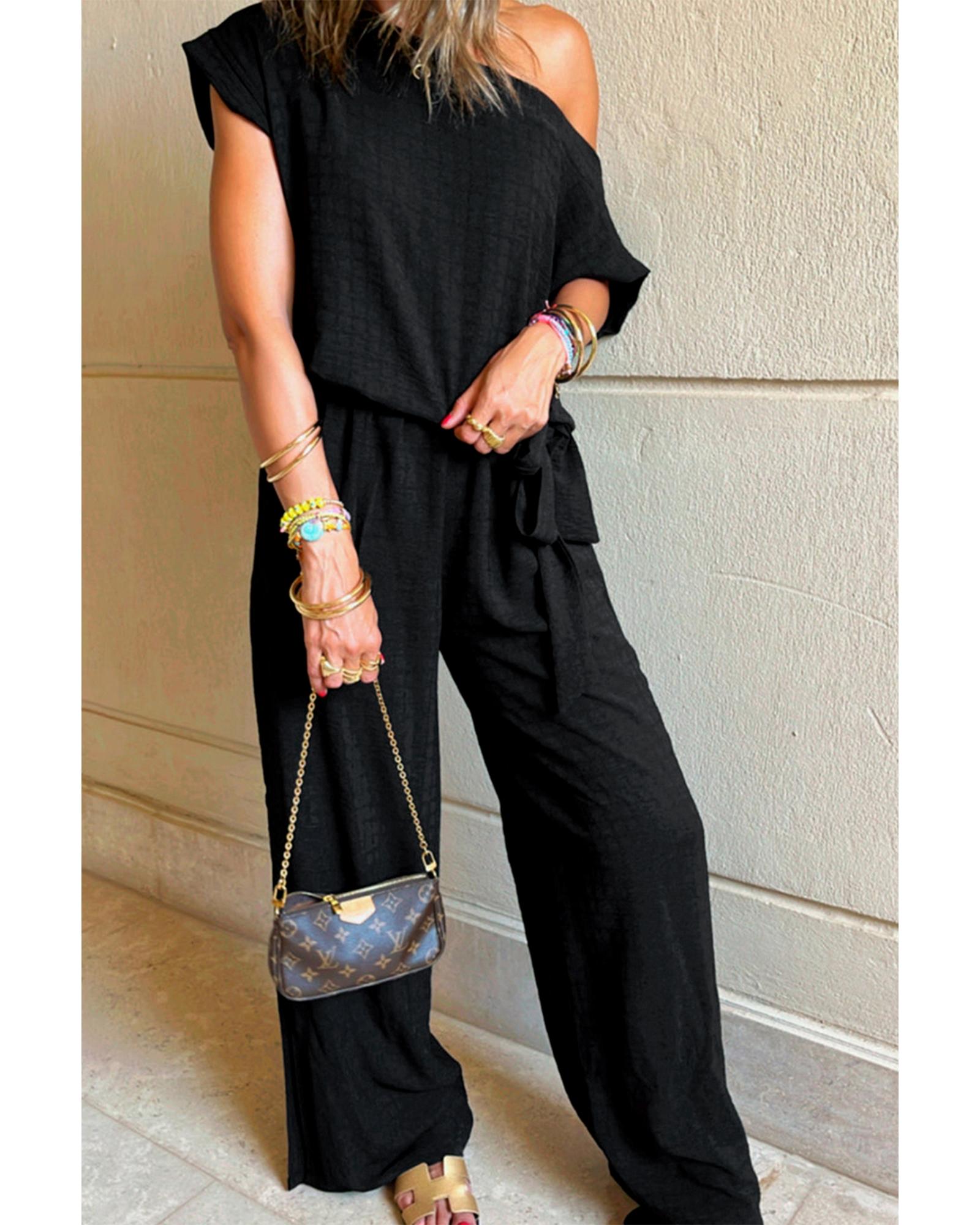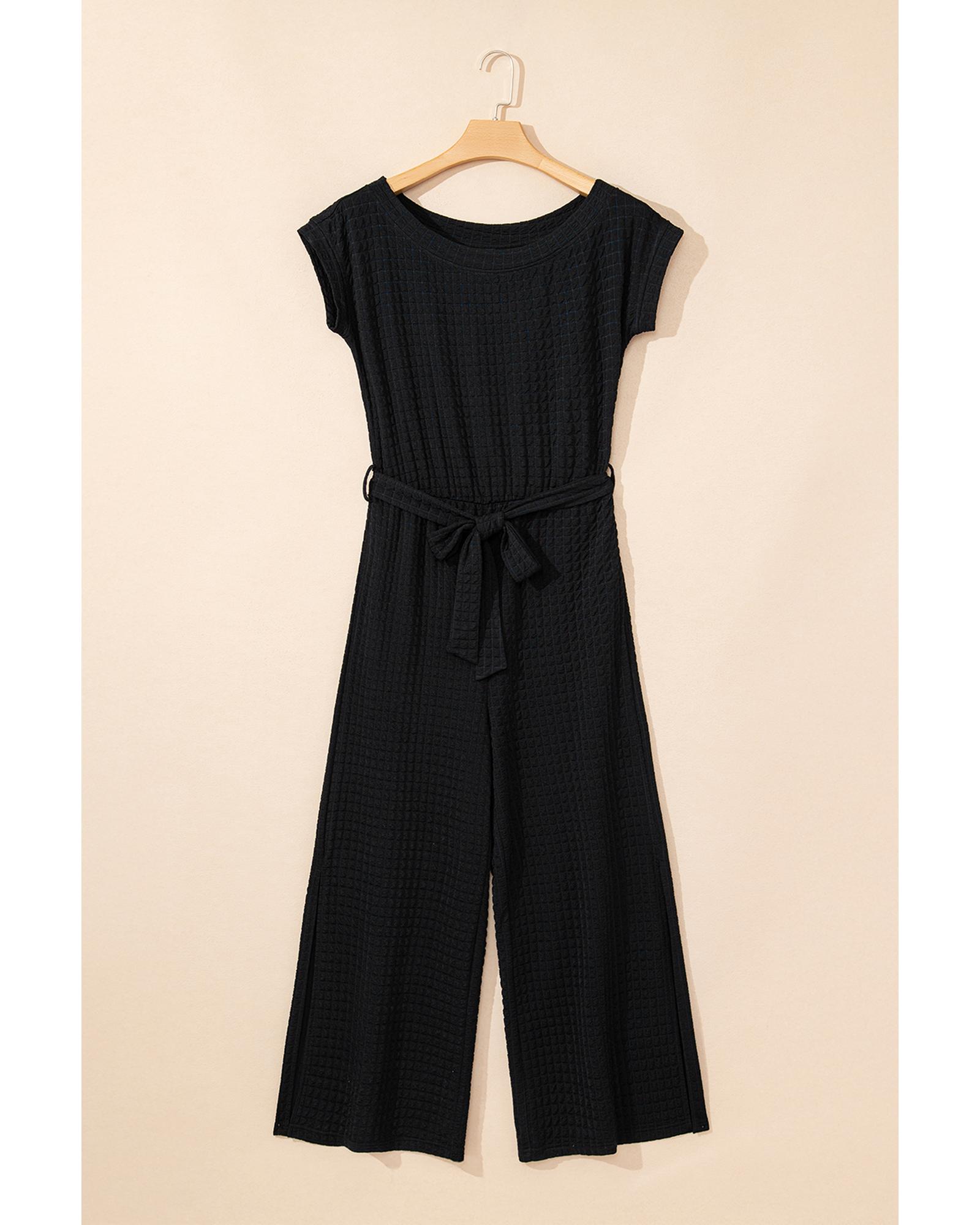 Black Checkered Mesh One Shoulder Short Sleeve Knotted Waist Jumpsuit – XL