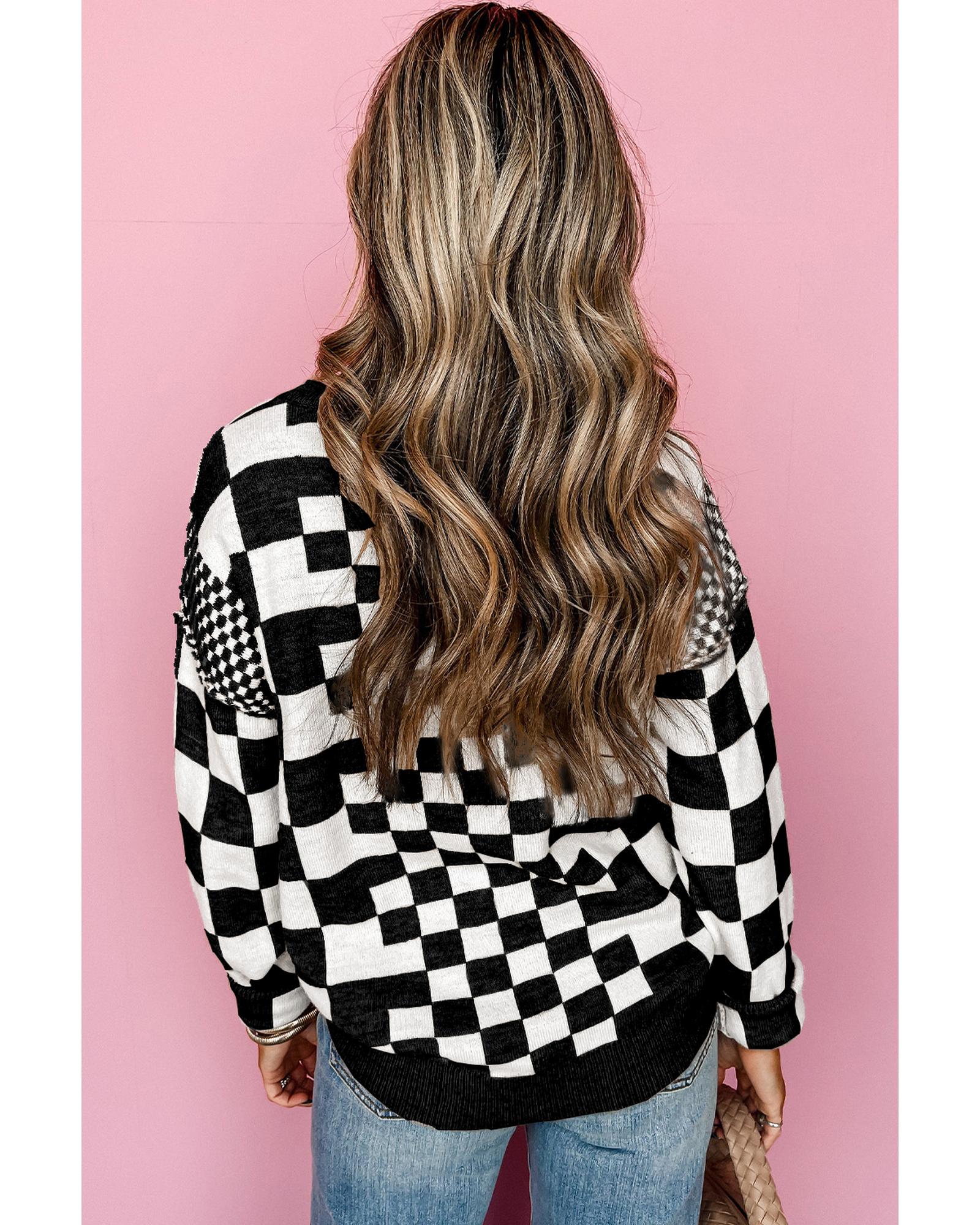 - Black Checkered Print Drop Shoulder Round Neck Sweater
