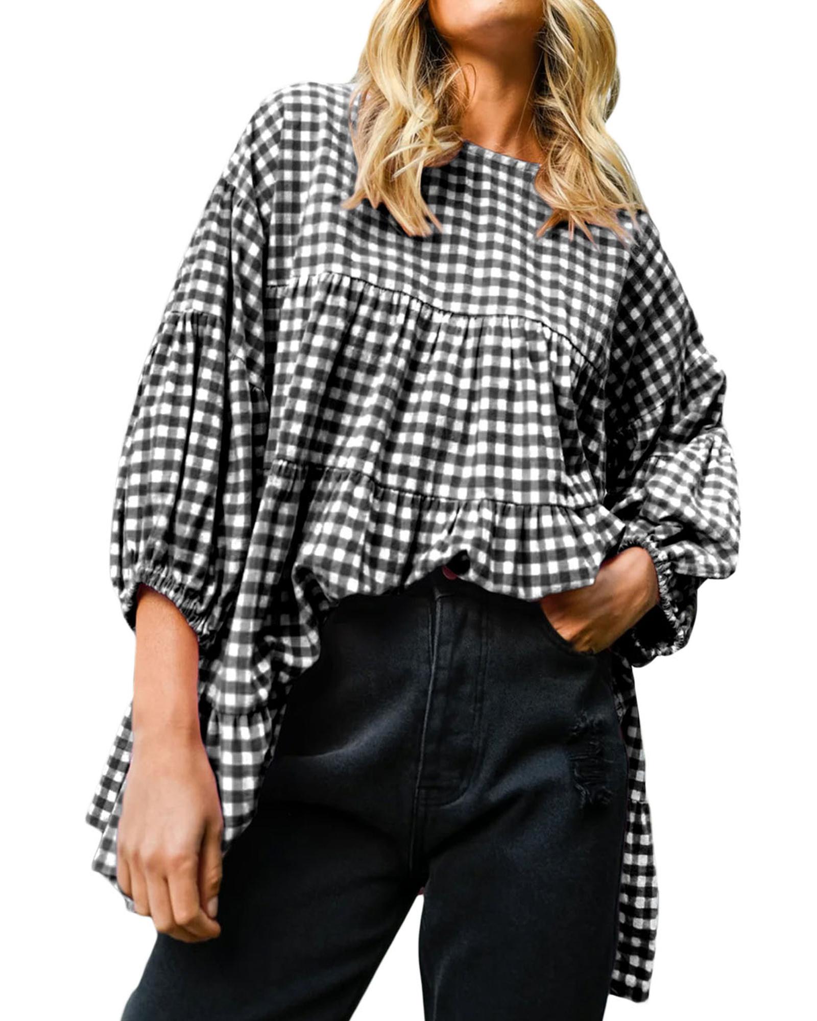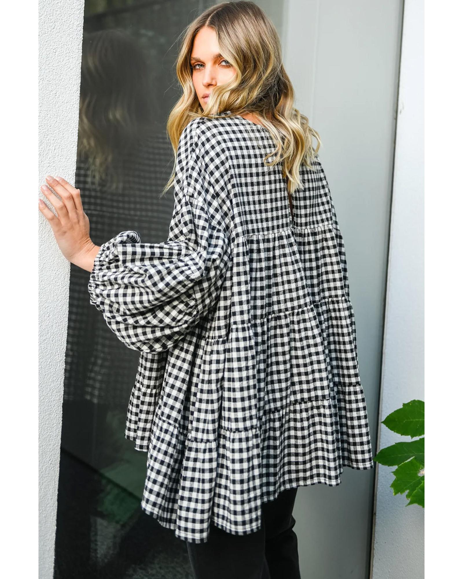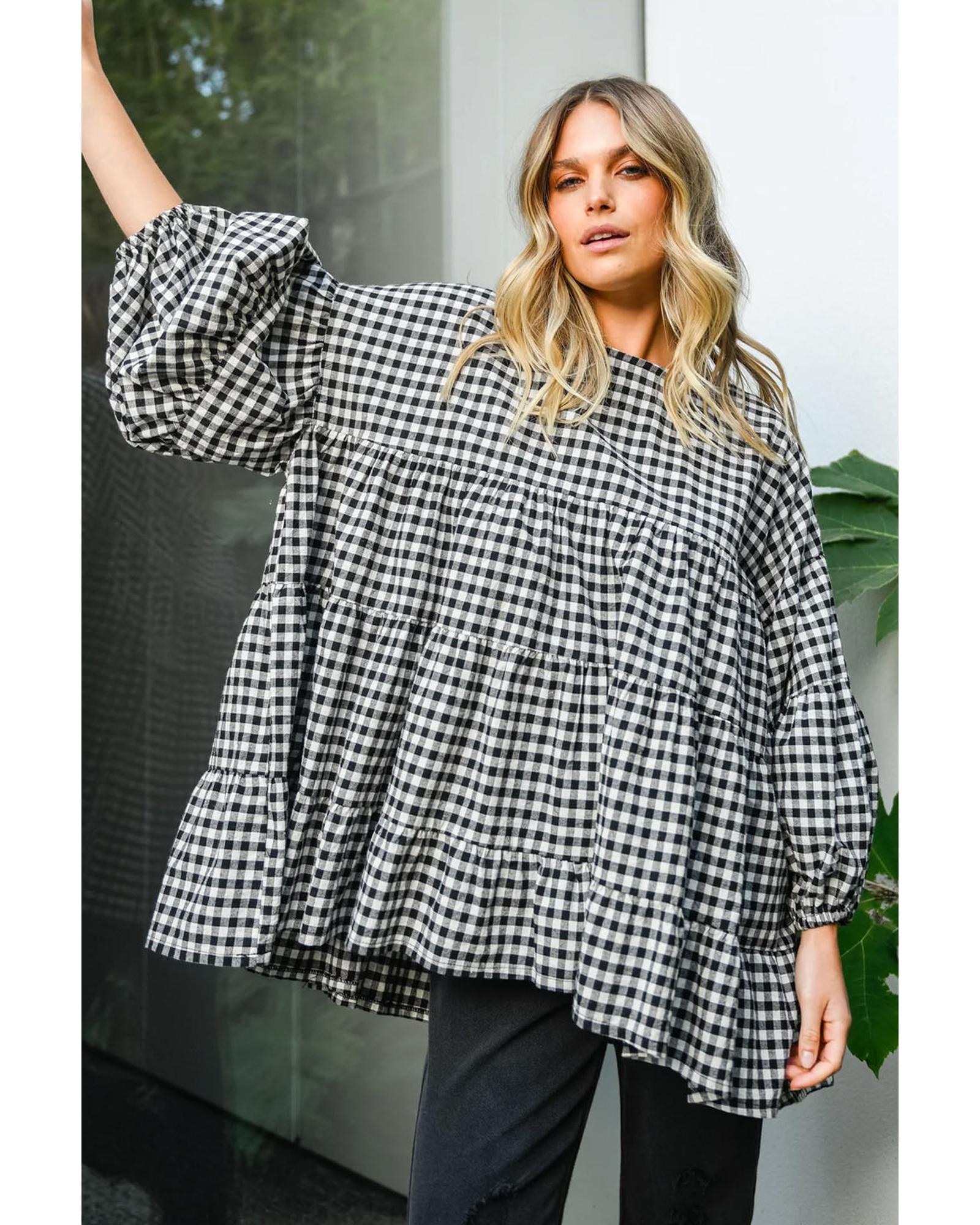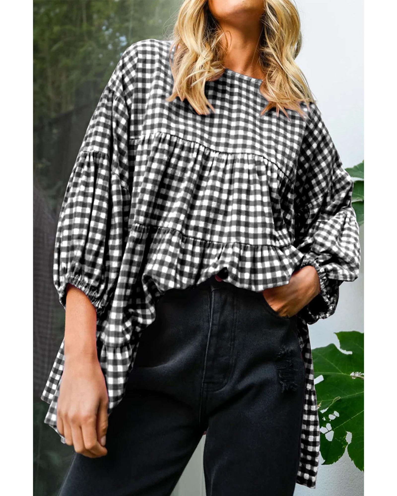 Black Checkered Puff Sleeve Tiered Loose Babydoll Blouse – M