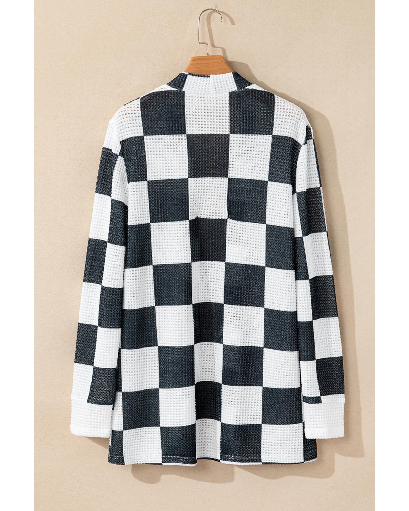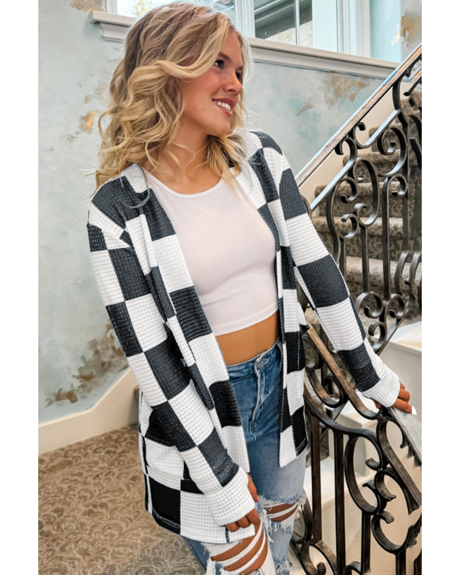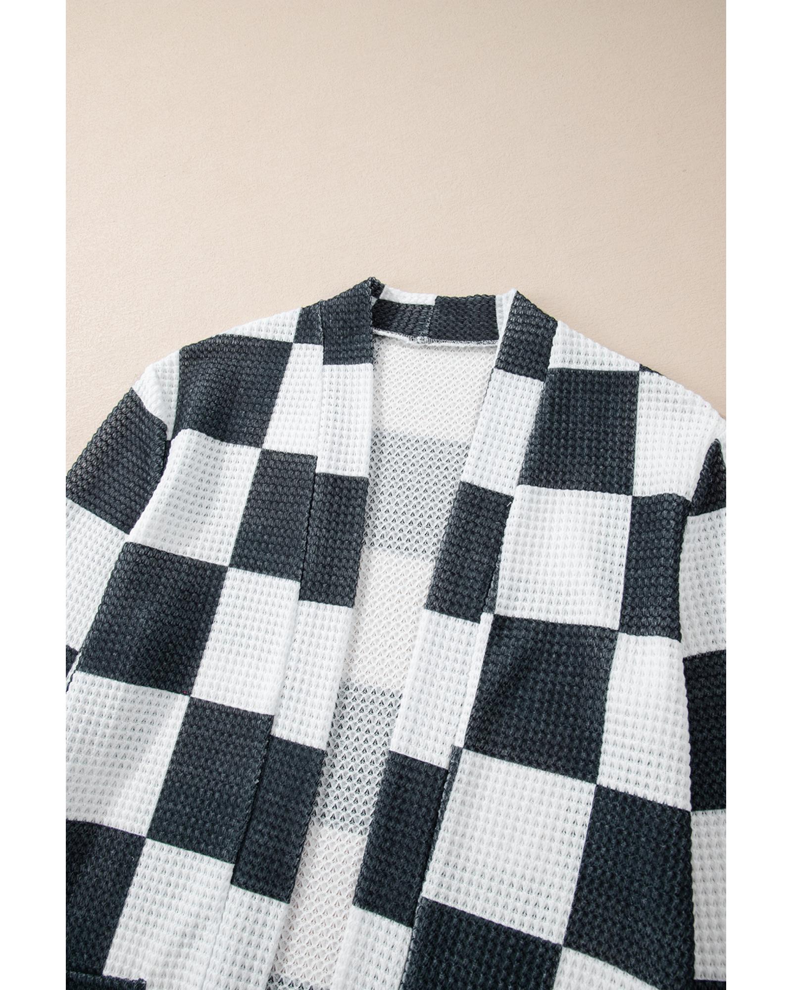 Black Checkered Waffle Knit Thumbhole Open Front Cardigan – S