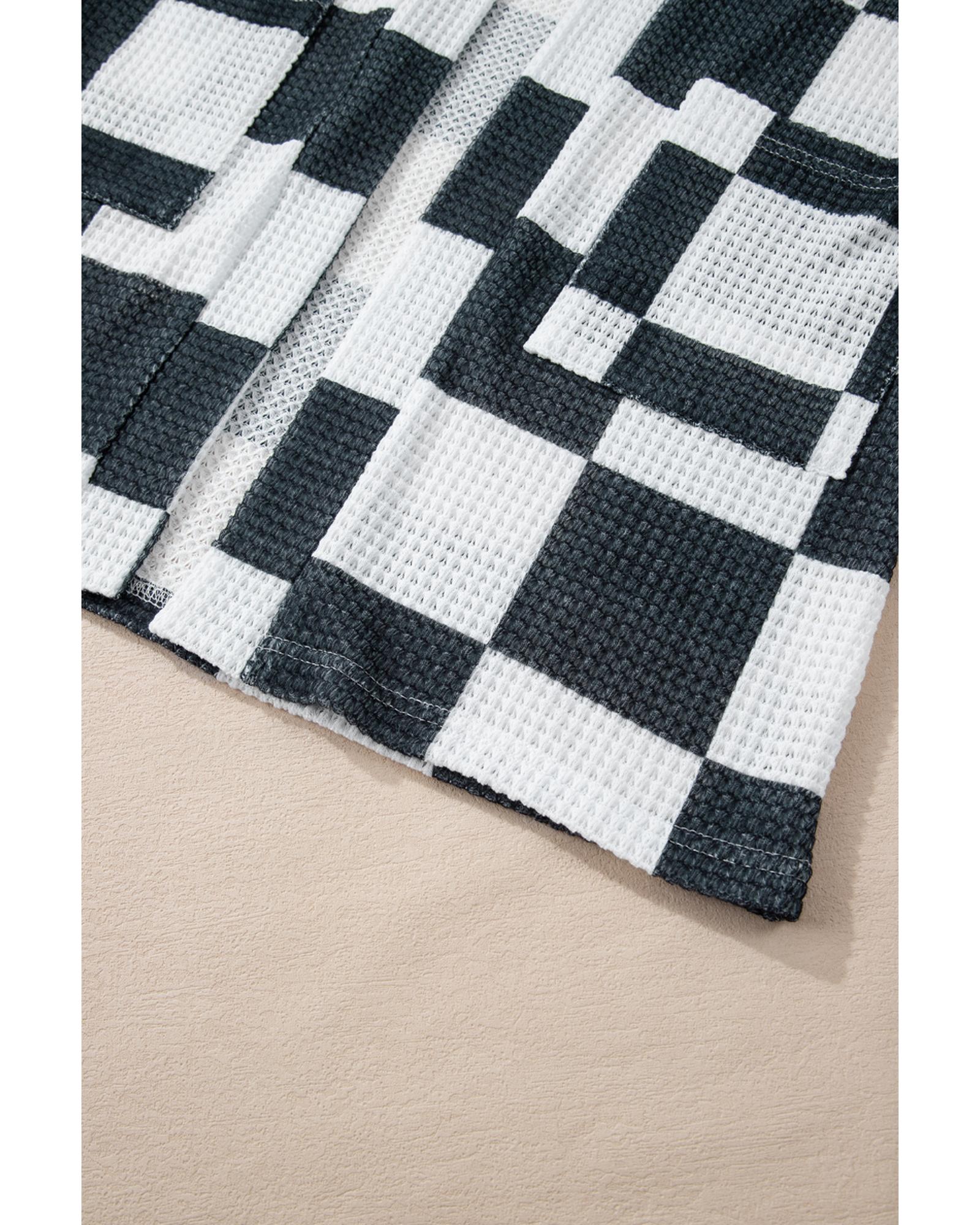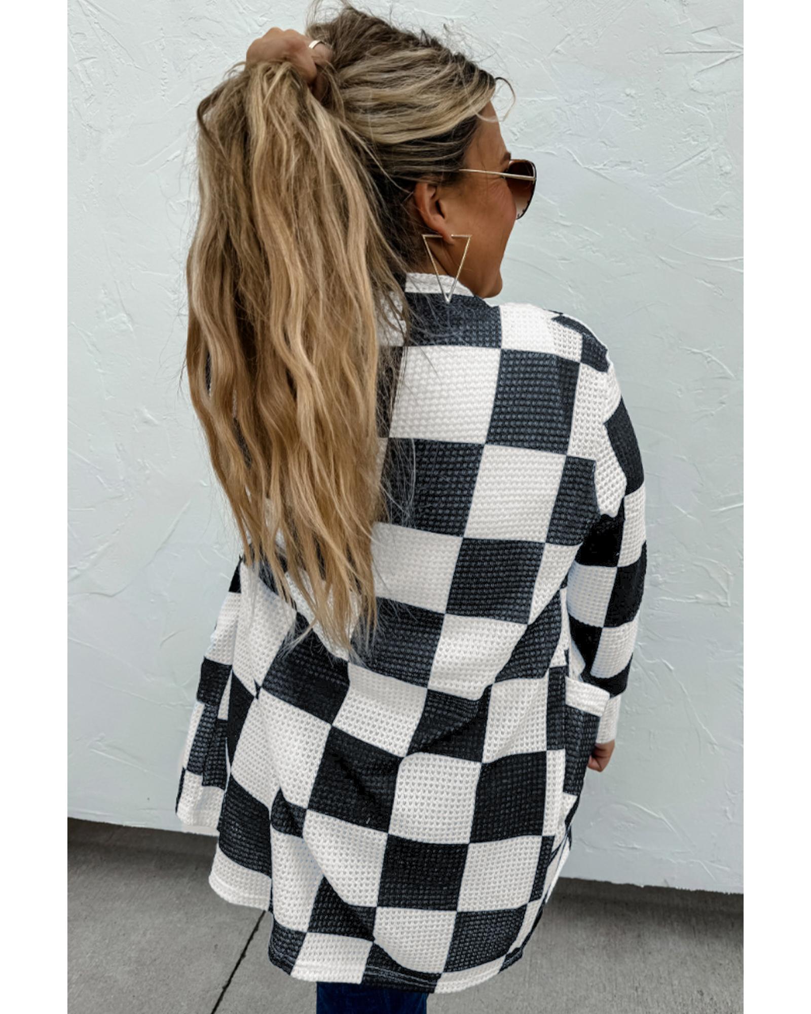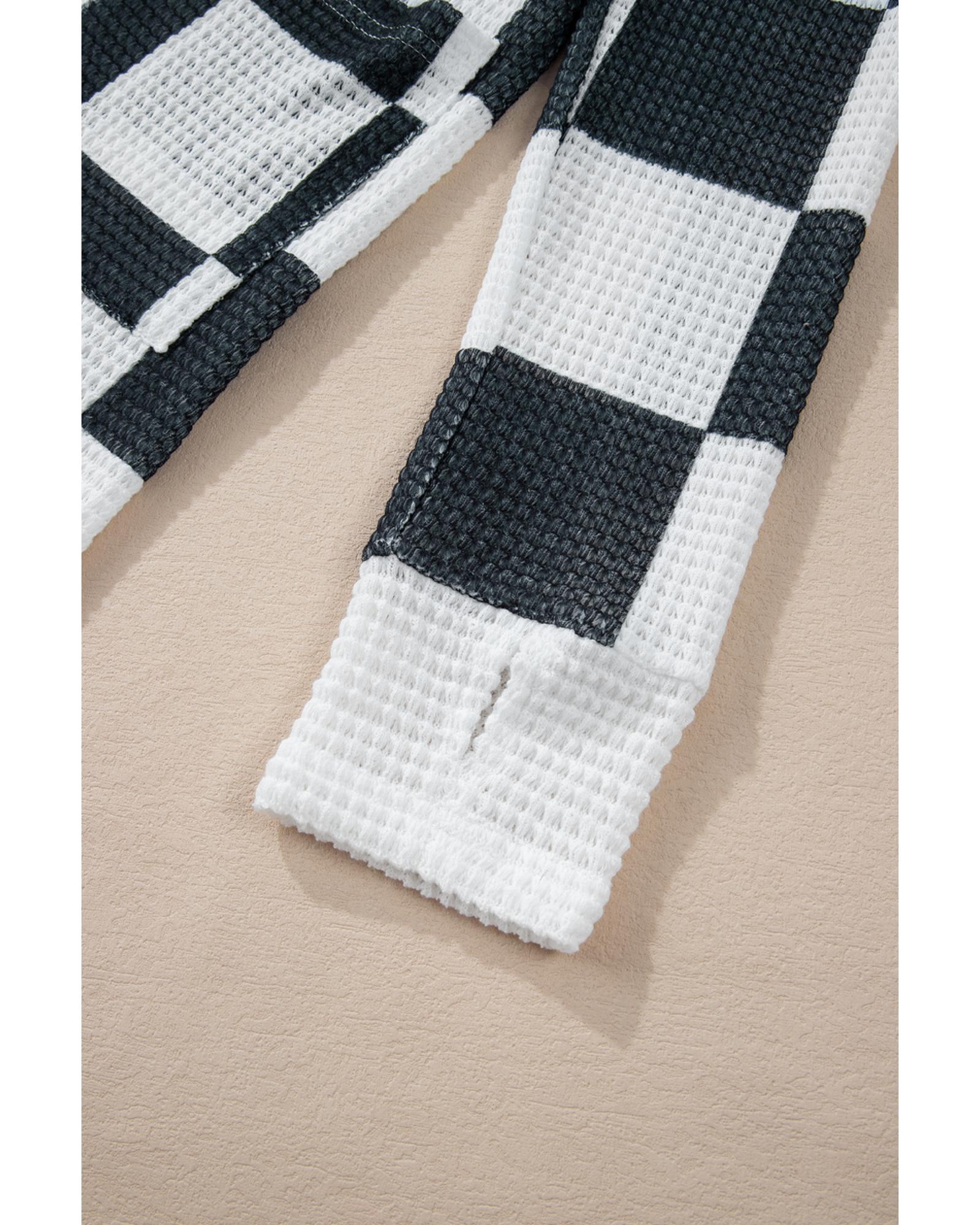 Black Checkered Waffle Knit Thumbhole Open Front Cardigan – S