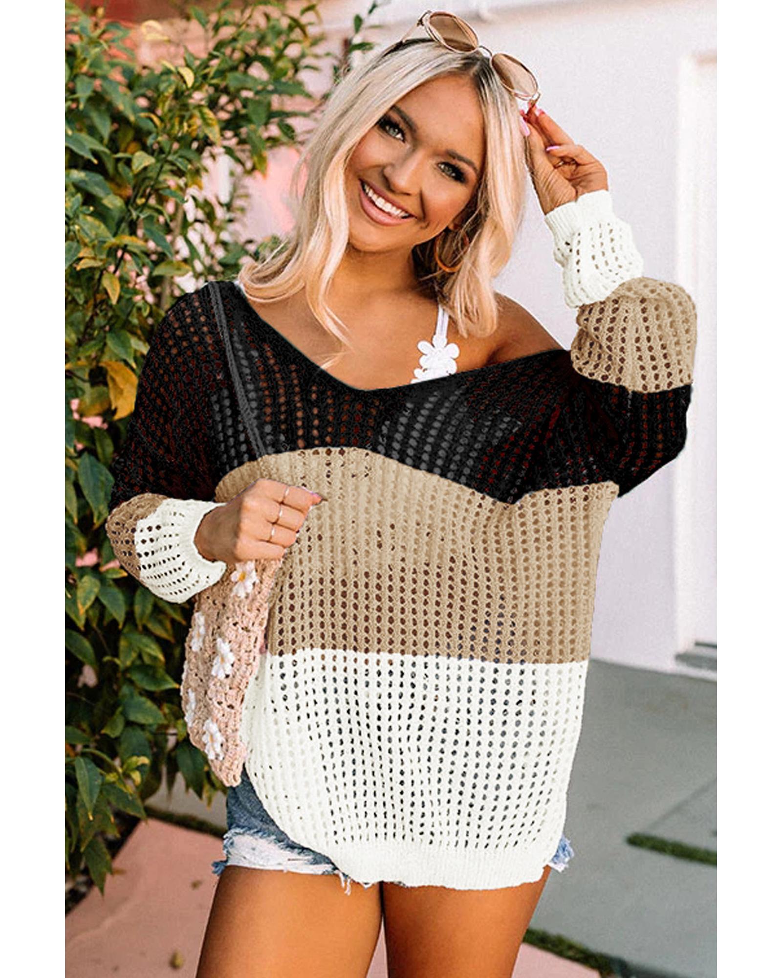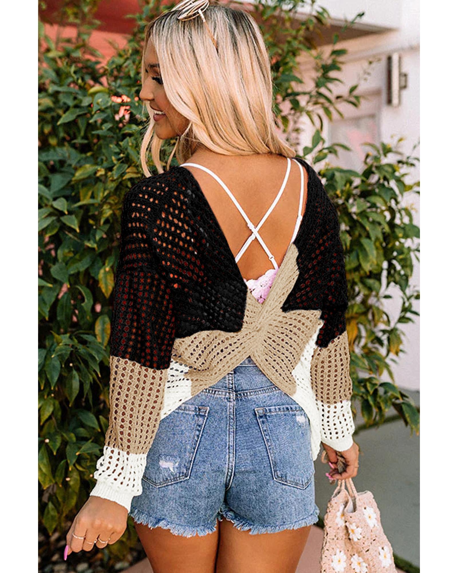 - Black color block eyelet long sleeve twisted back knit top