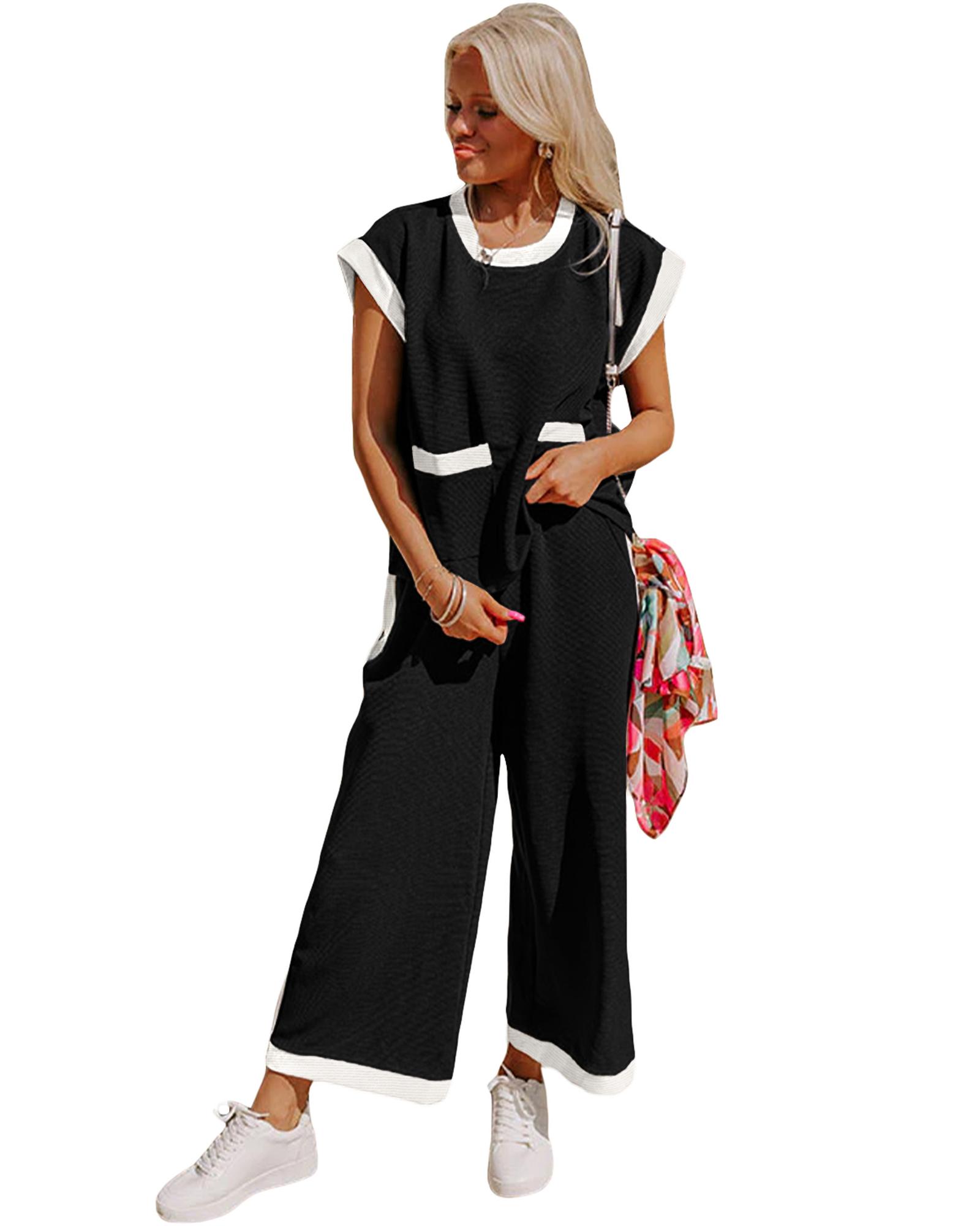 Black Color Block Pocketed T Shirt and Wide Leg Pants Set – L