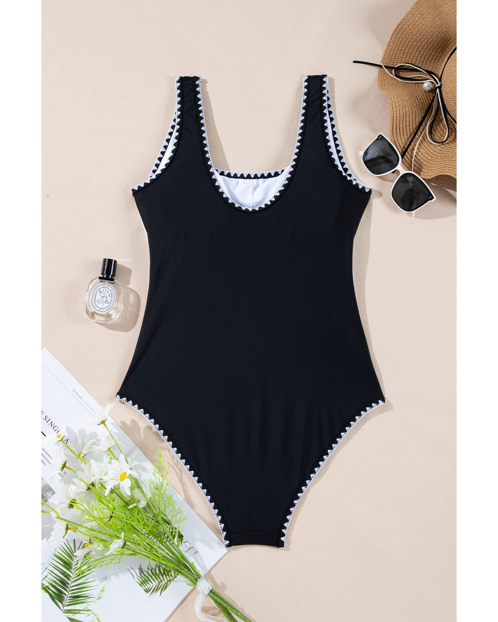 Black Color Block Ric Rac Trim U Neck One Piece Swimsuit – M