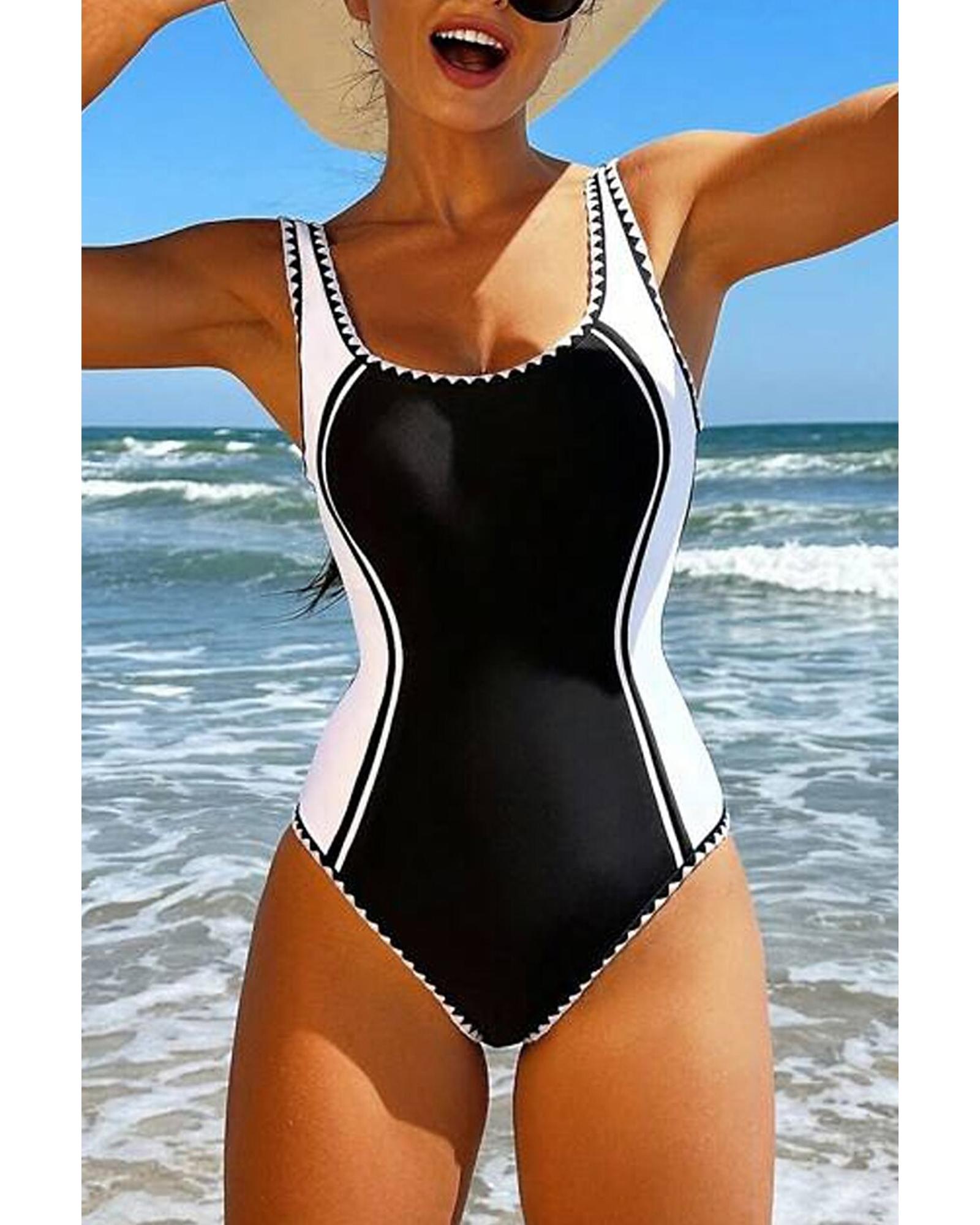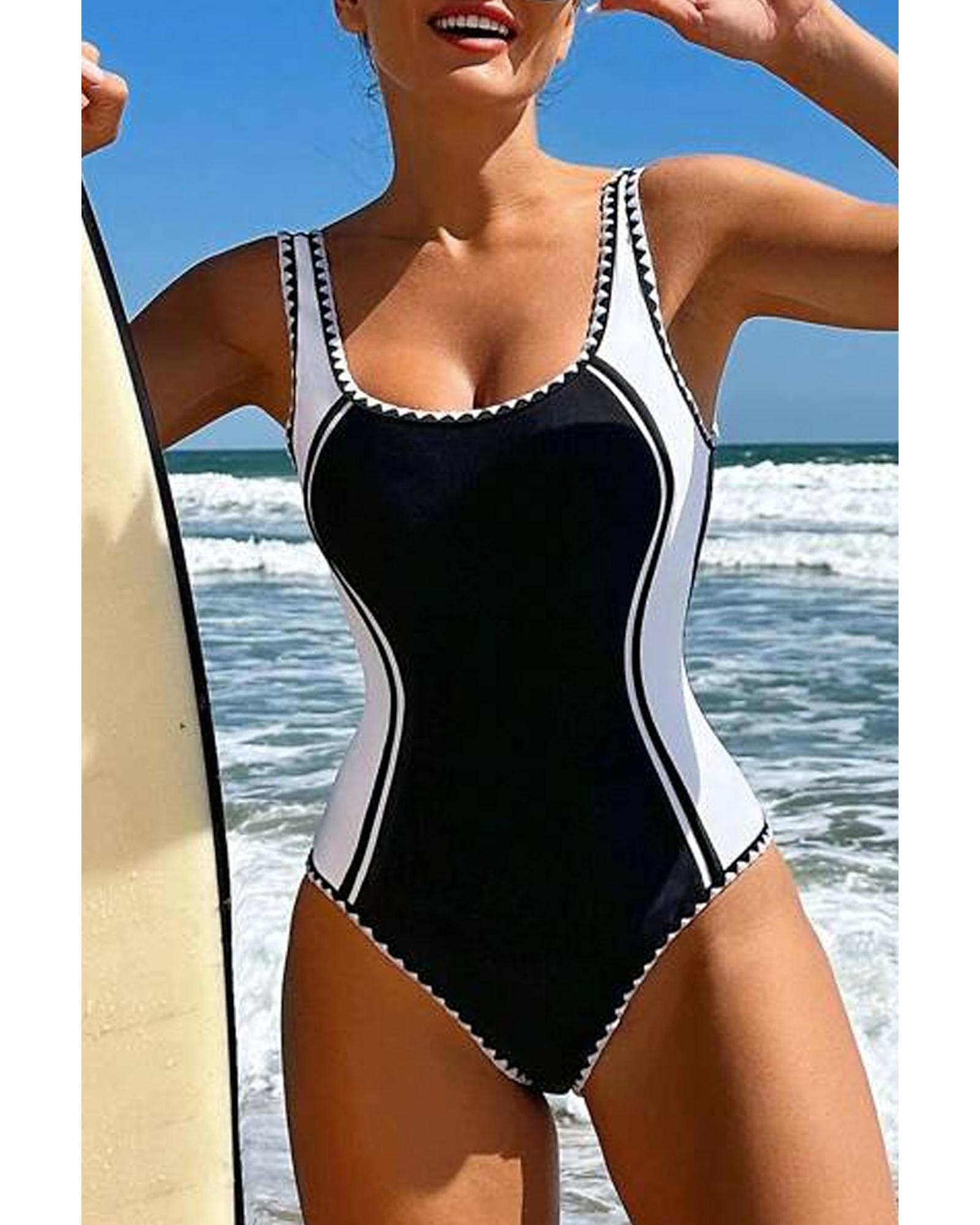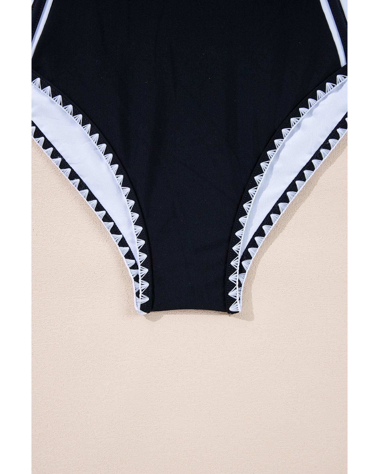 Black Color Block Ric Rac Trim U Neck One Piece Swimsuit – S