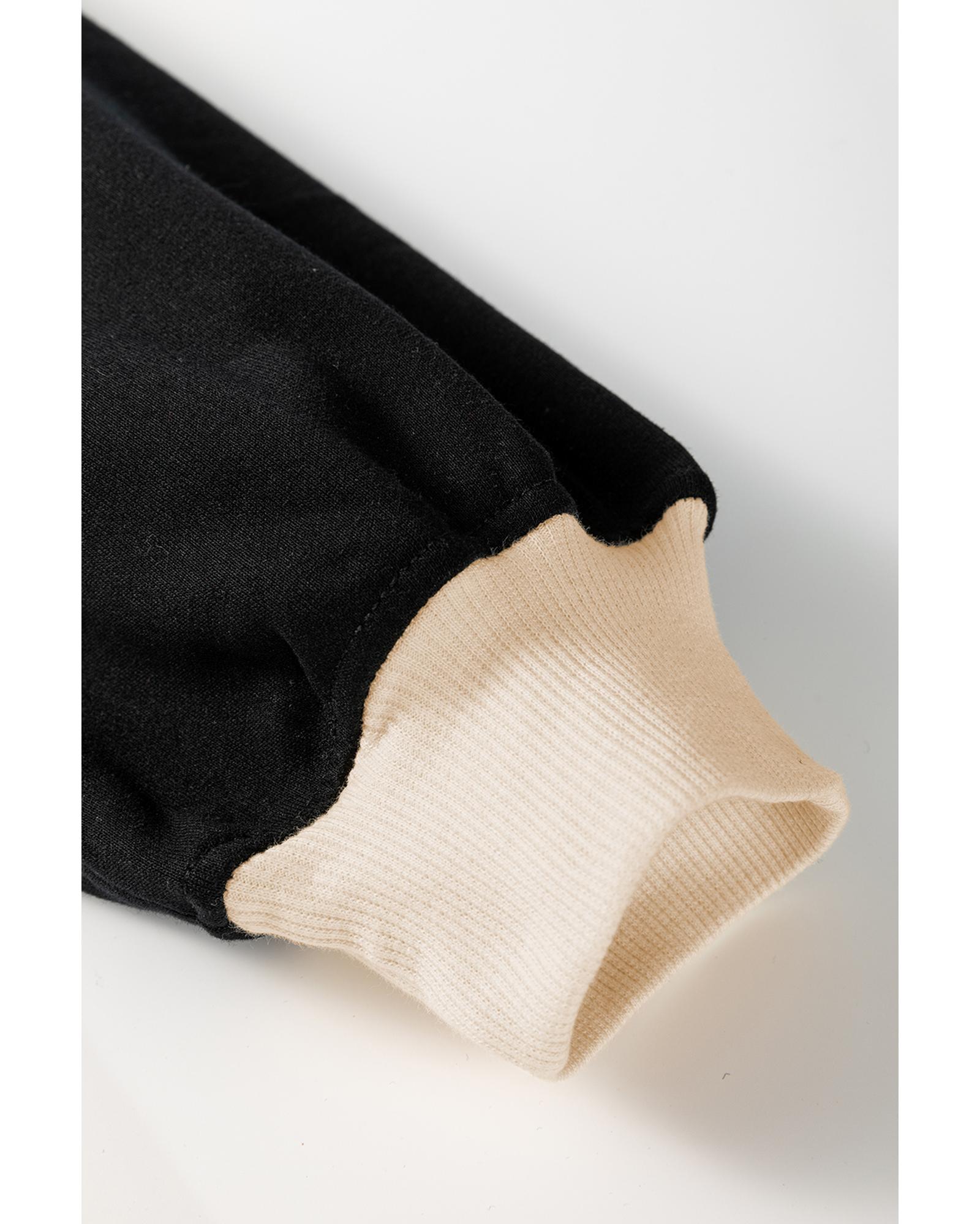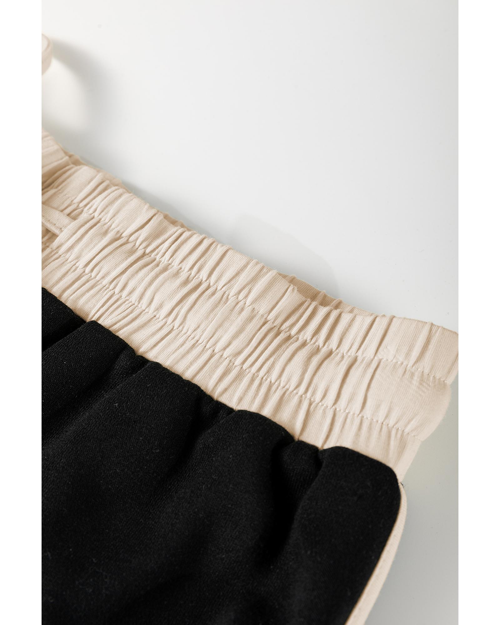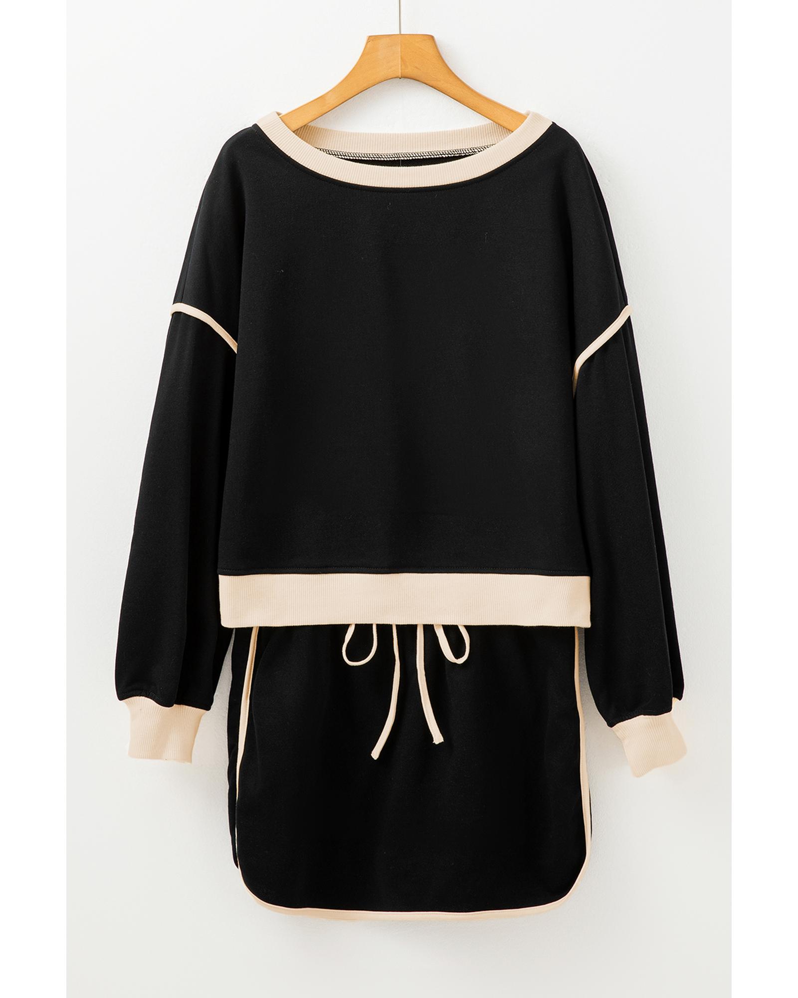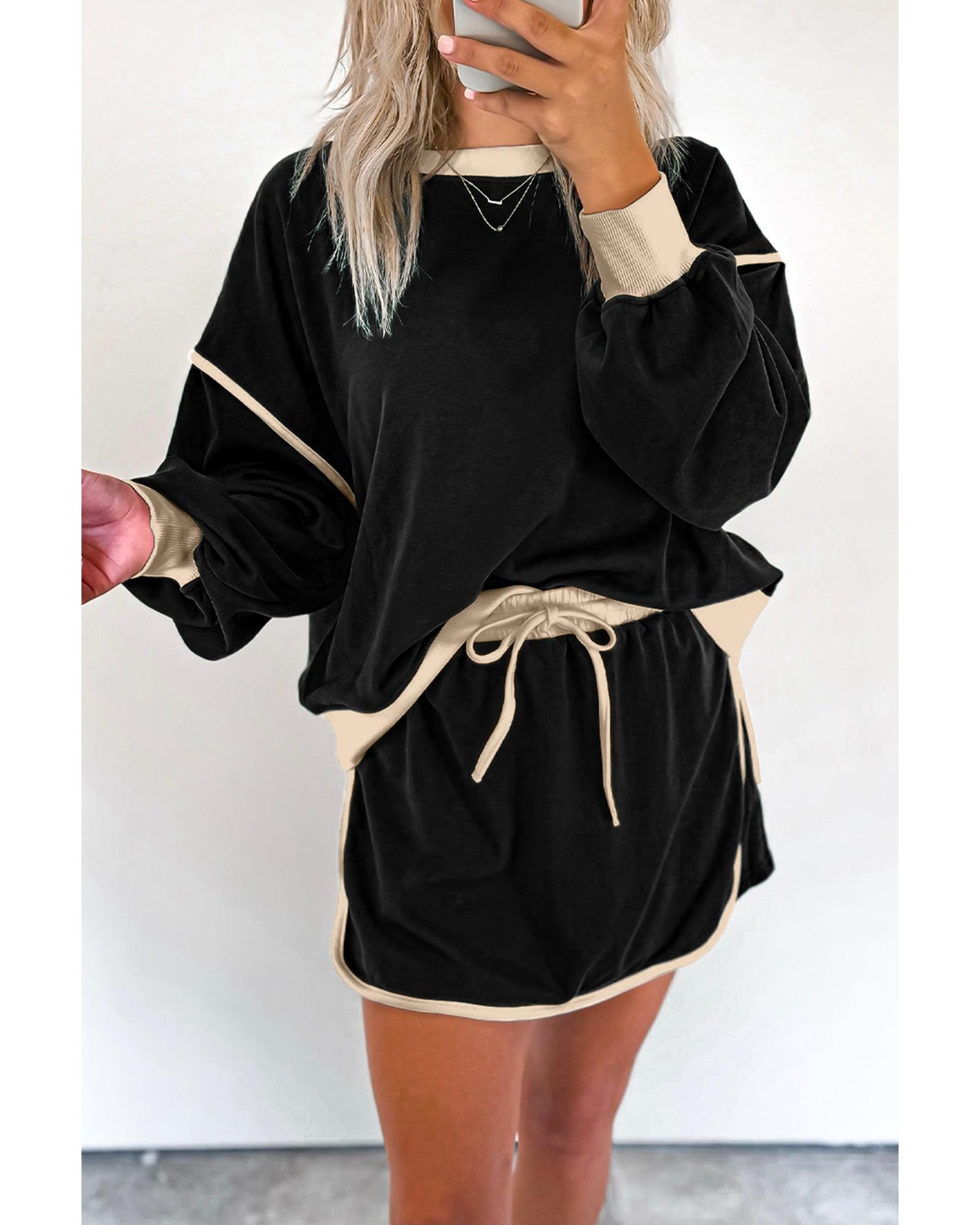 Black Color Contrast Loose Pullover and Lace-up Waist Skort Set - XL