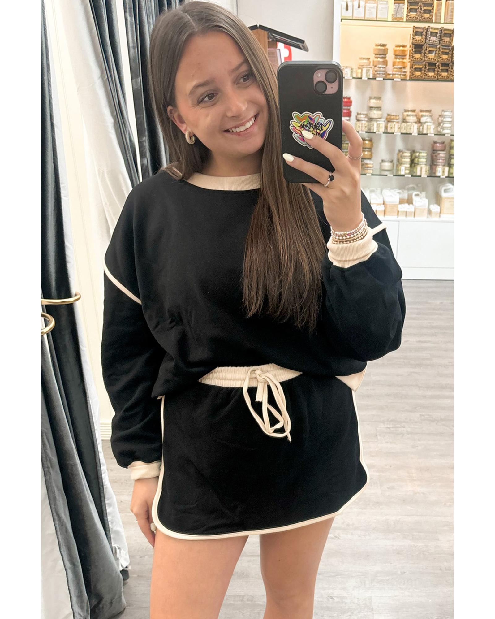 Black Color Contrast Loose Pullover and Lace-up Waist Skort Set – M