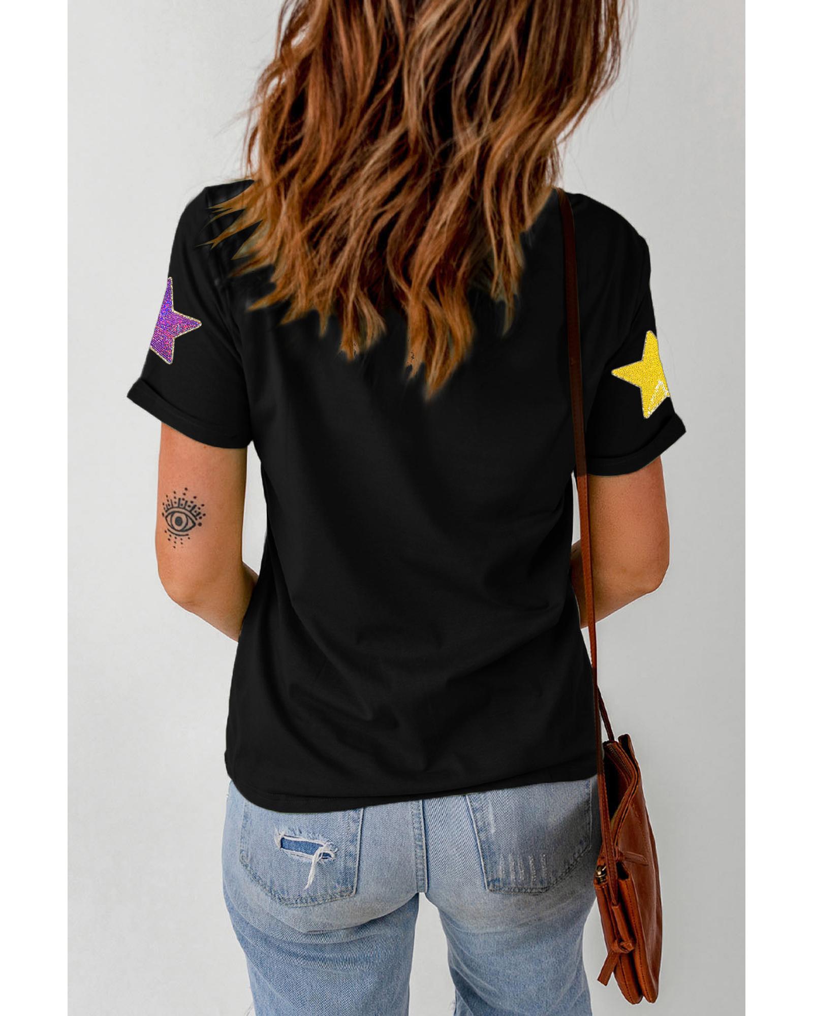 Black Colorful Sequin Stars Patched Relaxed T Shirt – 2XL