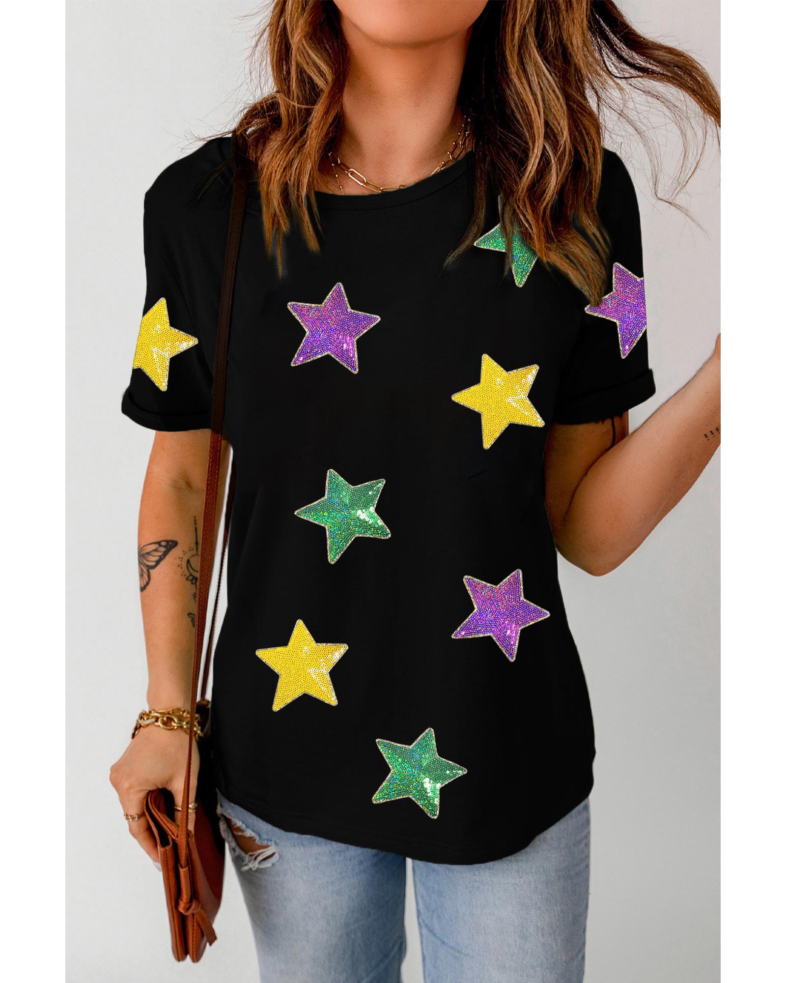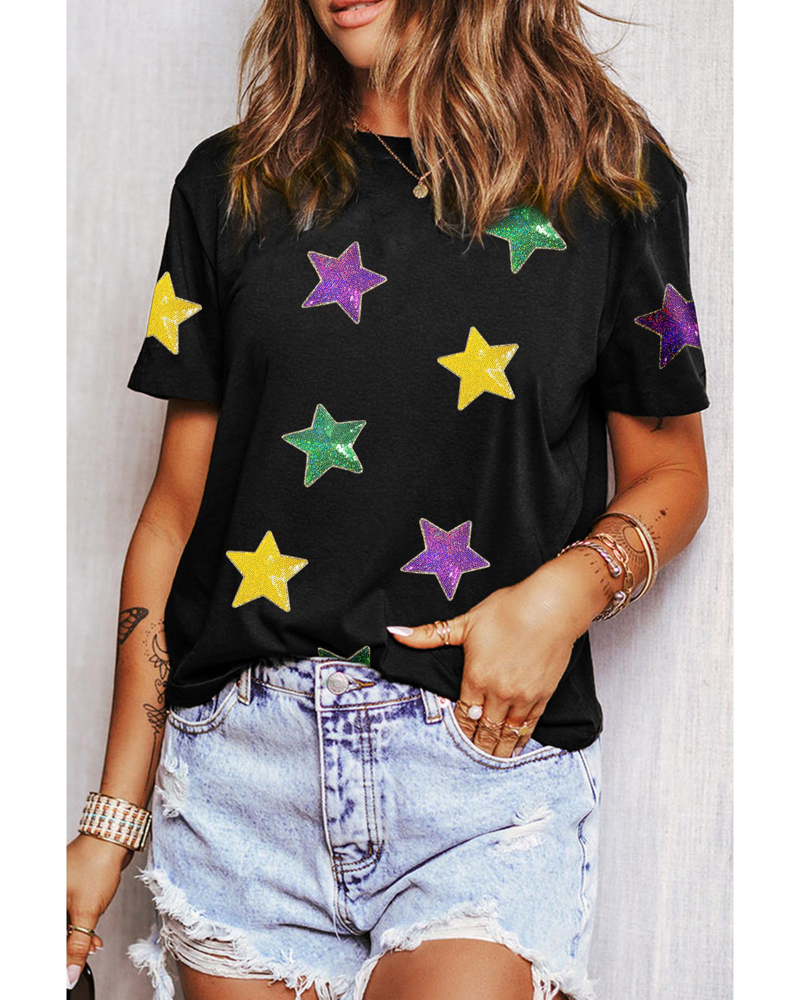 Black Colorful Sequin Stars Patched Relaxed T Shirt – M