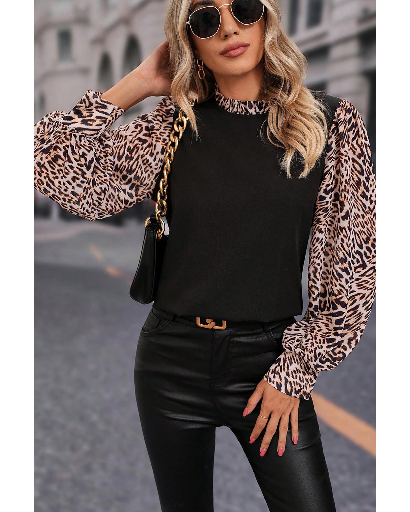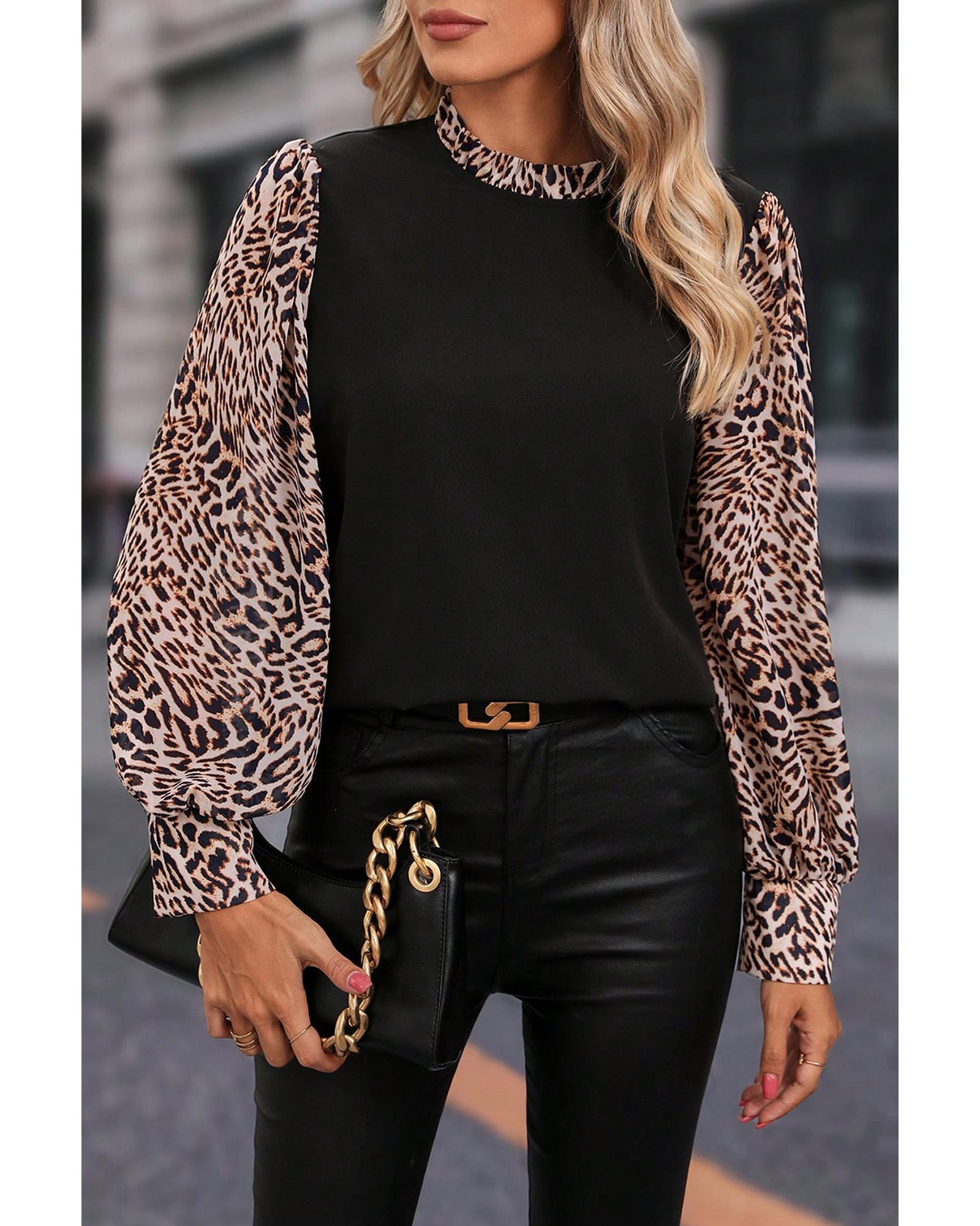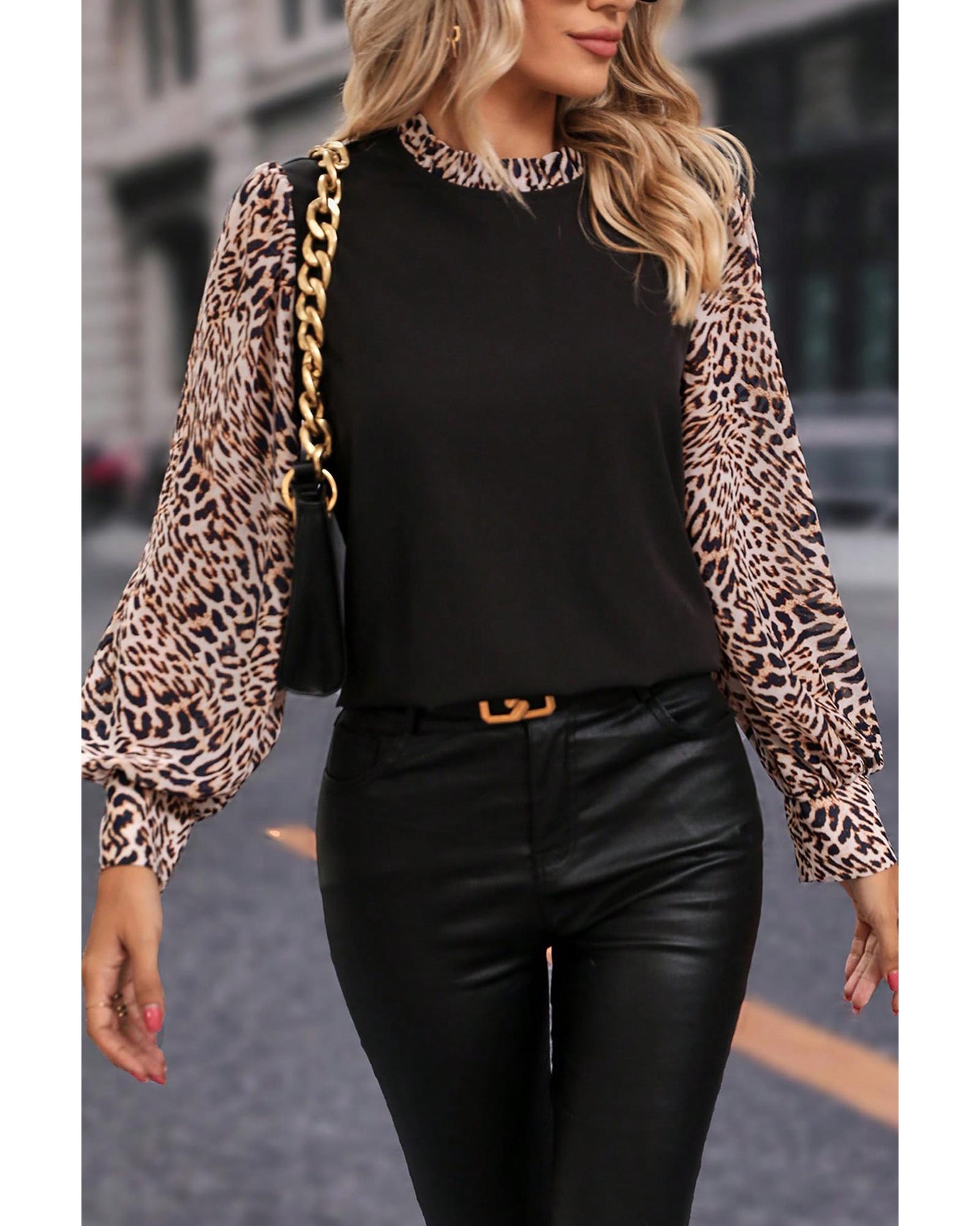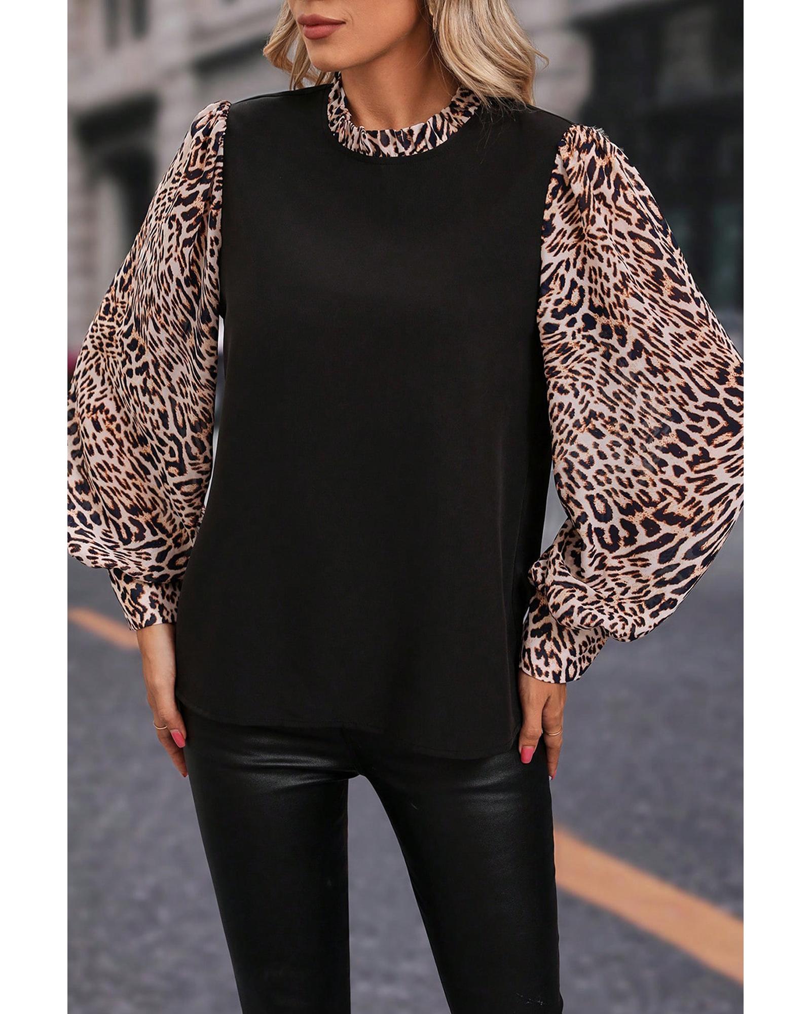 Black Contrast Leopard Print Lantern Sleeve Blouse – S