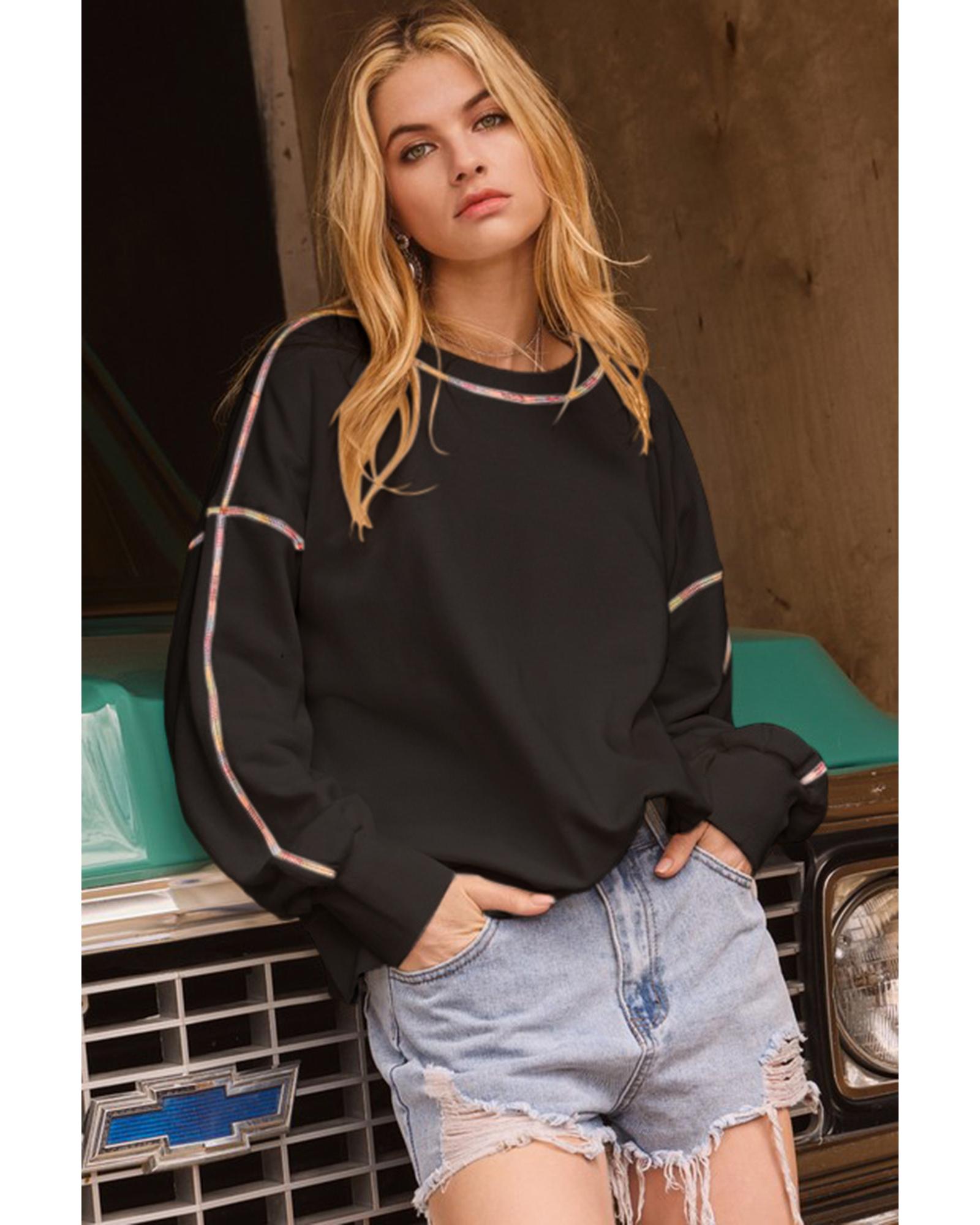 Black Contrast Rainbow Trim Drop Shoulder Pullover Sweatshirt – S