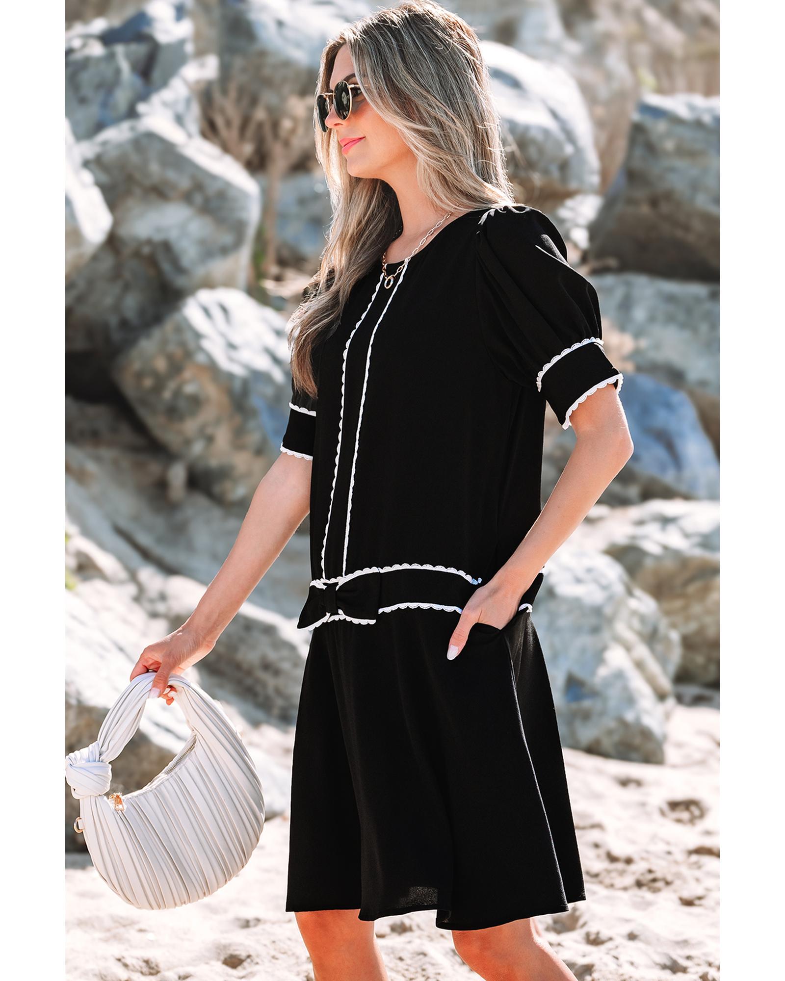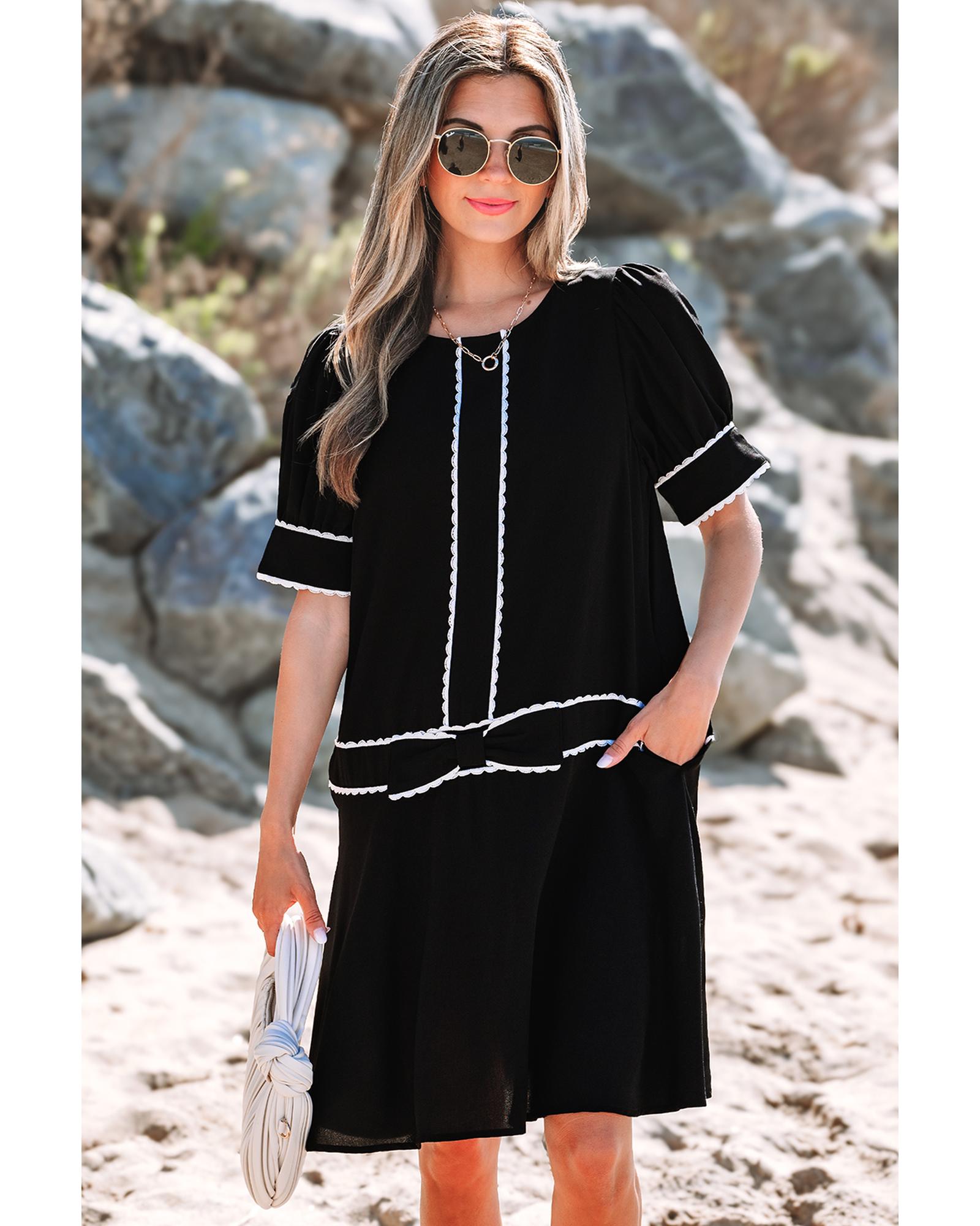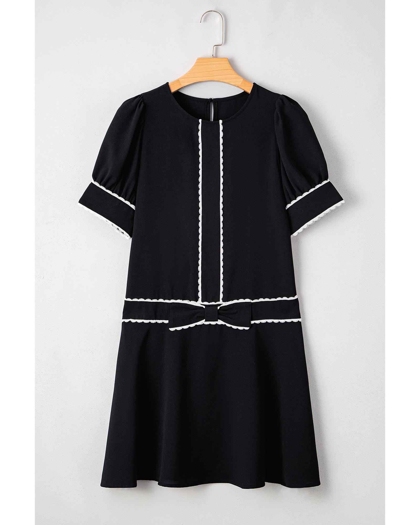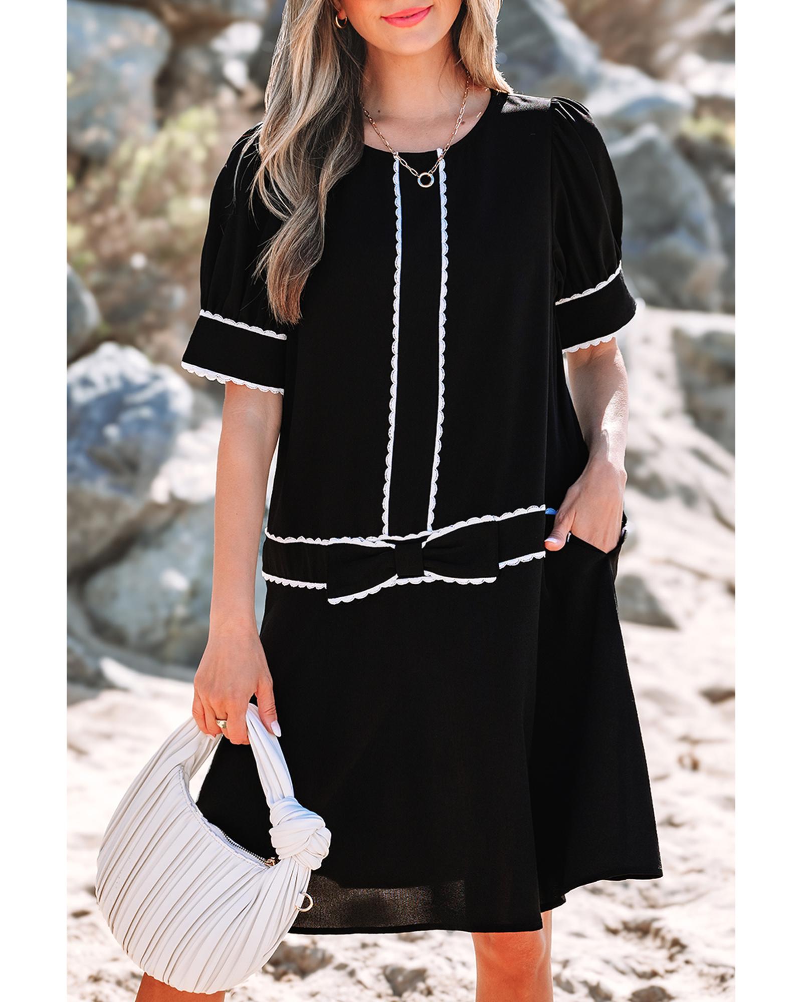 Black Contrast Scallop Trim Bow Detail Half Sleeve Shift Dress – S