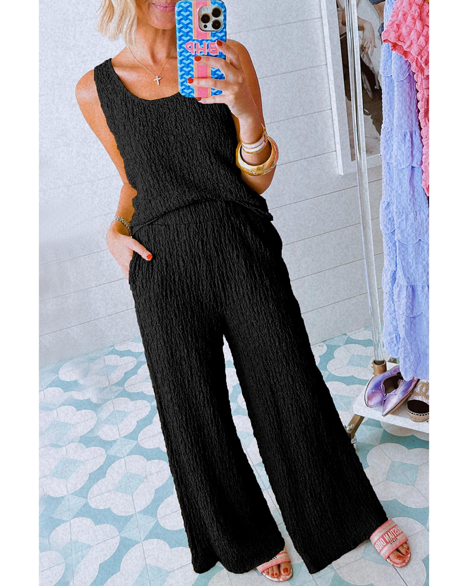 Black Crinkled U Neck Tank Top and Wide Leg Pants Set – XL