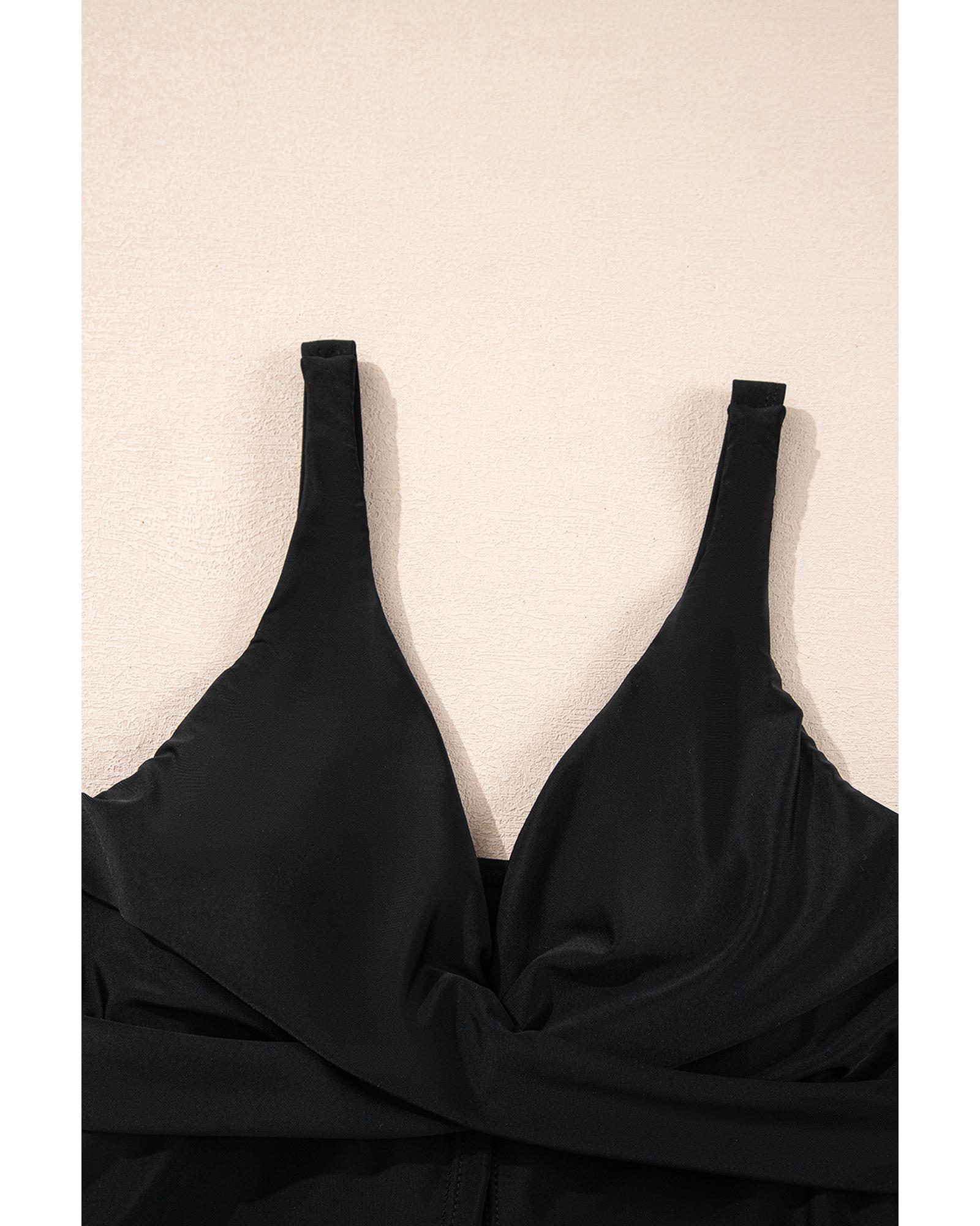 Black Crossed V Neck Adjustable Strap Babydoll Tankini Top – S