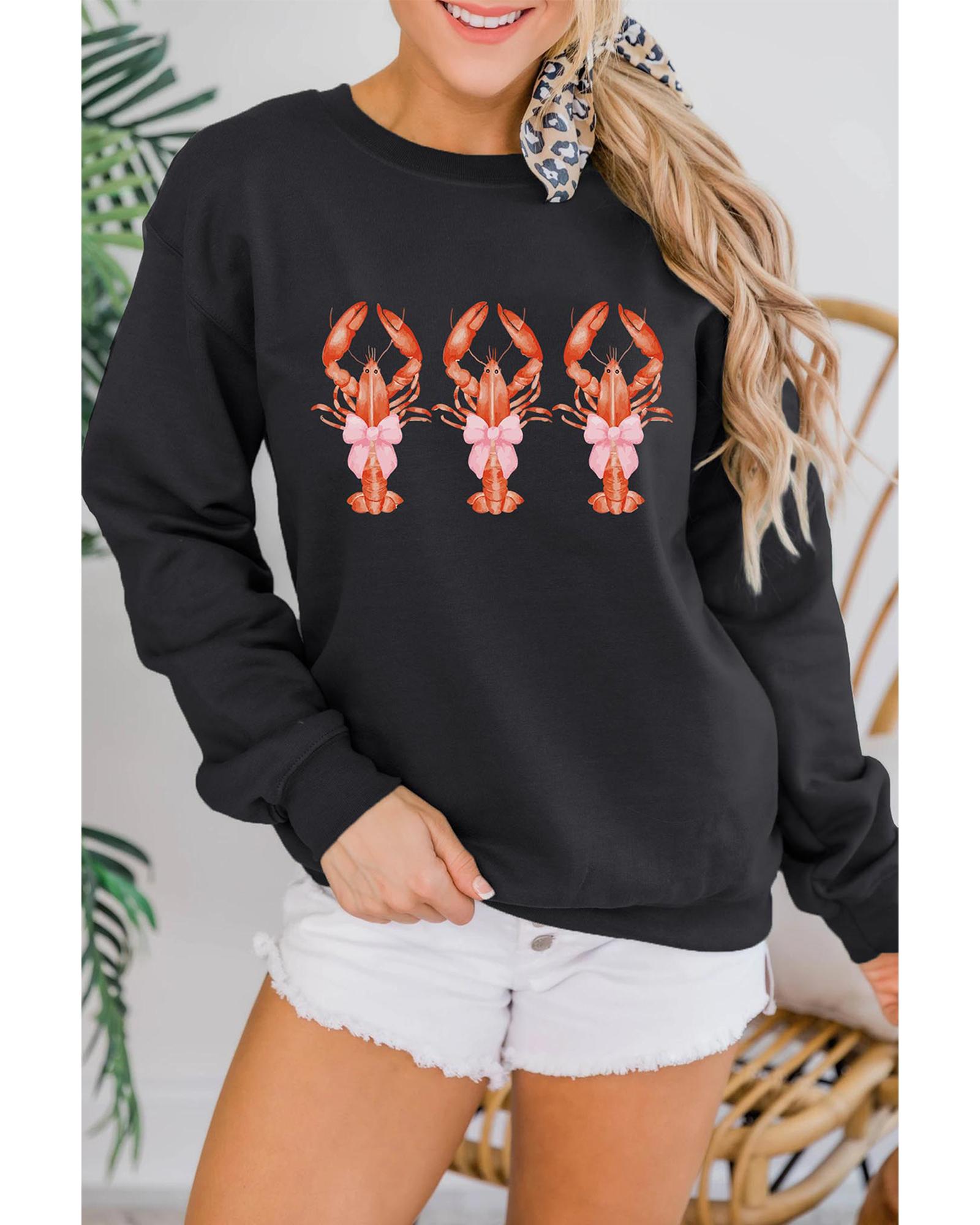 - Black cute bow crawfish printed drop shoulder sweatshirt