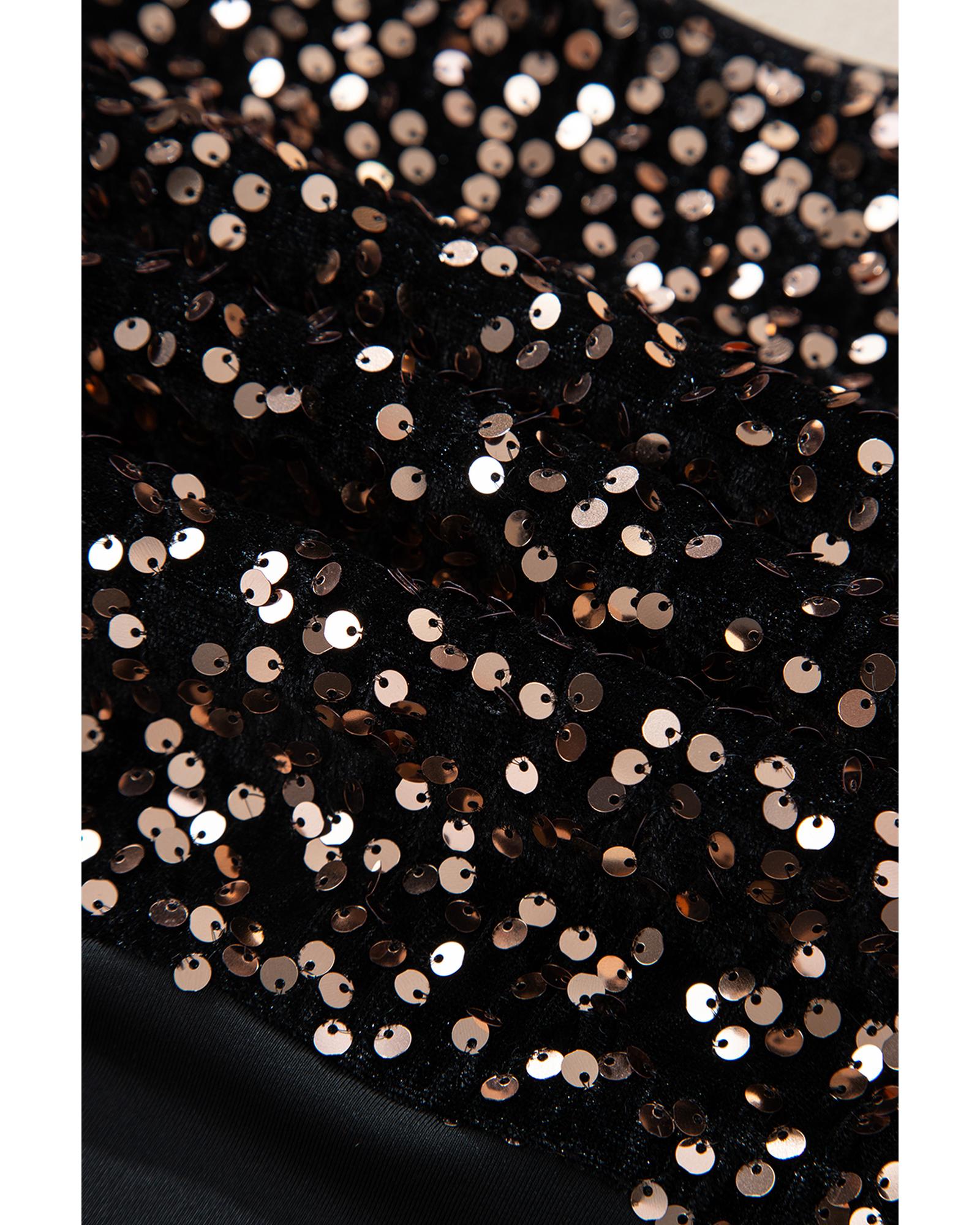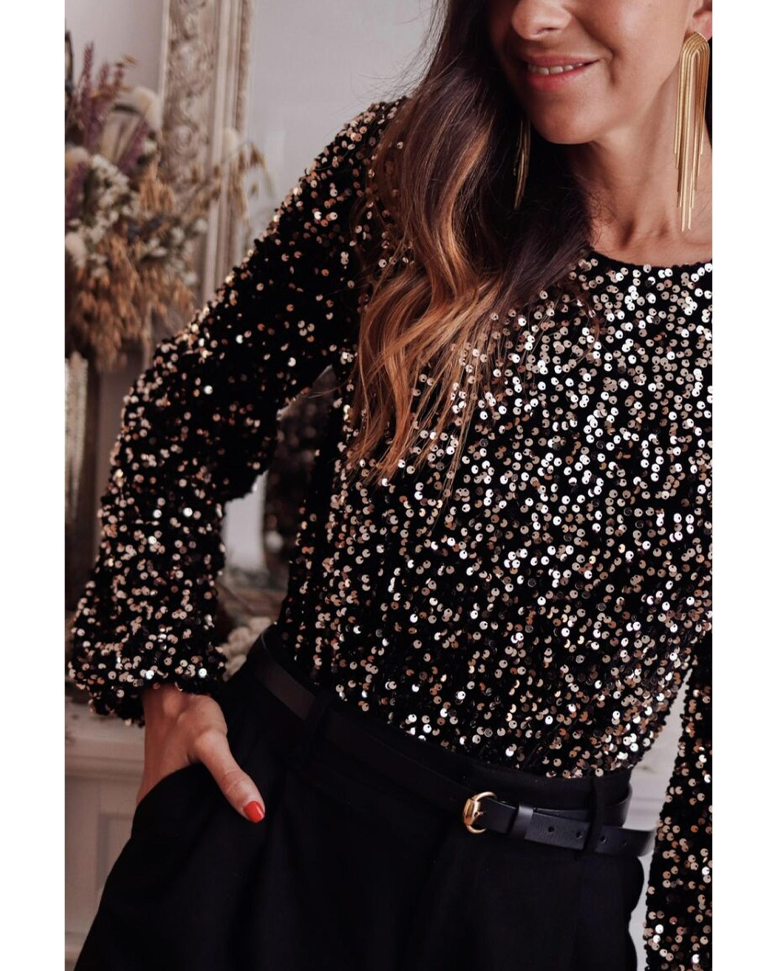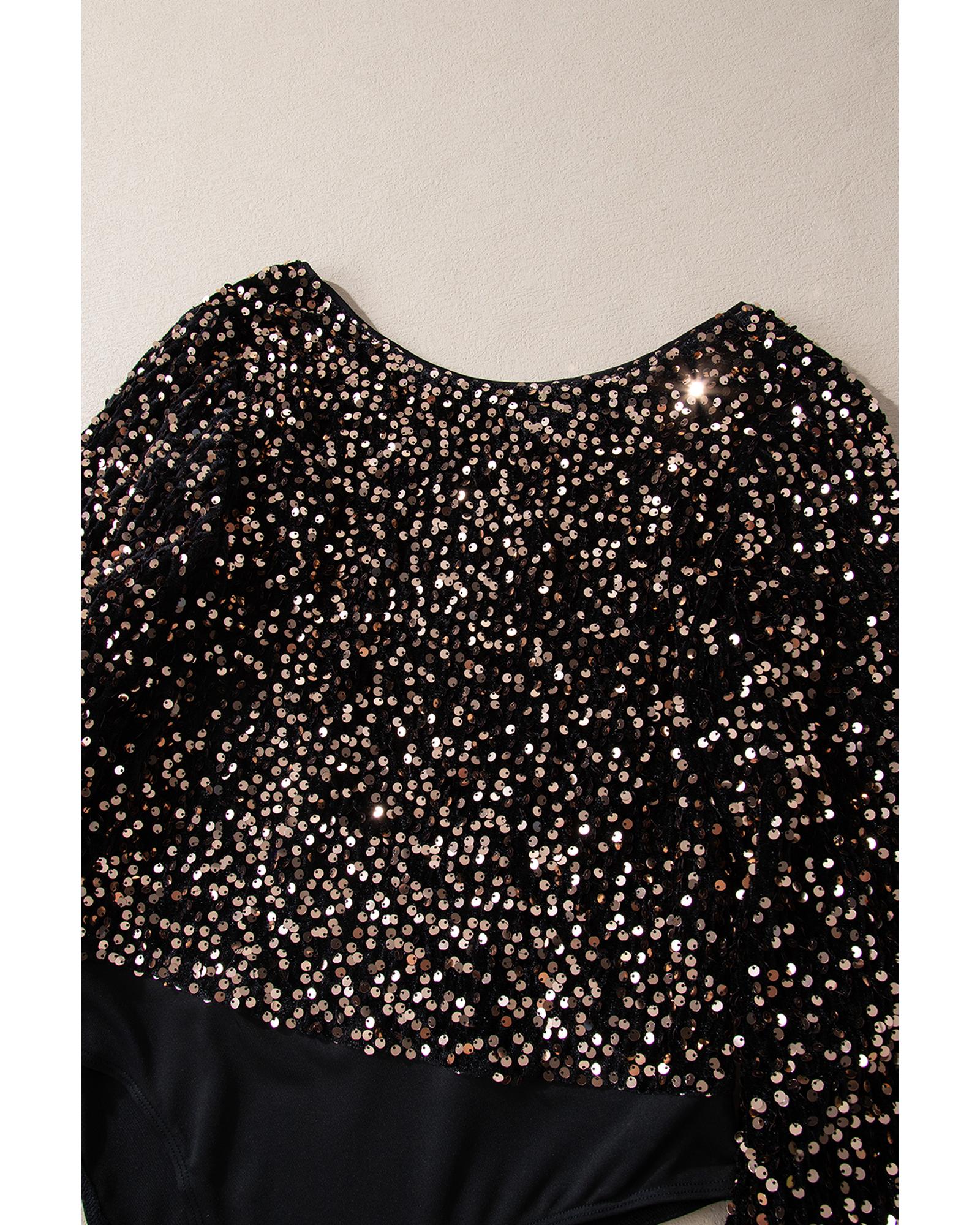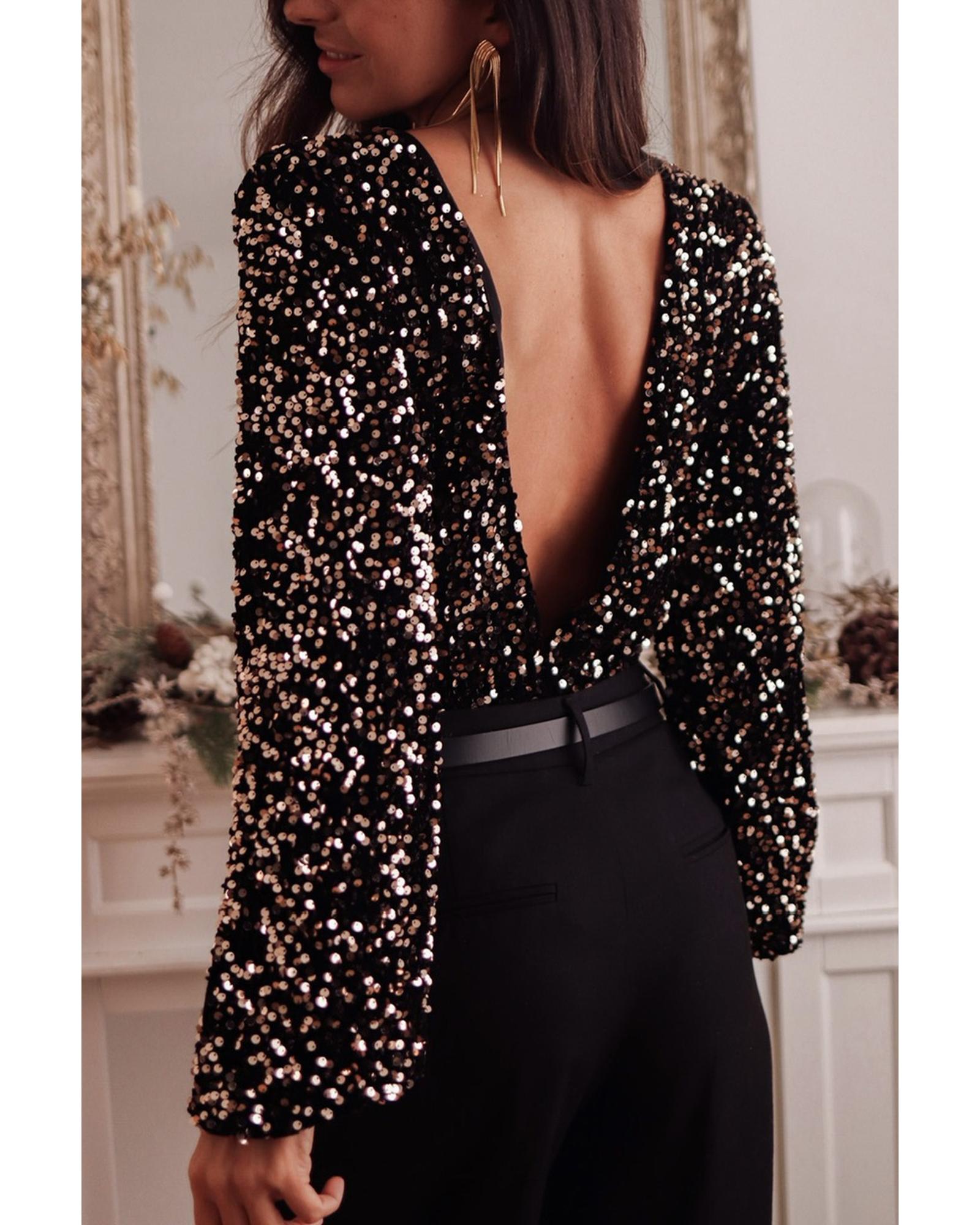Black Deep V Back Sequin Puff Sleeve Bodysuit – M