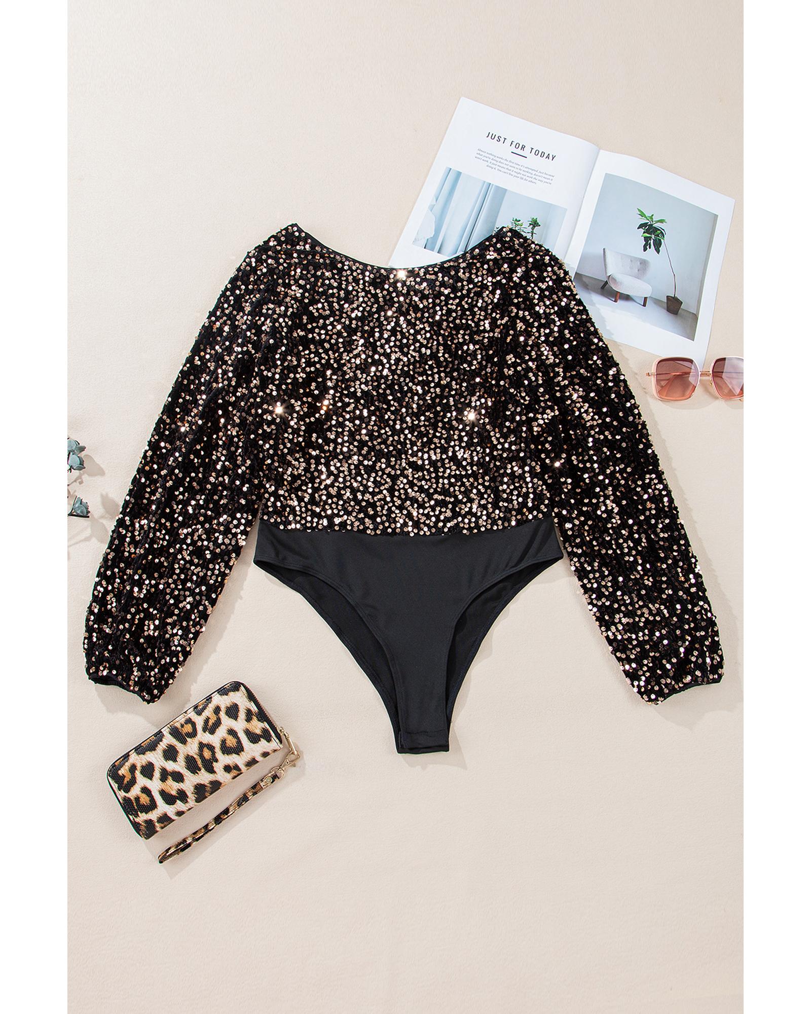 Black Deep V Back Sequin Puff Sleeve Bodysuit – XL
