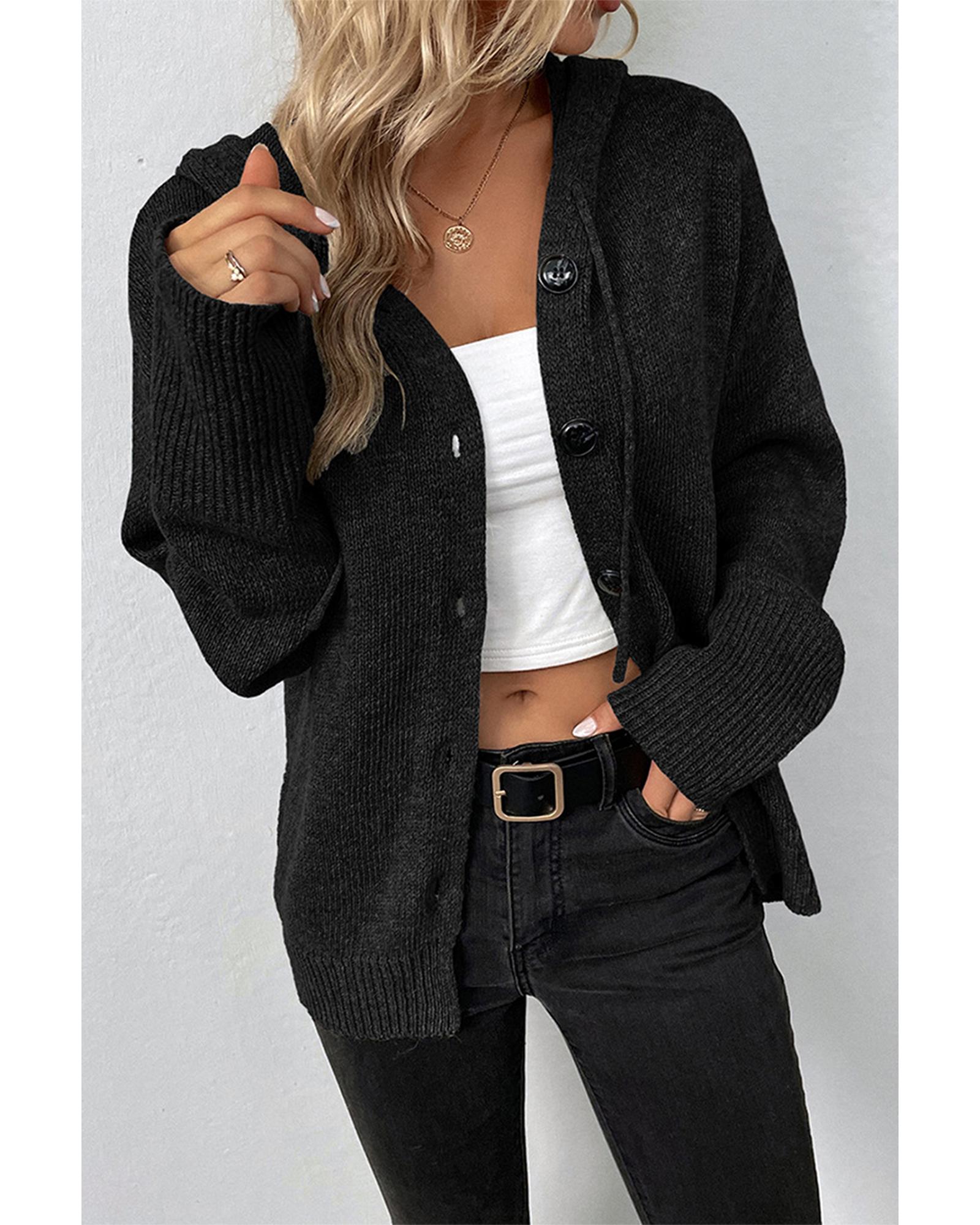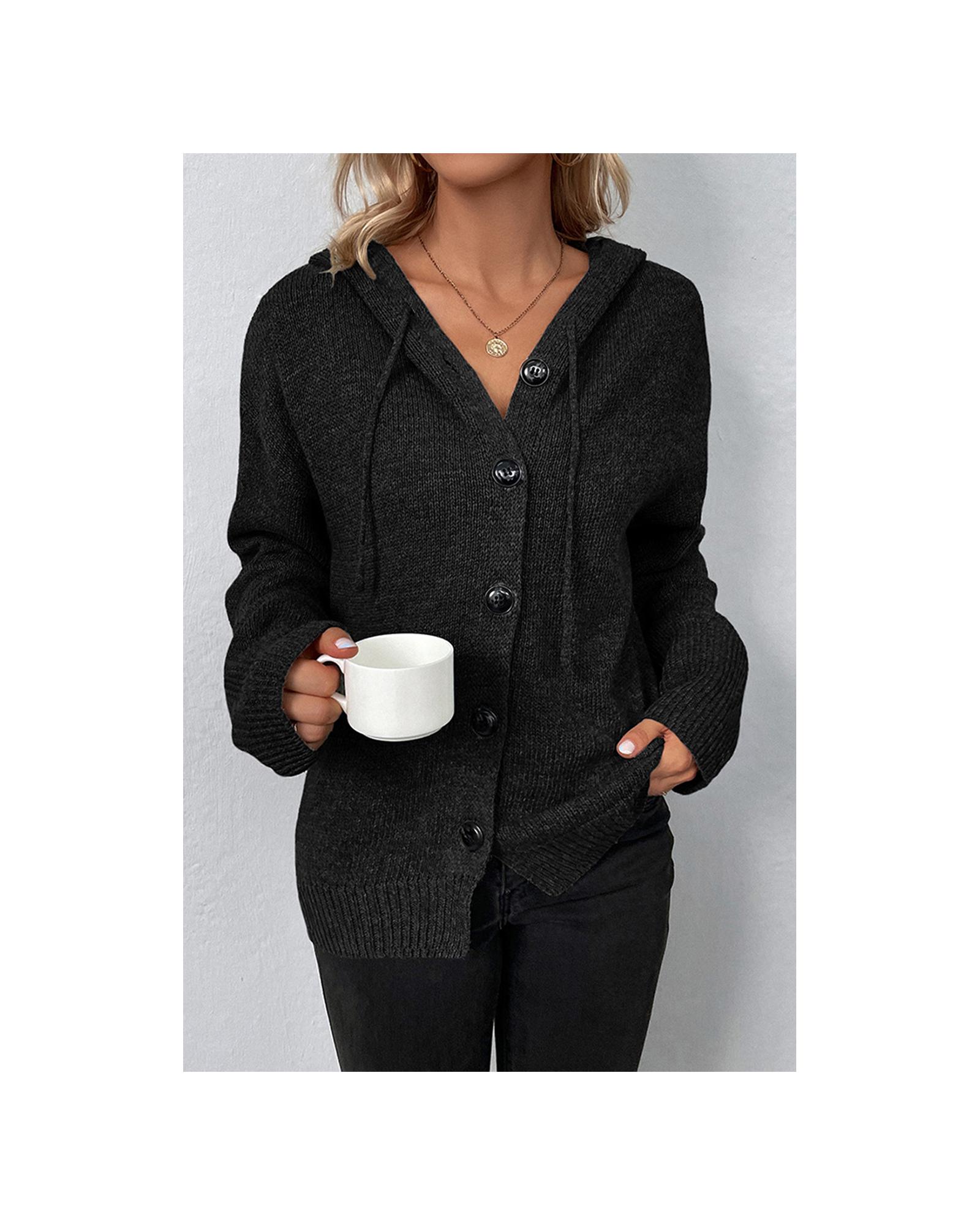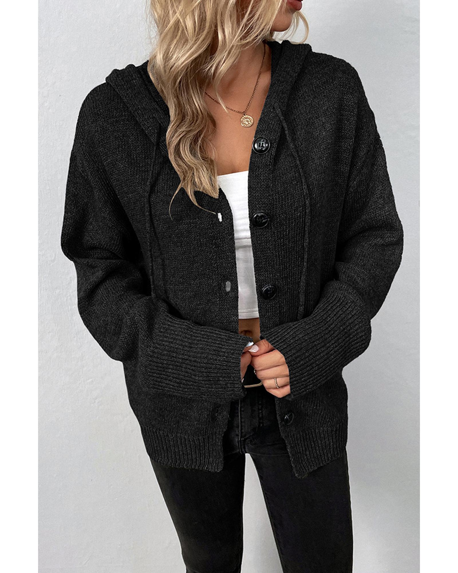 Black Drawstring Hooded Button Up Drop Shoulder Sweater Cardigan – S