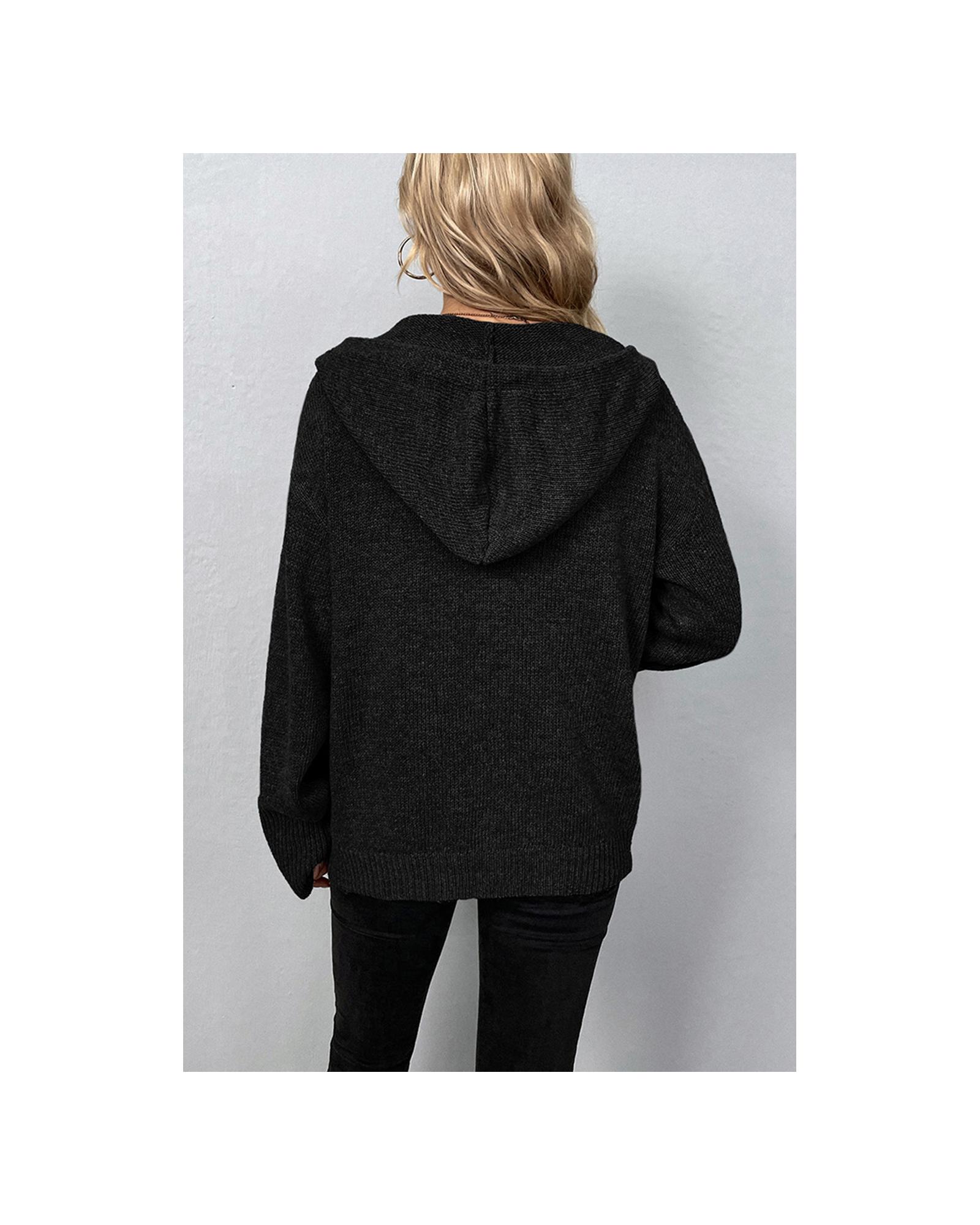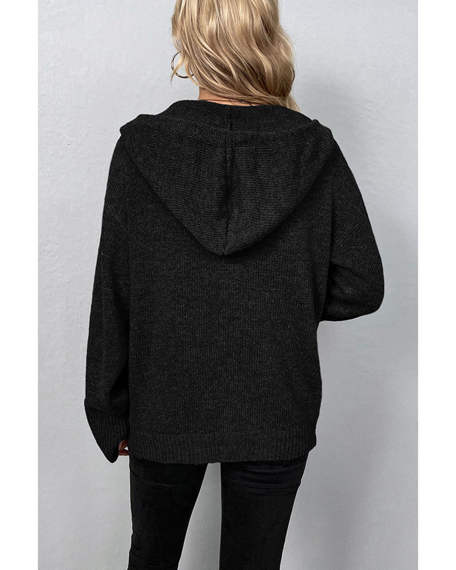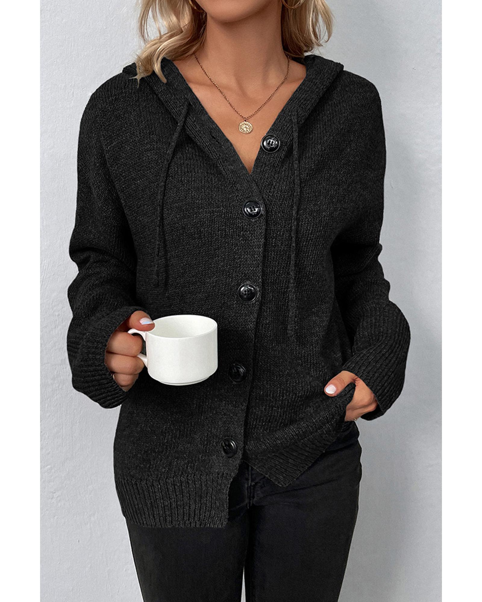 Black Drawstring Hooded Button Up Drop Shoulder Sweater Cardigan – S
