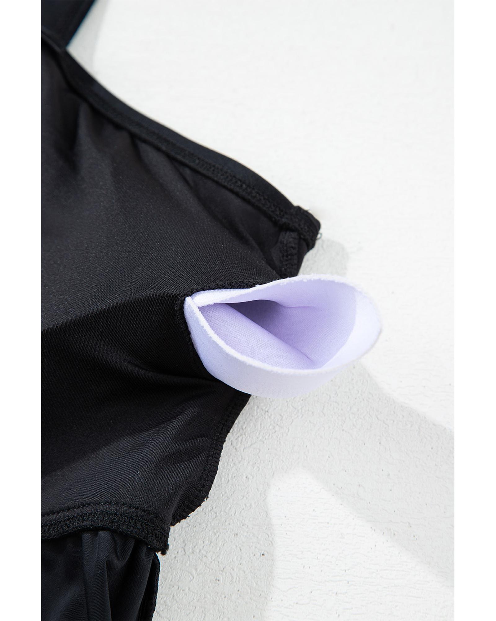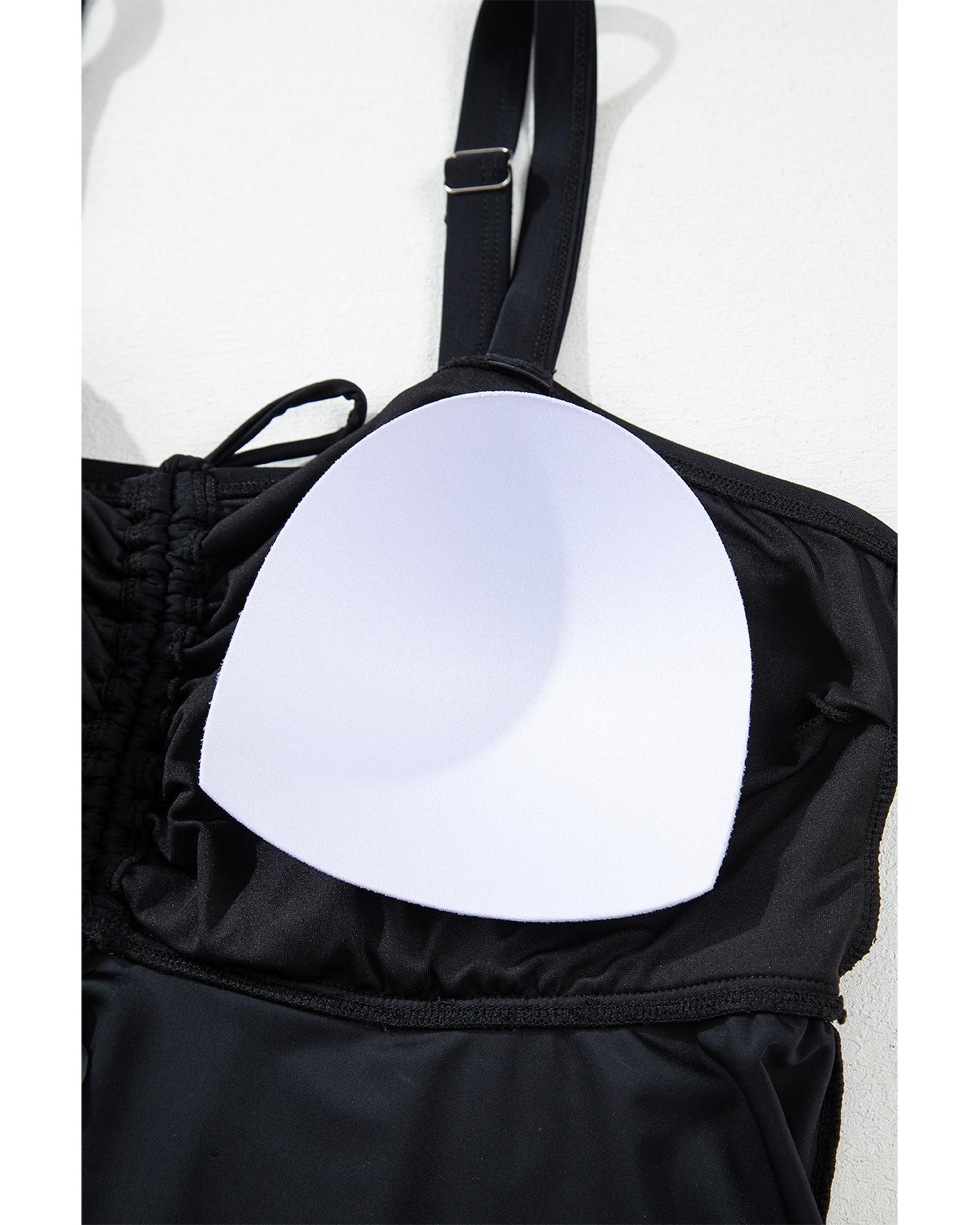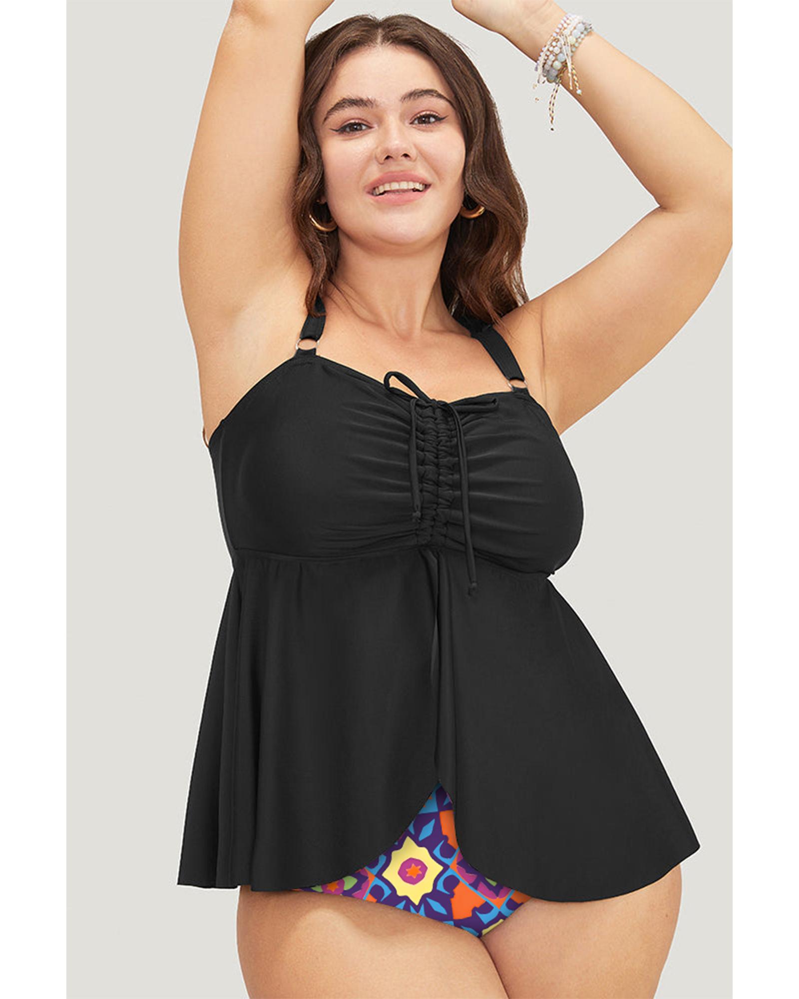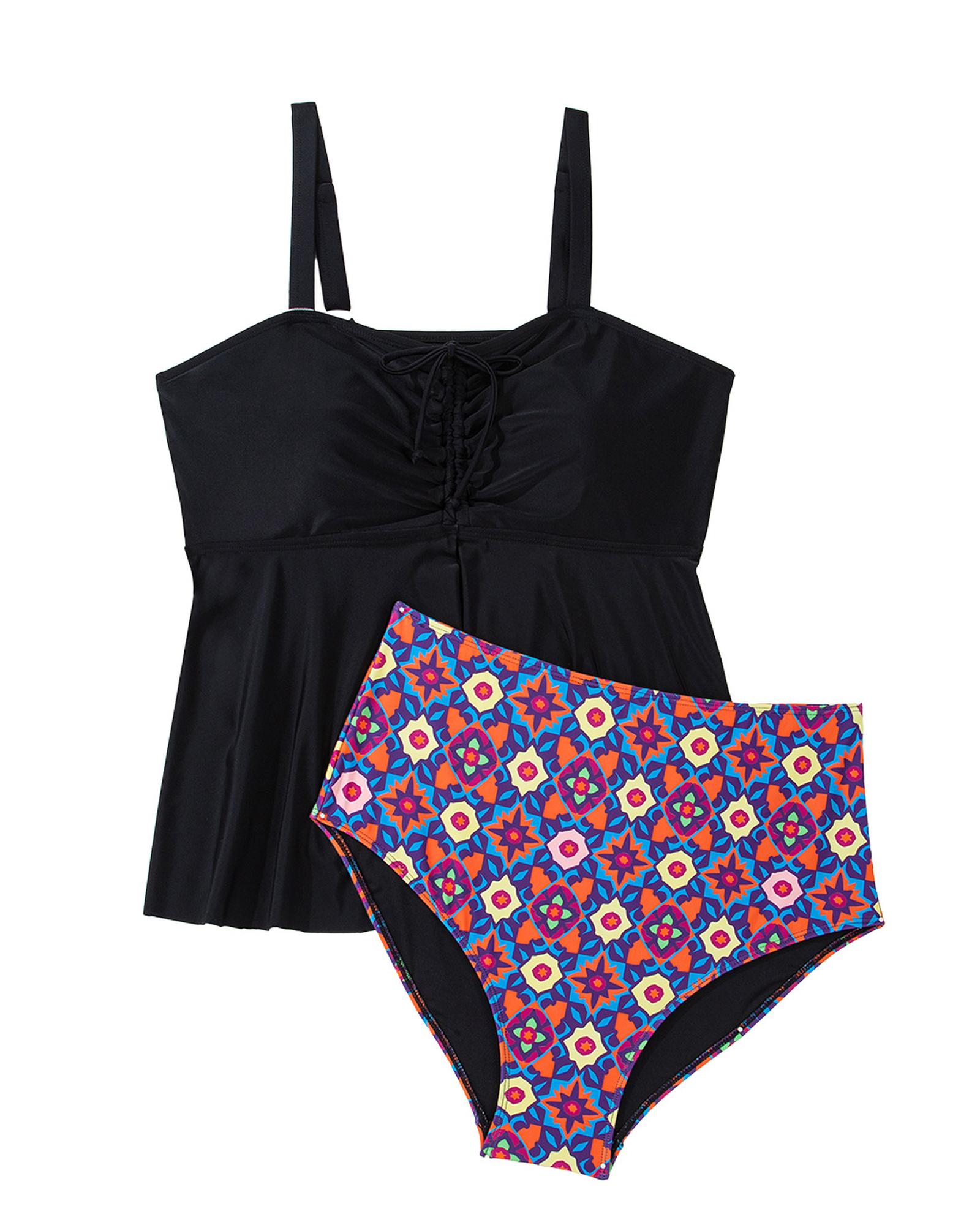Black Drawstring Tied Front Flared Top Geometric Print Bottom Plus Size Tankinis – 2X