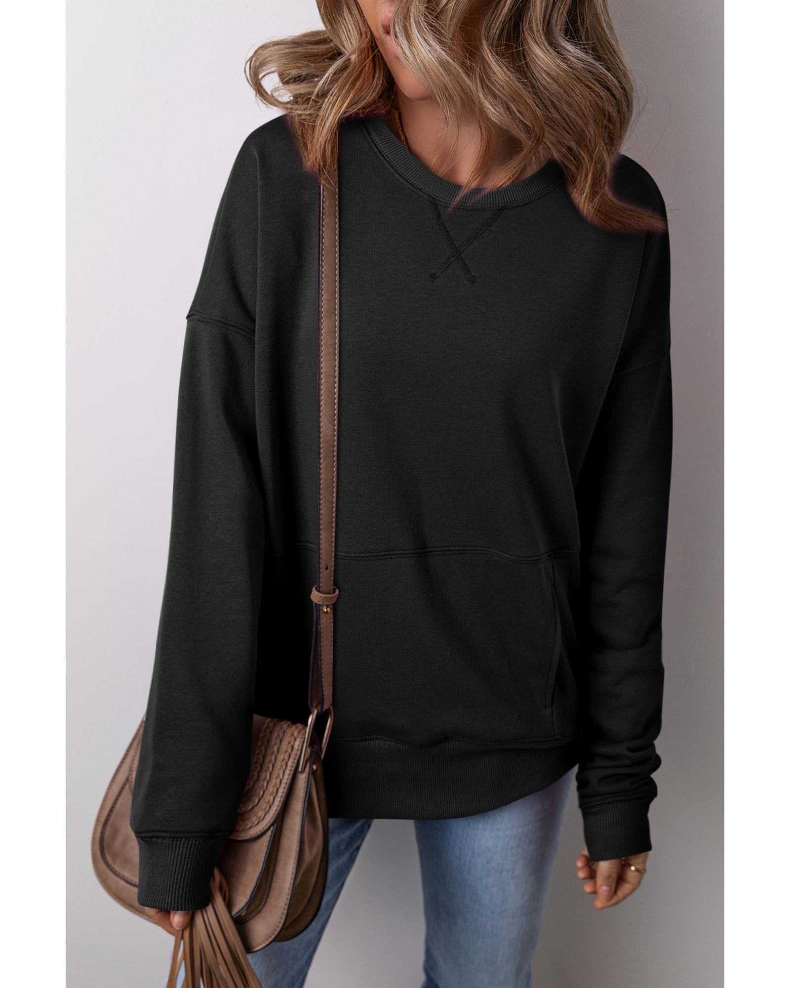 Black Drop Shoulder Crisscross Stitching Pocketed Loose Sweatshirt – S