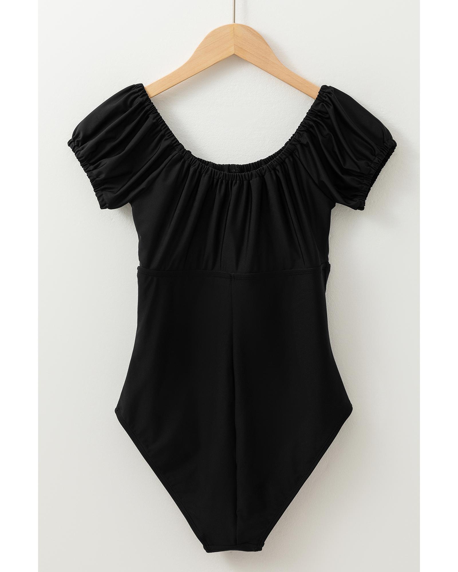 Black Elastic Neckline Short Sleeve One Piece Swimsuit – M