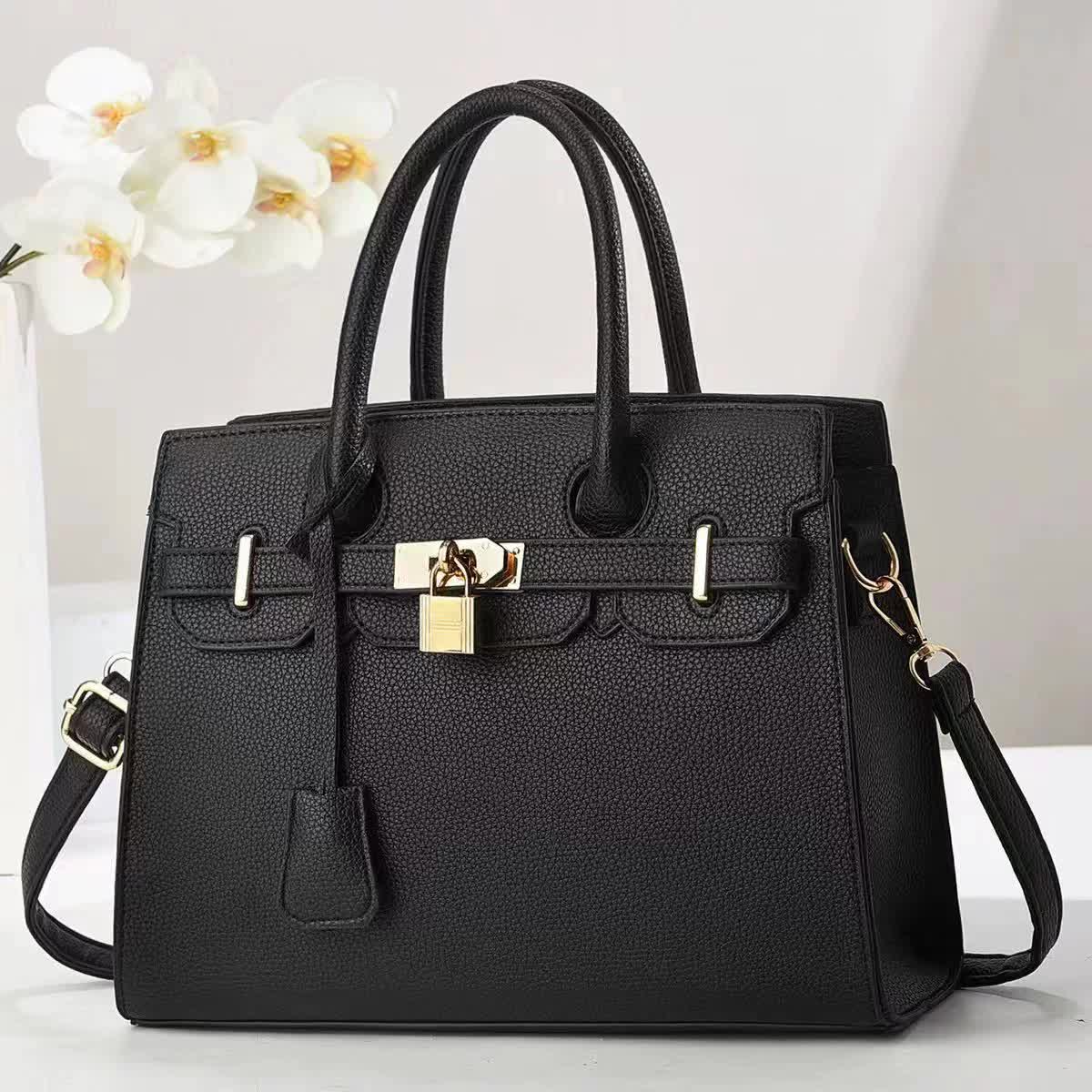 Black Elegant PU Leather Handbag with Lock Decoration – Structured Tote Bag for Women