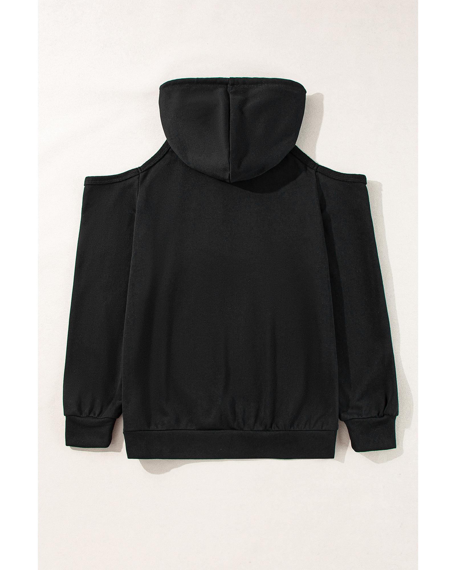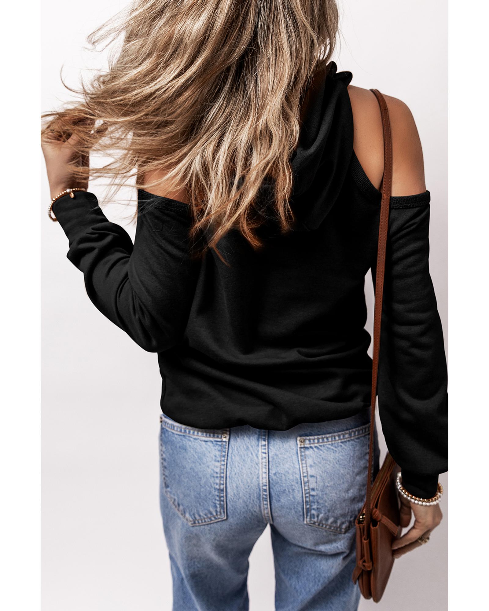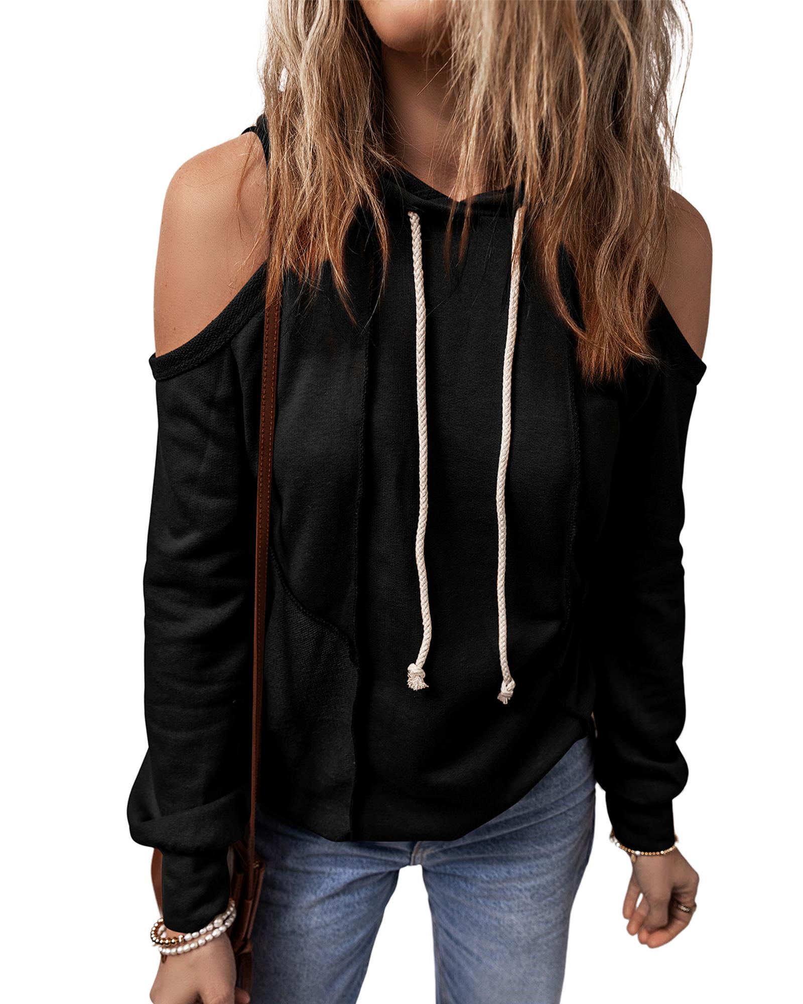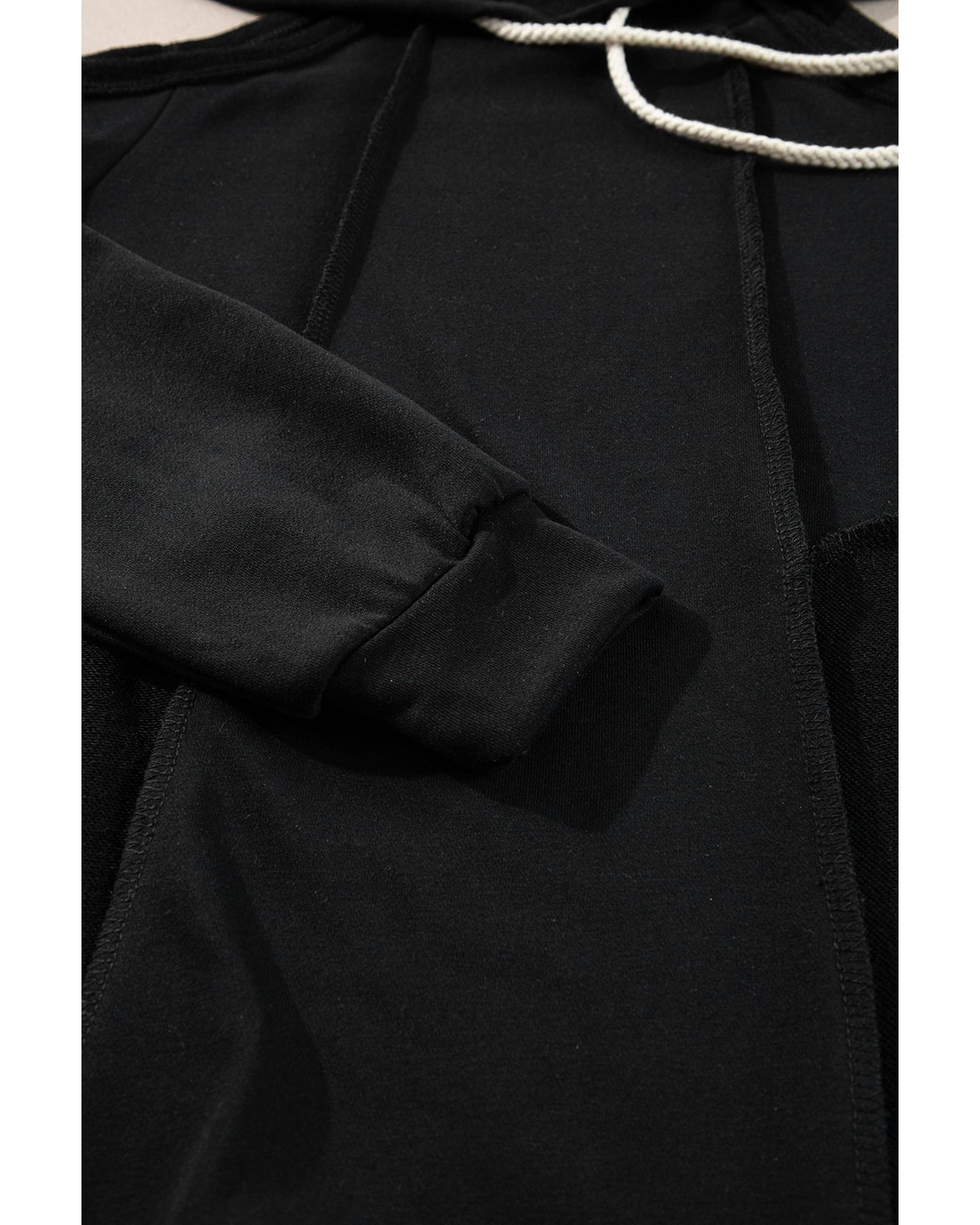 Black Exposed Seam Cold Shoulder Drawstring Hoodie – L