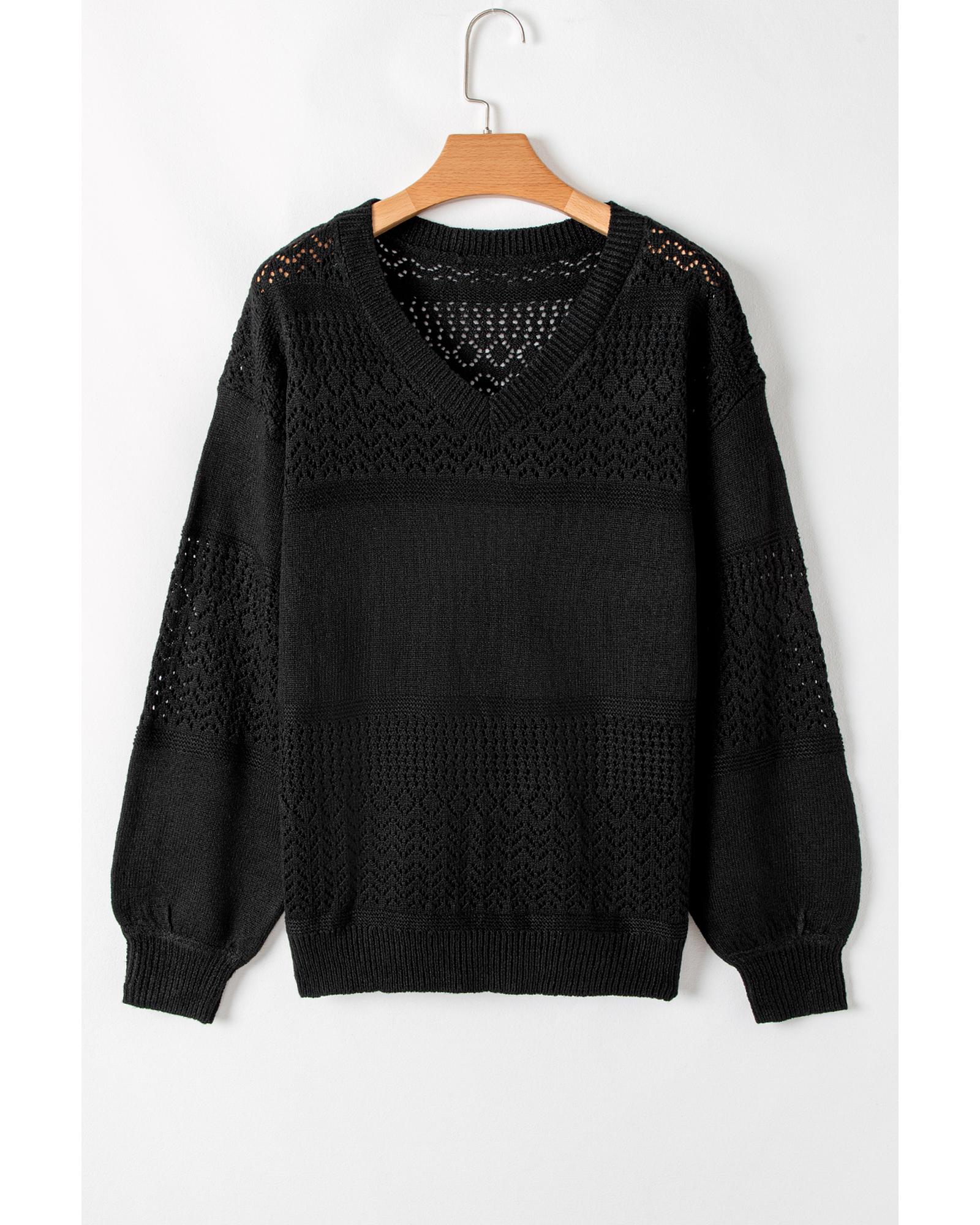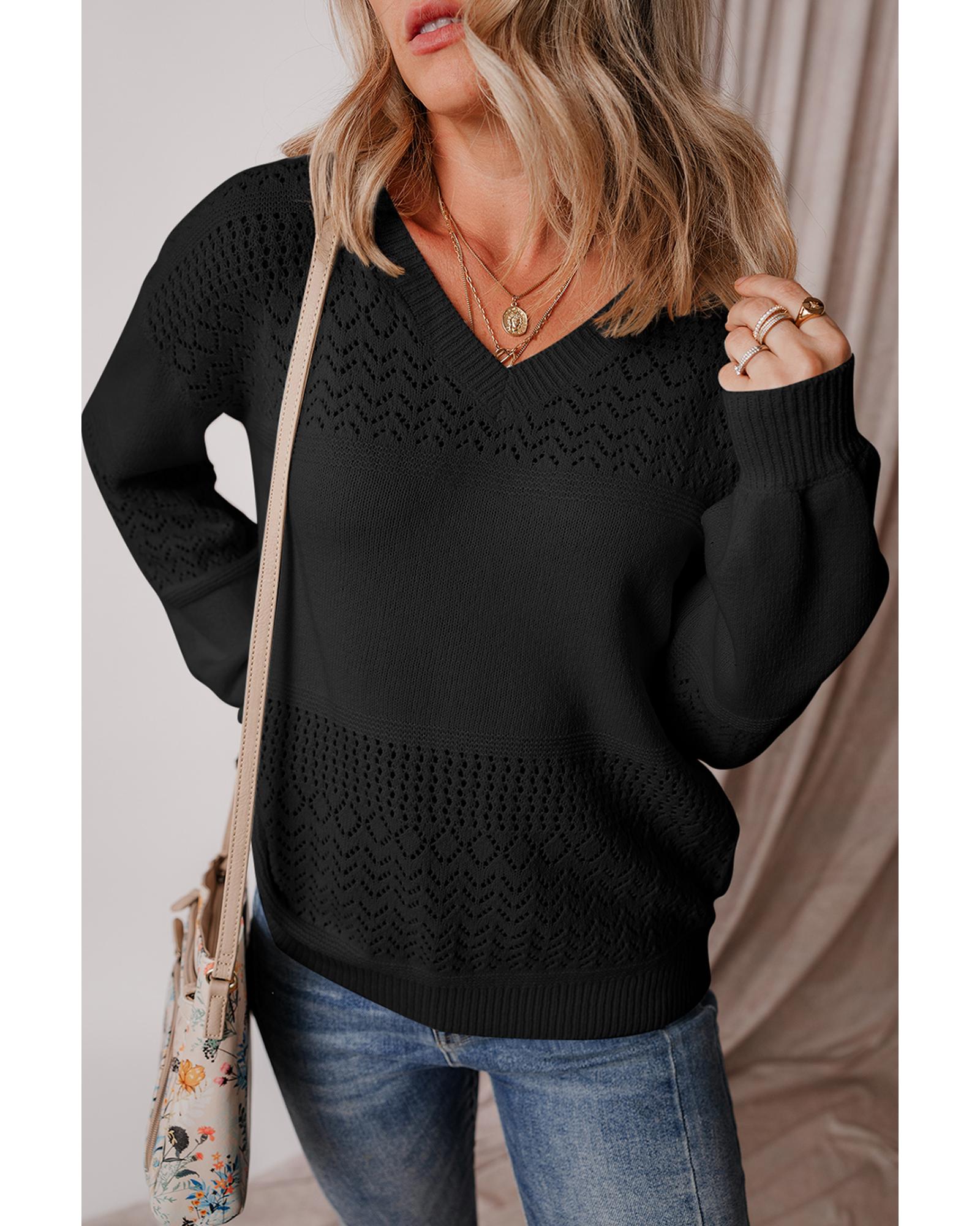 Black Eyelet Pattern Detail V Neck Drop Shoulder Sweater – L