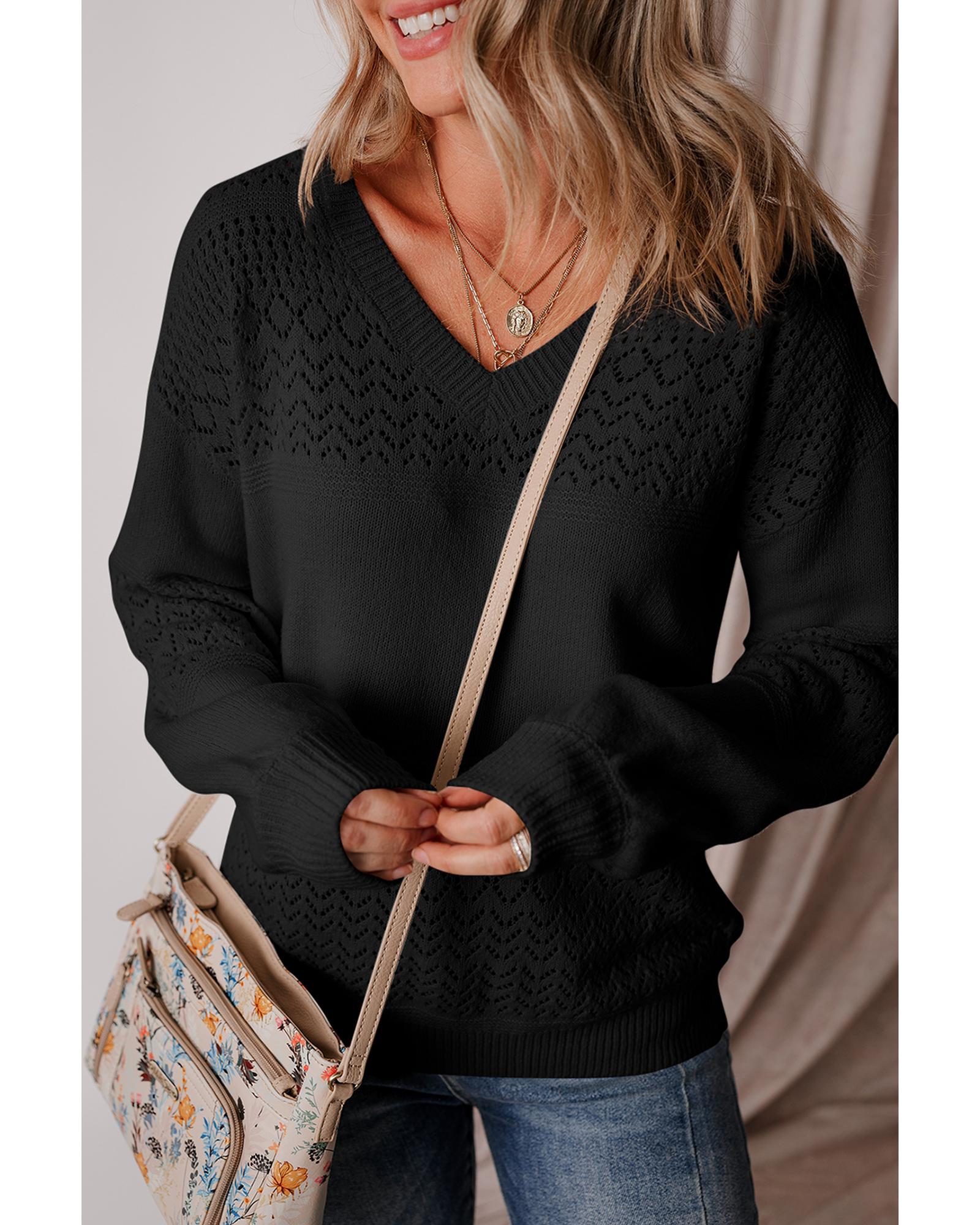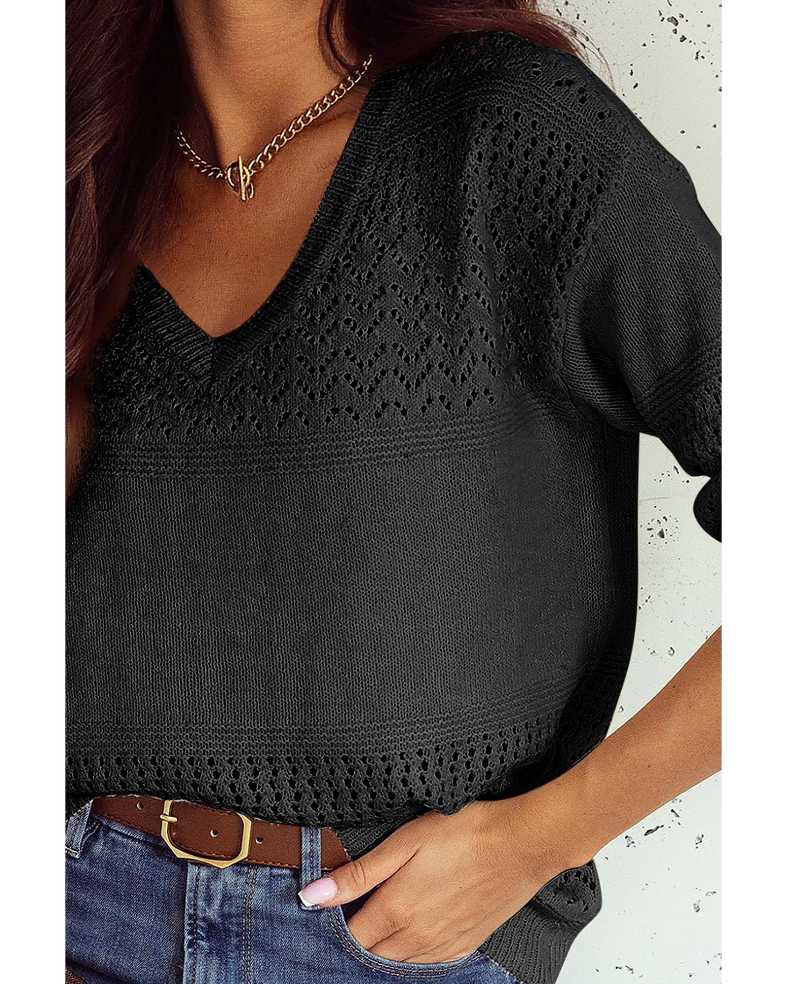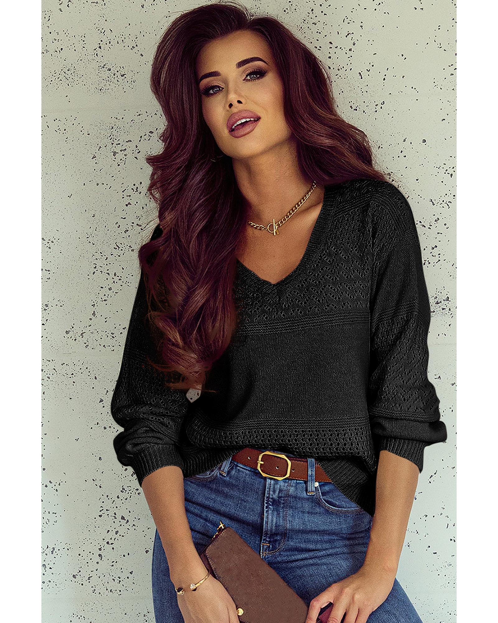 Black Eyelet Pattern Detail V Neck Drop Shoulder Sweater – M