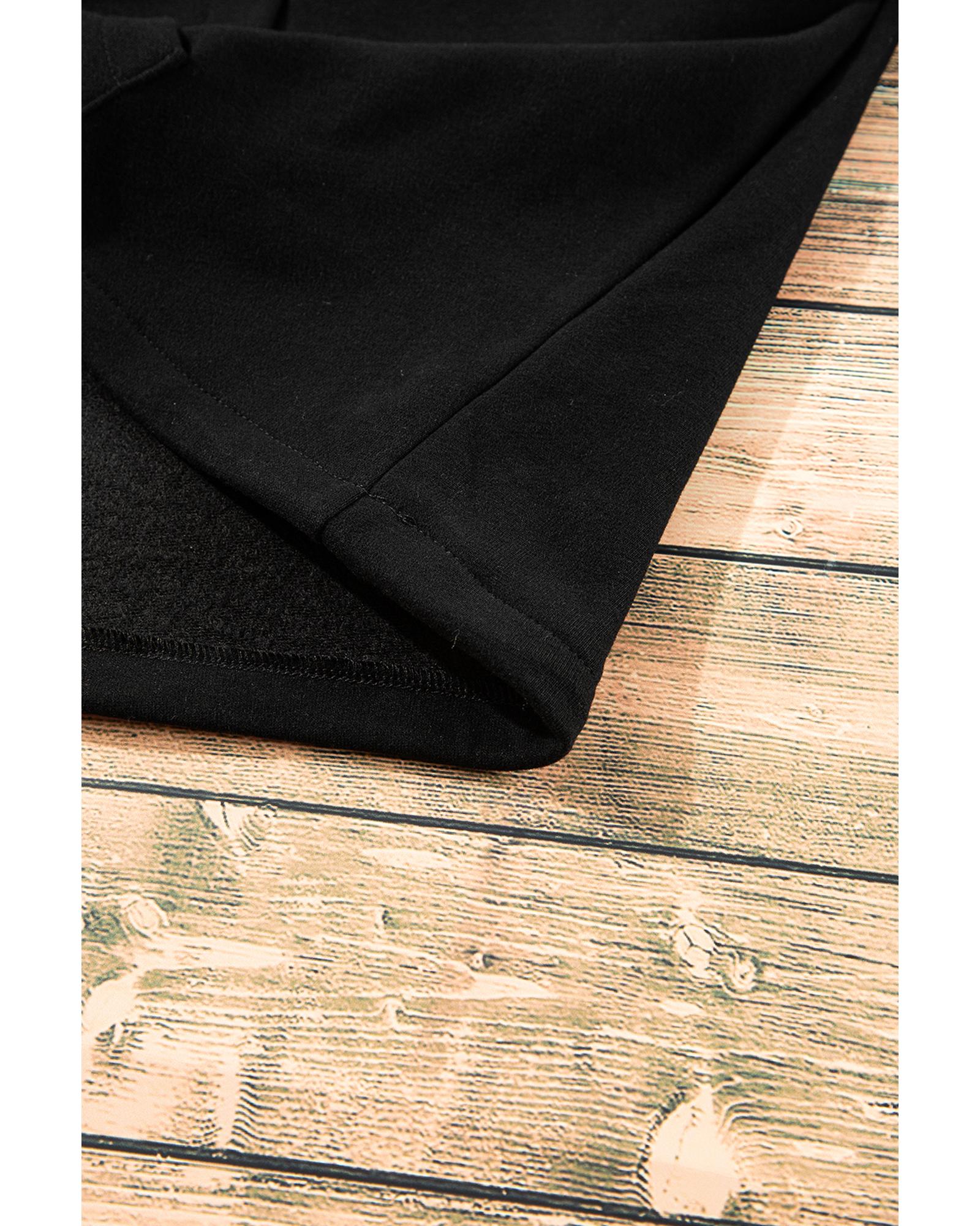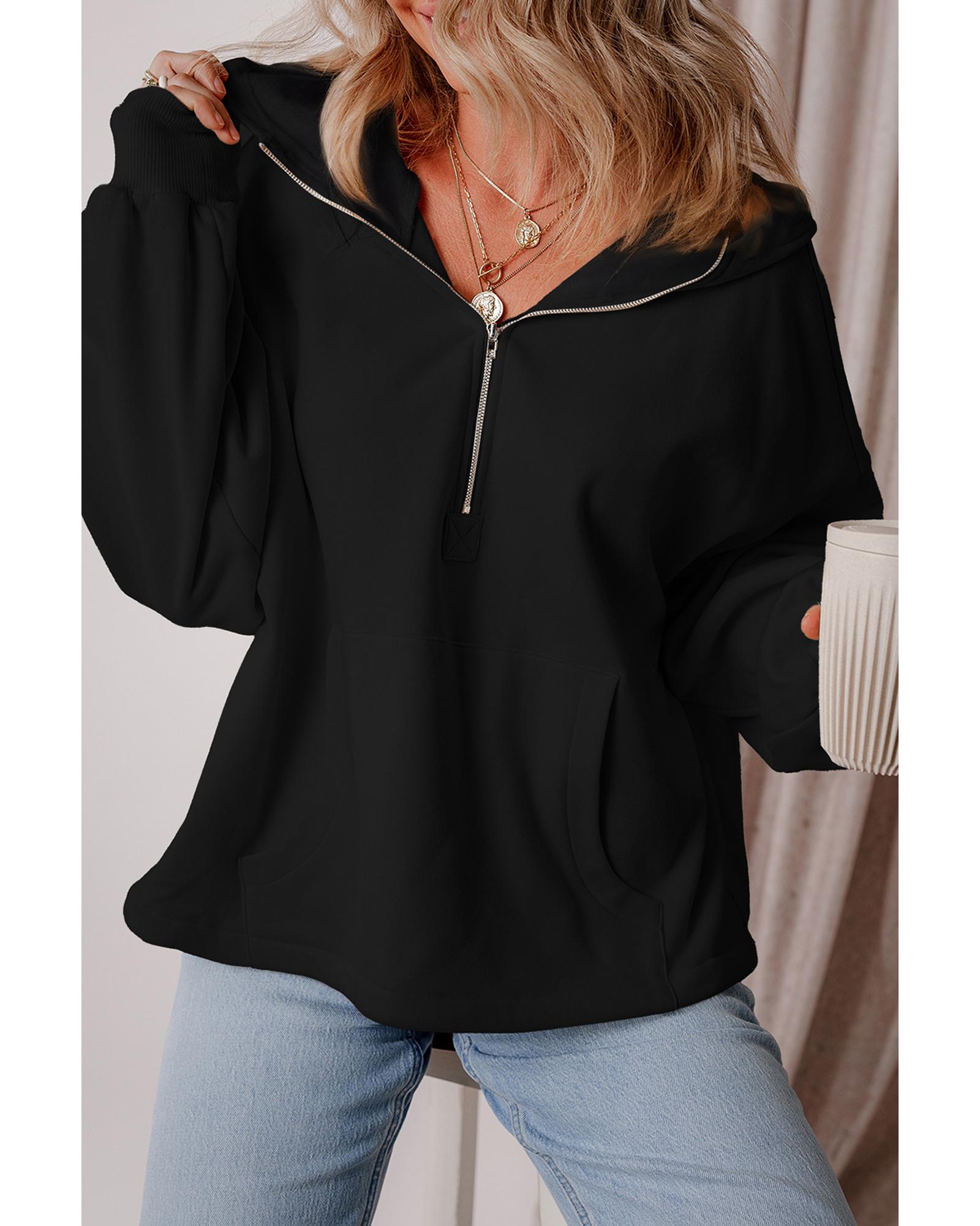- Black Fleece Lined Half Zipper Kangaroo Pockets Loose Hoodie