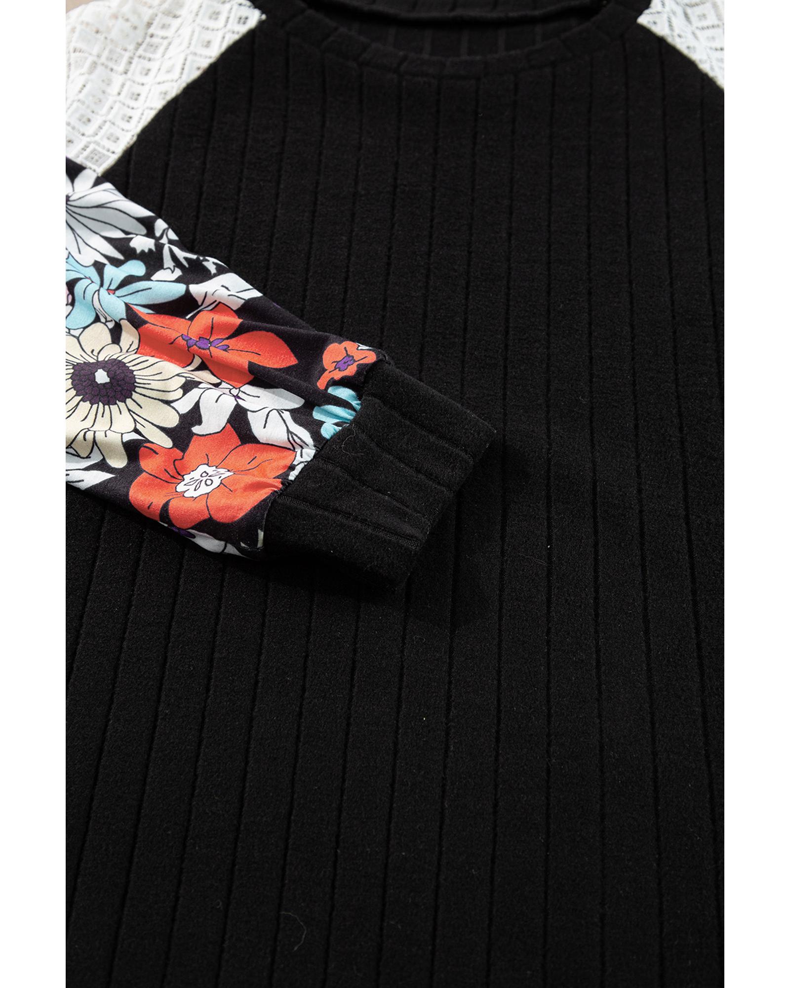 - Black Floral Patchwork Long Sleeve Ribbed Blouse