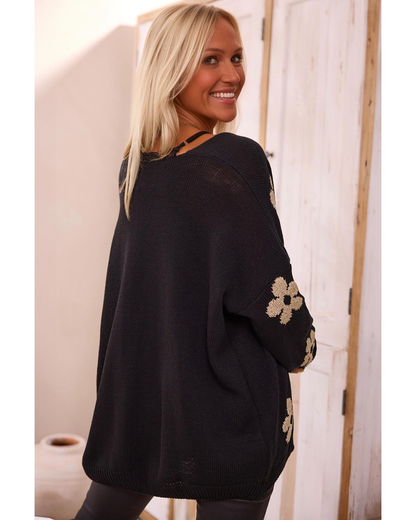 - Black Floral Print Knitted Open Front Loose Cardigan