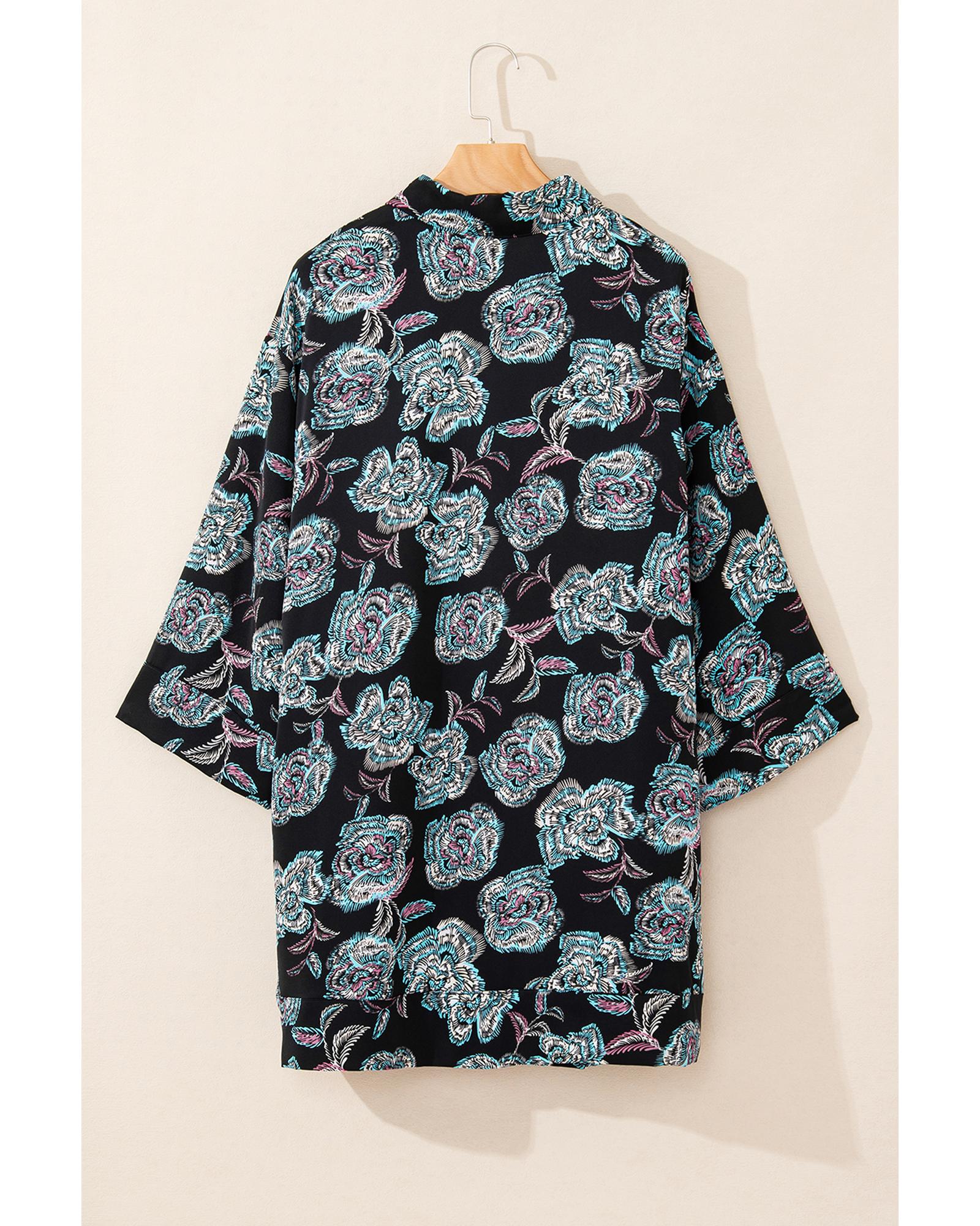 Black Floral Print Lapel Collar Loose Shirt Mini Dress – M
