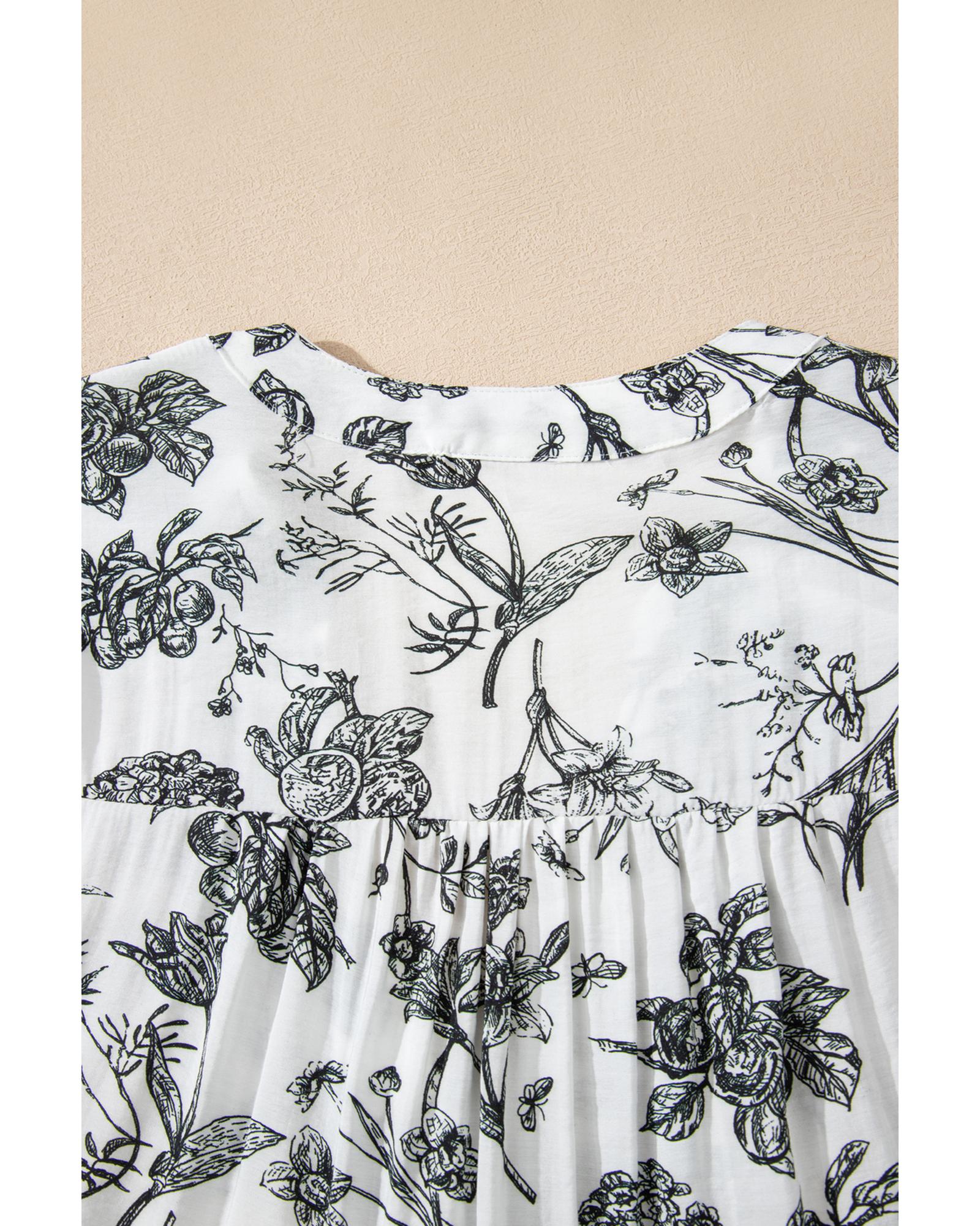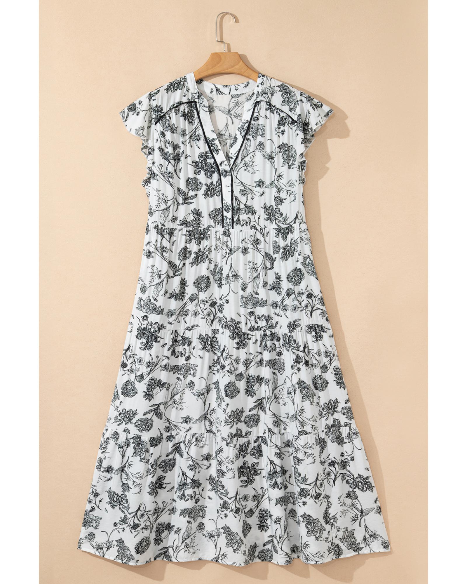 Black Floral Print Piping Trim Notched Neck Ruffle Sleeve Plus Size Long Dress – 2X