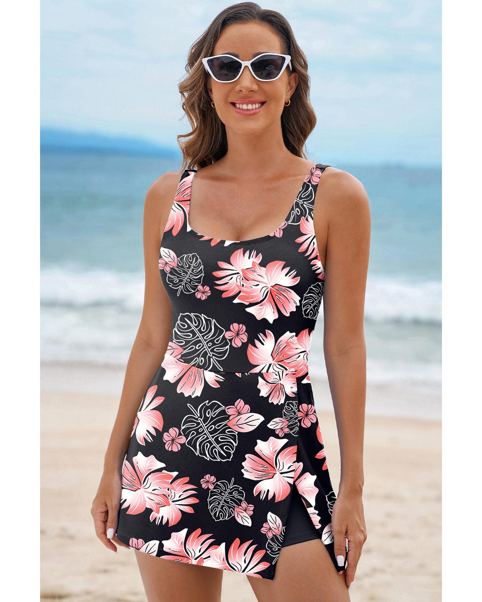 Black Floral Print Twisted Hollowed Back Swim Dress – M